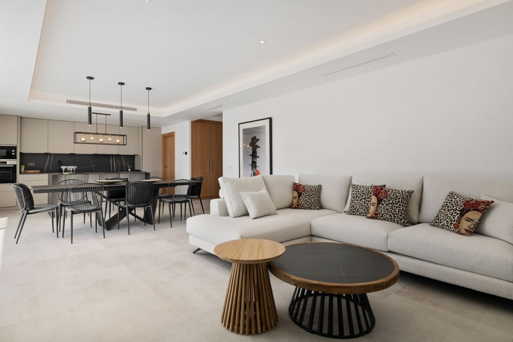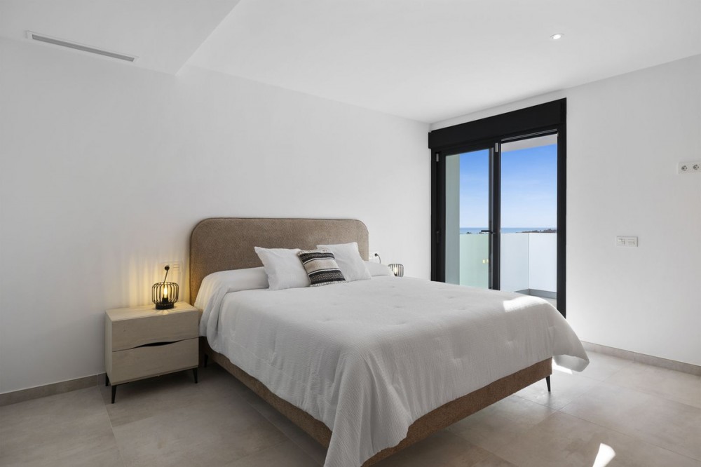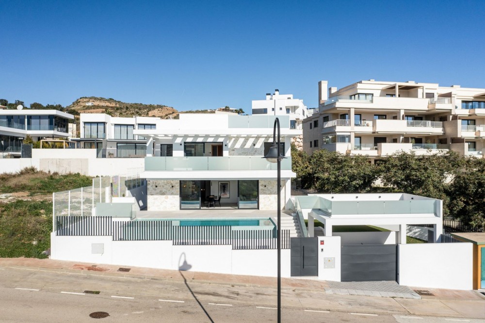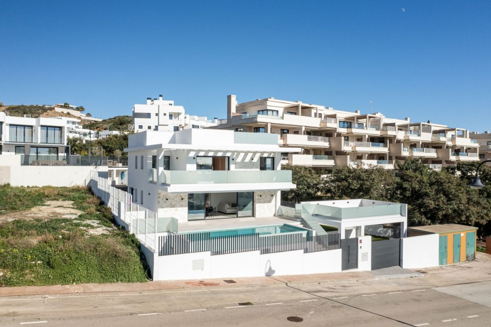 - SPACIOUS CONTEMPORARY VILLA IN TOP LOCATION! This beautiful villa is located only a short walk from the center of La Cala de Mijas, a unique villa just newly built. With its 6 spacious bedrooms with fitted wardrobes and five luxurious bathrooms it is definitely an amazing property which you do not often find that close to the center of La Cala. Upon entering on the ground floor, you will find a beautiful spacious living room with a glass facade so that you have a lot of natural light. A beautiful open kitchen with spacious dining table makes this an area where you literally feel at home. The kitchen is equipped with all necessary built-in Bosch appliances. Next to the kitchen there is a storage room where the washing machine and dryer are, both Bosch as well. From the living room you can walk outside and you immediately have access to the swimming pool with an outdoor shower. Next to the swimming pool there is another 30m2 terrace. There are several electricity and water points on this terrace. From both the living room and the swimming pool you have an amazing view, on one side you will see the mountains and on the other side the ocean. On the same level you find a bedroom and bathroom, and the entire ground floor is equipped with underfloor heating. If you go upstairs, you will find three large bedrooms, all with beautiful fitted wardrobe and an en-suite bathrooms. The two bedrooms at the front of the house have sliding doors that open onto a terrace with once more beautiful views. Like the ground floor is also this floor equipped with underfloor heating. From the top floor you can go to the roof terrace, this exceptionally large terrace has a beautiful sea view. Unique is the basement of the house, because here you find two more bedrooms and a bathroom. And not just that, a huge relaxation area has also been created here, there is enough space to create a gym and a large television room for example. Outside you notice the beautifully landscaped garden that surrounds the house, in which many beautiful materials have been used and very high-quality artificial grass so that the garden is easy to maintain. There are many places around the house where you can relax in silence, completely privately. On the street side there is an entrance gate for the cars, there is room for three cars that can all be parked on private property. If you are looking for a modern, spacious villa close to La Cala center, then this is your chance! A visit is definitely worth it!!
