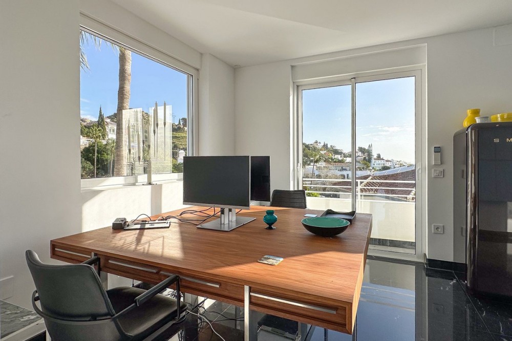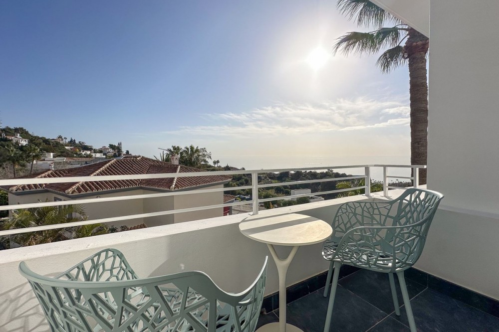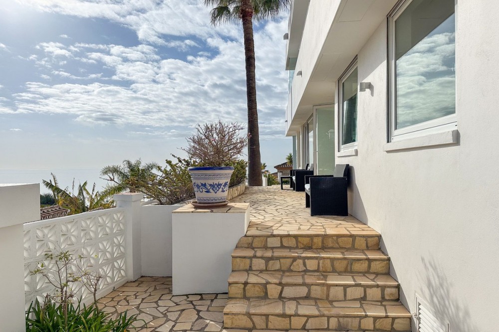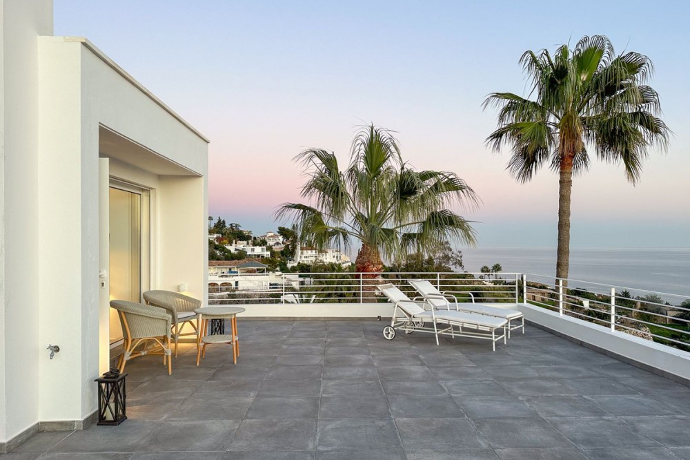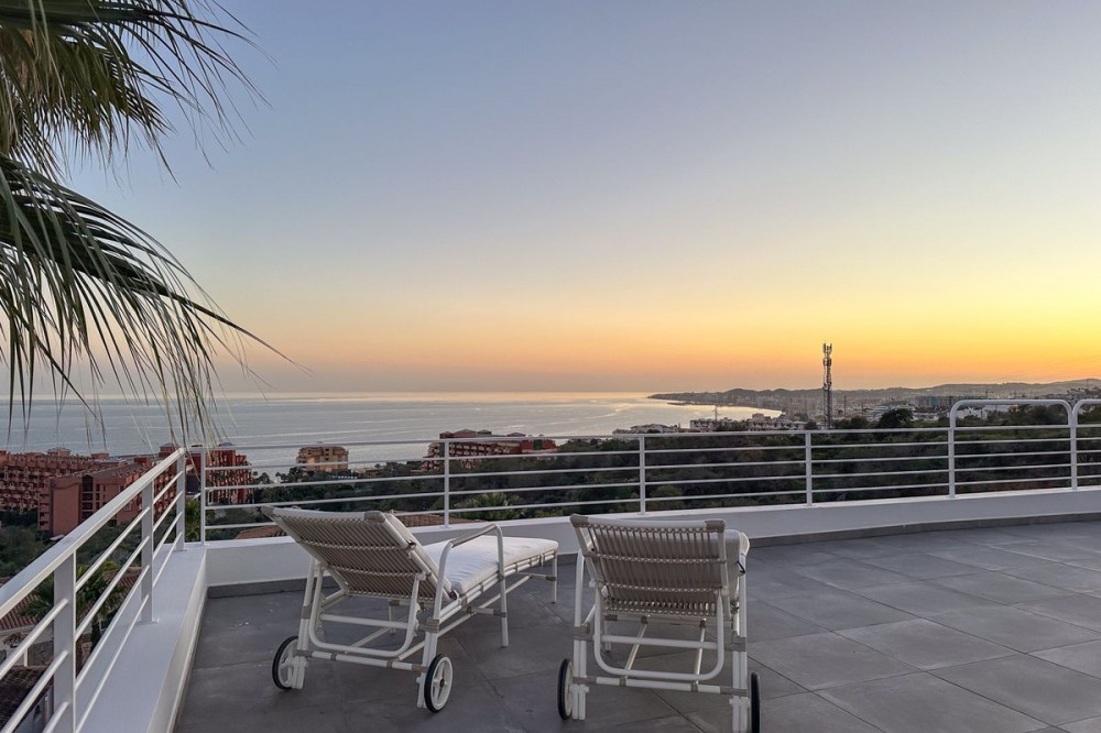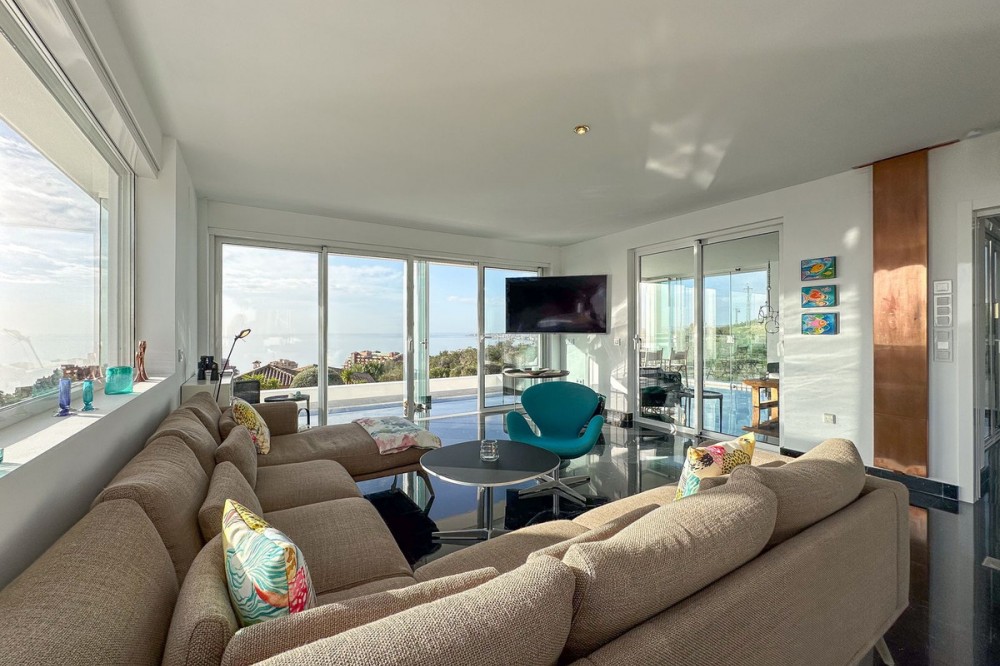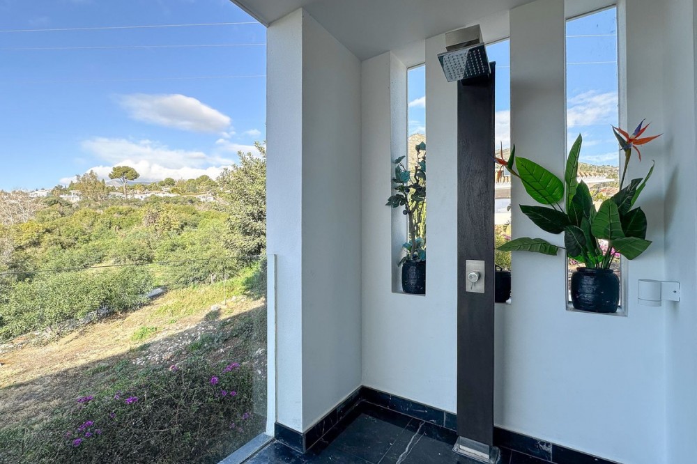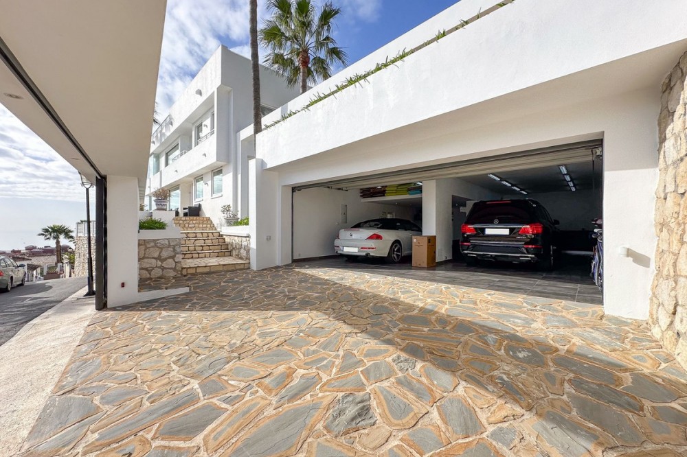 - This exceptional house is a dream come true, where modern design meets natural beauty. With its bright and open atmosphere, combined with sophisticated dark details, the property offers a perfect balance of elegance and comfort. From the large windows, you can enjoy the spectacular sea views stretching out to the horizon, creating a calm and peaceful atmosphere throughout the villa. The house is distributed over three floors, offering plenty of space and flexibility. The ground floor features an open kitchen and living area, where light and space take center stage. Here you’ll also find two bedrooms, each with their own en-suite bathroom – ideal for family or guests. This floor has direct access to a covered terrace with glass curtains, which can be opened to let the fresh breeze flow in. From here, there is further access to a large private terrace with a beautiful pool, surrounded by vegetation, making the ground floor perfect for outdoor living. The first floor contains a spacious living room, a bedroom with a walk-in closet, and a luxurious en-suite bathroom. The walk in closet functions as a "hidden door" to the bathroom. This floor also has direct access to a covered terrace with glass curtains, where you can enjoy both privacy and the incredible views of the sea and Fuengirola. The top floor is an open rooftop terrace with panoramic views, offering the opportunity to enjoy the sun all day long and watch the most beautiful sunsets and sunrises. This is the perfect place to relax and experience a sense of freedom while overlooking the surrounding landscape. The fourth and final bedroom is located in a secluded part of the house for added privacy and luxury. The garage is spacious and can accommodate up to four vehicles. It also functions as a utility room where you'll find both washing machine and dryer. The garage is really something else! Bright and spacious, and will stay dry even under heavy rain. Outside, you’ll find several exclusive features, including outdoor showers and outdoor kitchens – the perfect setup to enjoy long, warm summer evenings in great company. The villa features underfloor heating throughout, ensuring a comfortable and cozy atmosphere all year round, regardless of the season. Additionally, the downstairs living area is enhanced by a stylish fireplace, offering a warm and inviting ambiance, perfect for relaxing during cooler evenings. You'll be able to feel very safe in this villa, as the ground floor is secured with burglar-proof windows throughout as well as strong aluminum burglary-proof blinds. The entire house can be safely secured by electric blinds. The house is located in the attractive and peaceful area of La Capellania, offering both privacy and easy access to a wide range of facilities. Within a short drive, approximately 10 minutes, you’ll find local restaurants, supermarkets, the beach, and sports facilities such as paddle tennis, tennis, fitness centers, and spa. Here, you can enjoy the best of both peace and comfort, while still being close to everything that makes life easy and enjoyable.