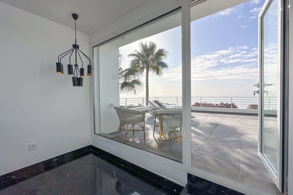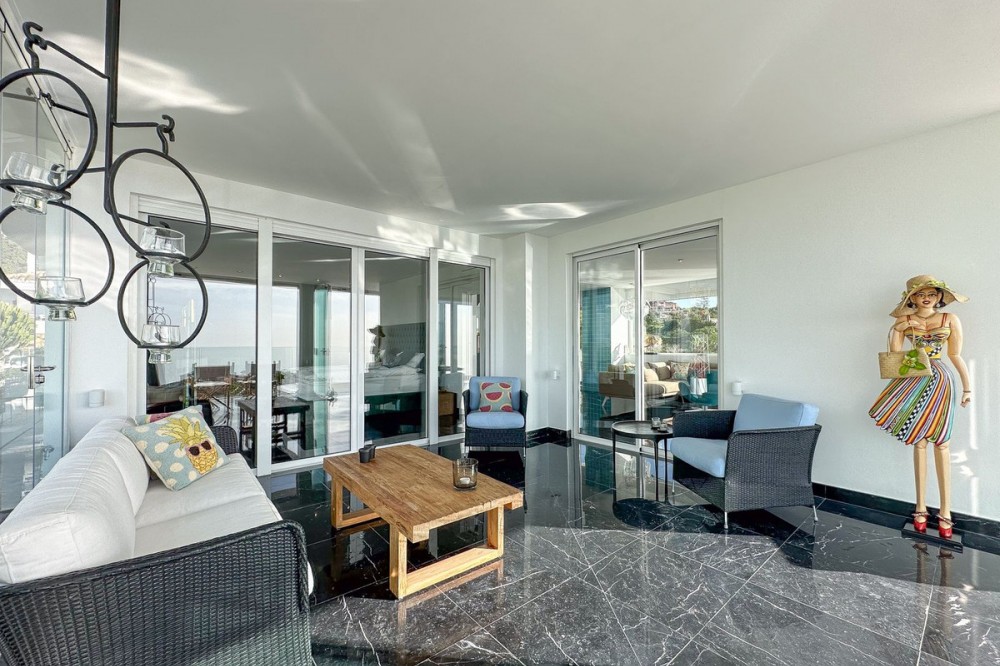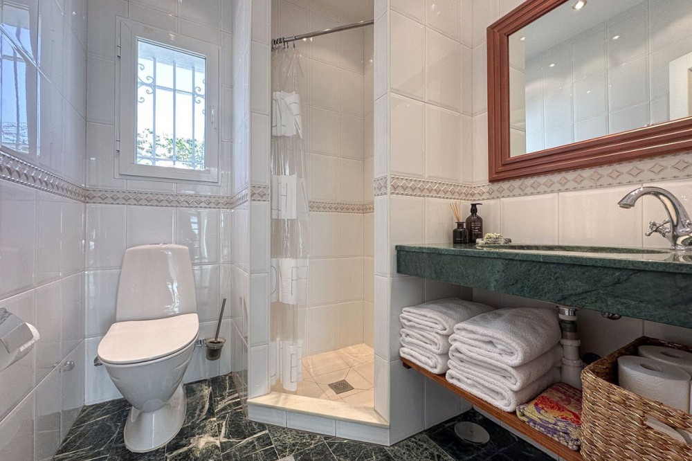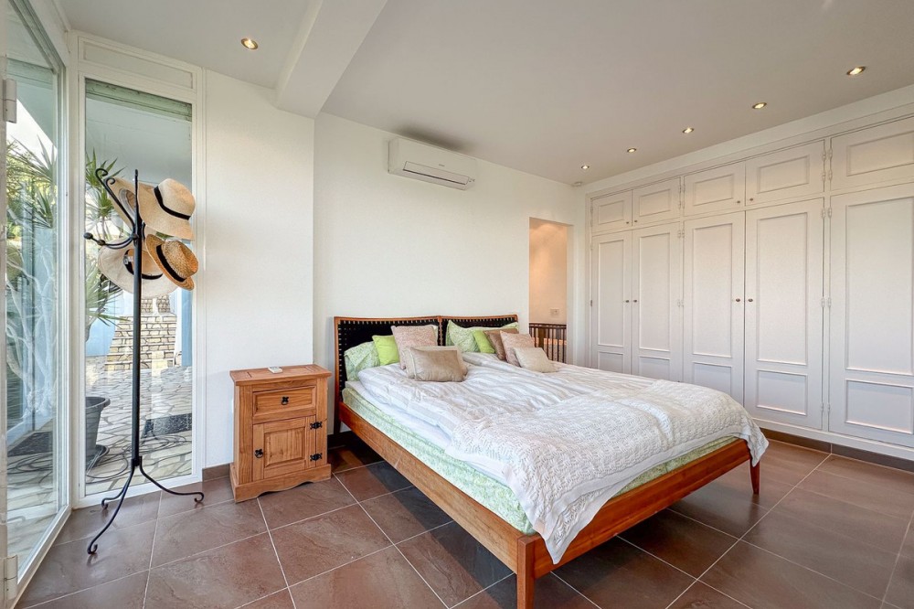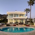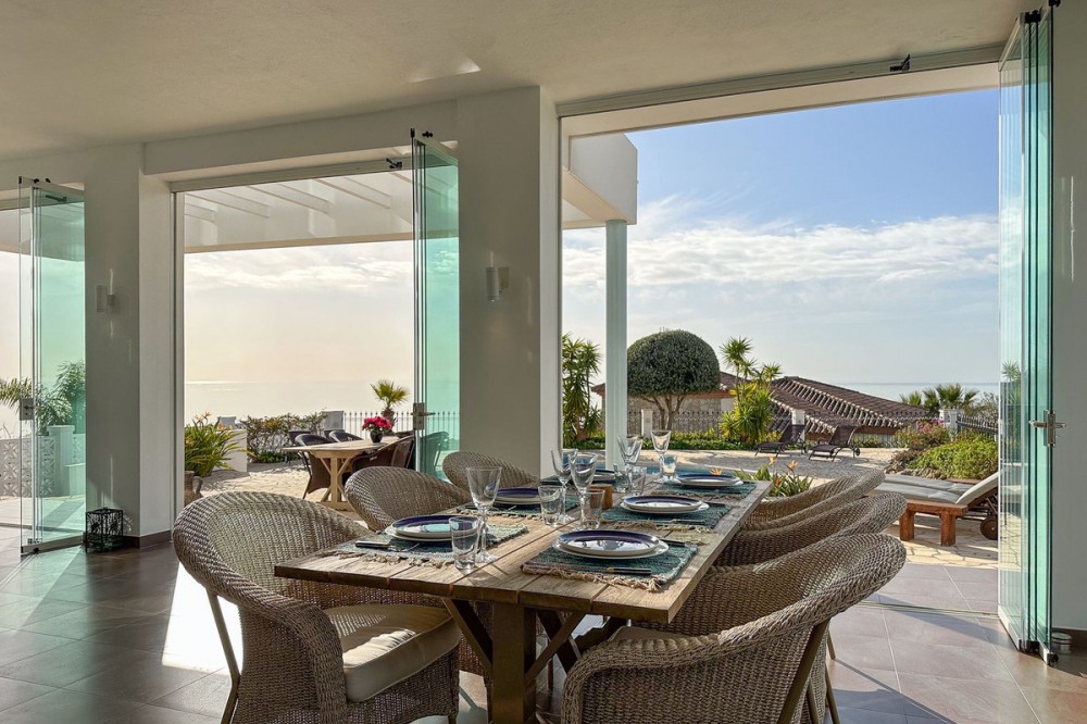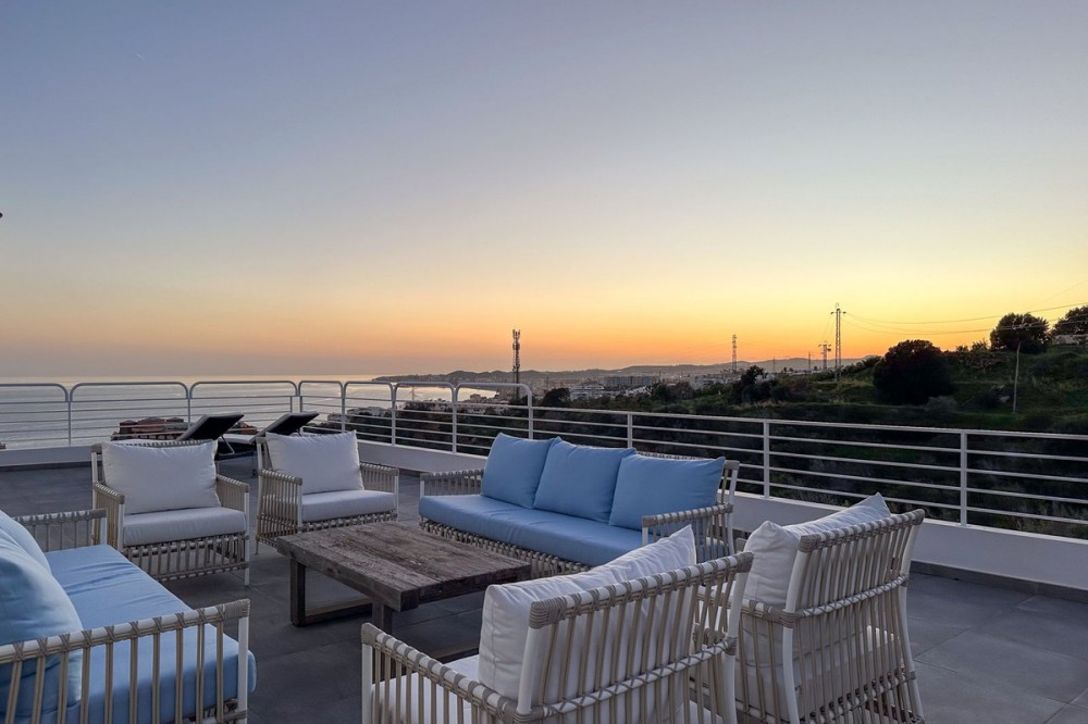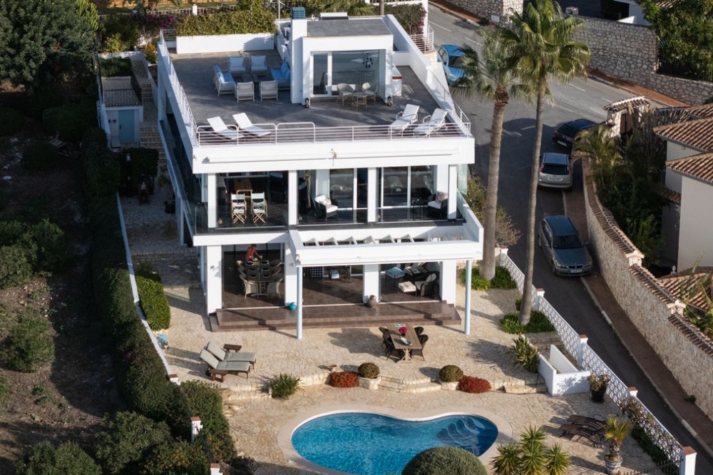- This exceptional house is a dream come true, where modern design meets natural beauty. With its bright and open atmosphere, combined with sophisticated dark details, the property offers a perfect balance of elegance and comfort. From the large windows, you can enjoy the spectacular sea views stretching out to the horizon, creating a calm and peaceful atmosphere throughout the villa. The house is distributed over three floors, offering plenty of space and flexibility. The ground floor features an open kitchen and living area, where light and space take center stage. Here you’ll also find two bedrooms, each with their own en-suite bathroom – ideal for family or guests. This floor has direct access to a covered terrace with glass curtains, which can be opened to let the fresh breeze flow in. From here, there is further access to a large private terrace with a beautiful pool, surrounded by vegetation, making the ground floor perfect for outdoor living. The first floor contains a spacious living room, a bedroom with a walk-in closet, and a luxurious en-suite bathroom. The walk in closet functions as a "hidden door" to the bathroom. This floor also has direct access to a covered terrace with glass curtains, where you can enjoy both privacy and the incredible views of the sea and Fuengirola. The top floor is an open rooftop terrace with panoramic views, offering the opportunity to enjoy the sun all day long and watch the most beautiful sunsets and sunrises. This is the perfect place to relax and experience a sense of freedom while overlooking the surrounding landscape. The fourth and final bedroom is located in a secluded part of the house for added privacy and luxury. The garage is spacious and can accommodate up to four vehicles. It also functions as a utility room where you'll find both washing machine and dryer. The garage is really something else! Bright and spacious, and will stay dry even under heavy rain. Outside, you’ll find several exclusive features, including outdoor showers and outdoor kitchens – the perfect setup to enjoy long, warm summer evenings in great company. The villa features underfloor heating throughout, ensuring a comfortable and cozy atmosphere all year round, regardless of the season. Additionally, the downstairs living area is enhanced by a stylish fireplace, offering a warm and inviting ambiance, perfect for relaxing during cooler evenings. You'll be able to feel very safe in this villa, as the ground floor is secured with burglar-proof windows throughout as well as strong aluminum burglary-proof blinds. The entire house can be safely secured by electric blinds. The house is located in the attractive and peaceful area of La Capellania, offering both privacy and easy access to a wide range of facilities. Within a short drive, approximately 10 minutes, you’ll find local restaurants, supermarkets, the beach, and sports facilities such as paddle tennis, tennis, fitness centers, and spa. Here, you can enjoy the best of both peace and comfort, while still being close to everything that makes life easy and enjoyable.