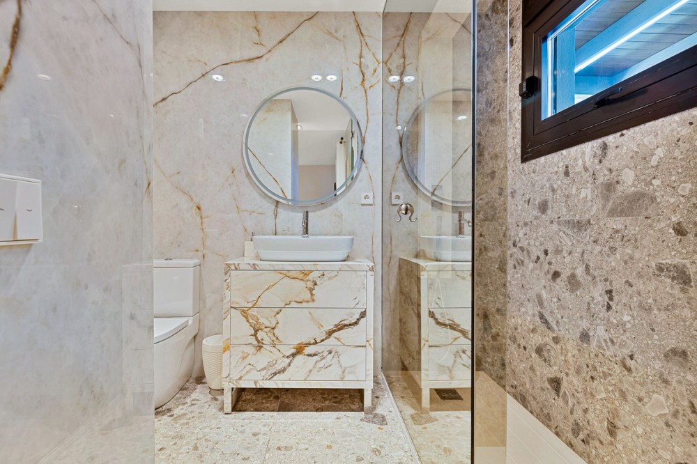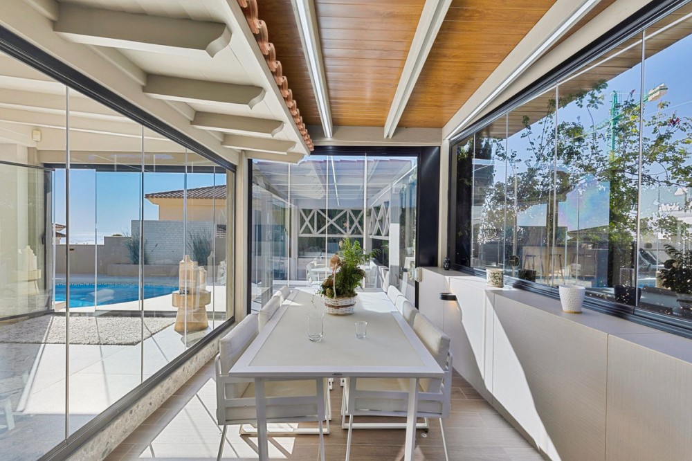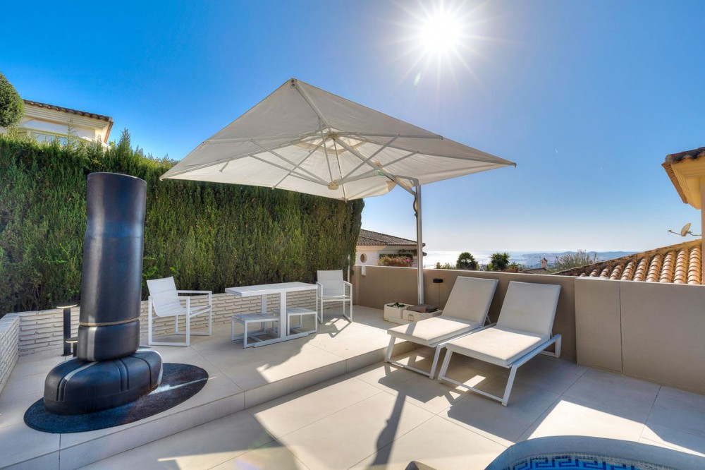 - ✨ 235 m² built + 80 m² enclosed terrace | 591 m² plot | Private pool | Views of the Bay of Fuengirola ✨ Discover this spectacular detached villa, a true gem of design and comfort in the exclusive Higuerón area of Benalmádena. Completely renovated in 2017, this property combines spacious interiors, high-quality finishes, and a privileged location, just 1 km from Carvajal Beach. ???? Villa Layout: Main Floor: ✅ Modern open-plan kitchen, fully equipped. ✅ Spacious living room with a built-in fireplace. ✅ Office (which can be converted into a third bedroom). ✅ Guest toilet. ✅ Bedroom with an en-suite bathroom. Upper Floor: ✅ Master suite of 56 m² with a stylish en-suite bathroom and mirror-effect ceiling. ???? Outdoor Spaces: ✔ Private pool with shower. ✔ Chill-out area with pergola, sun loungers, and a decorative fountain. ✔ Enclosed terrace with Lumon glass, perfect for year-round use. ✔ Barbecue area with toilet and storage room. ✔ Closed garage and covered parking area. ???? Extras & Features: ✔ Central air conditioning + individual units in bedrooms. ✔ 22 solar panels for maximum energy efficiency. ✔ 6,000-liter water storage tank. ???? Prime Location: ???? Situated in Higuerón, one of the most sought-after areas on the Costa del Sol. ???? Just minutes from the Higuerón Shopping Center (Carrefour, pharmacy, restaurants, and shops). ???? Only 1 km from Carvajal Beach. ???? Quick access to the A7, excellent connections to Málaga and Marbella. ???? Quiet and secure area, ideal for living or investment. ???? Costs: ???? IBI (Property Tax): €870/year. ???? Community Fees: €92,5/month. ???? Contact us for more information and a private viewing! In compliance with Decree 218/2005, of October 11, which regulates consumer information in property sales and rentals in Andalusia, we inform clients that notary fees, registry fees, I.T.P., financial costs, and other purchase-related expenses are not included in the price. The information provided in this advertisement is for guidance only, is non-binding, and has no contractual validity.