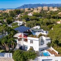 - Unique eight bedroom south facing villa, in a tranquil area of Elviria, Marbella. Located close to the beach, schools and local amenities, this fantastic property is also a successful operating Bed & Breakfast. The property consists of the main house, two apartments with independent access and an additional two bedrooms with access from the garden. The house is equipped with everything you would need for year-round living or holiday rentals including a heated swimming pool, golf putting green, outdoor sauna, and BBQ area. The terrace and solarium boast stunning sea views. Other features include hot and cold air conditioning, private parking space, storage area and solar panels that supply the electricity to run the whole property, as well as a back-up generator.