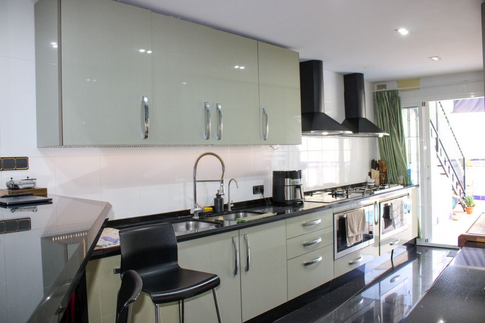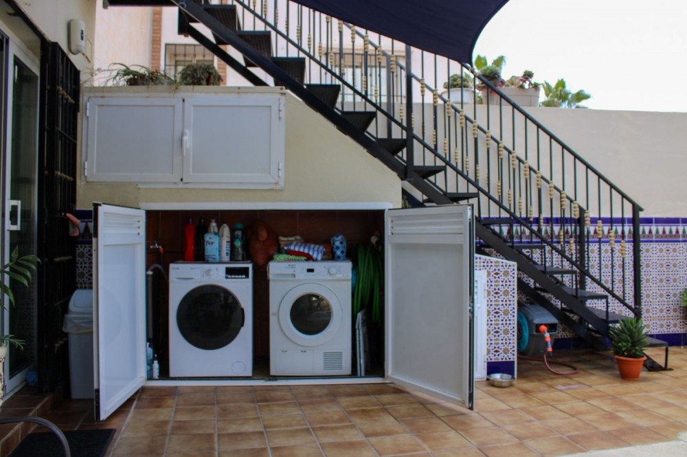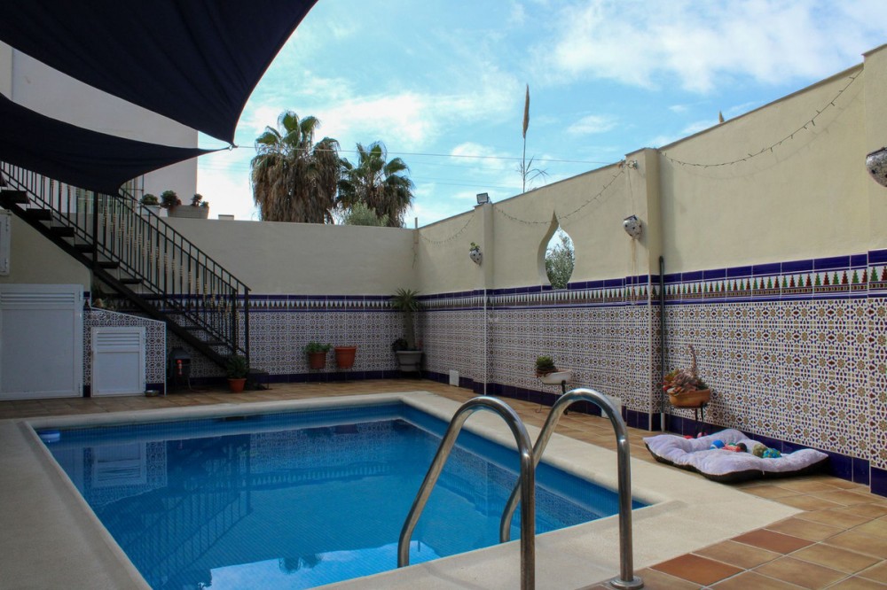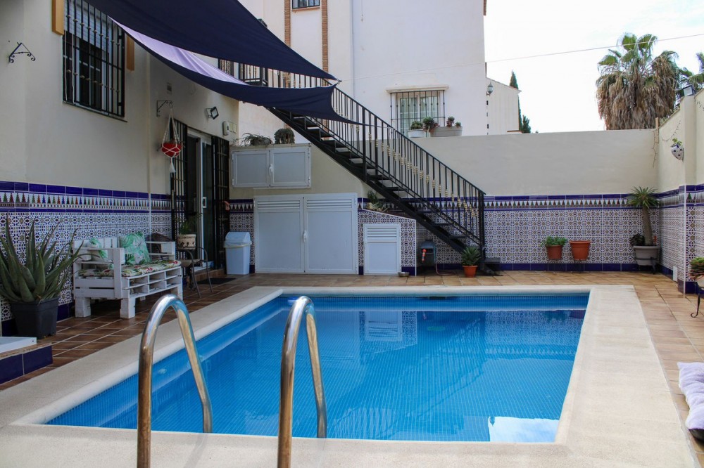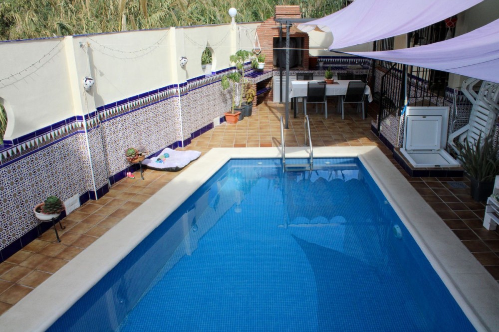 - Spacious Exclusive pool villa in La Noria, Nerja. Welcome to this spacious villa on three levels, 4 bedrooms, 3 bathrooms and 1 toilet. Private pool with large terrace and private parking, located in a cul-de-sac with no through traffic. The nearest large supermarket is 3 minutes by car, or a quarter of a walk. The entrance floor welcomes us with a spacious hall, which connects the entire house. Directly to the right is a large living room with dining area, where the whole family can fit. On this floor there is also a toilet, as well as a living room that was previously the house's kitchen. This room can be restored to a kitchen, as all water connections are still there. We go down the stairs with the beautifully decorated wrought iron railing, to three bedrooms and two bathrooms. One of the bedrooms has its own bathroom and there is also access to the house's natural meeting place, the large terrace with private pool. There is also a fully equipped modern kitchen, as well as a washing machine and dryer. The terrace can also be accessed from the private parking, which is located at the entrance to the house. We continue down to the basement, where we find a large bedroom with jacuzzi and shower. There is also a good-sized storage room. This house must be seen, plenty of space for the large family. Malaga airport takes just under 45 minutes by car, but there is also regular bus service from Nerja. The renowned Baviera golf course is only 15 minutes by car from your new home. In winter you only have an hour and a half drive to Granada with skiing in Sierra Nevada, the best of both worlds.