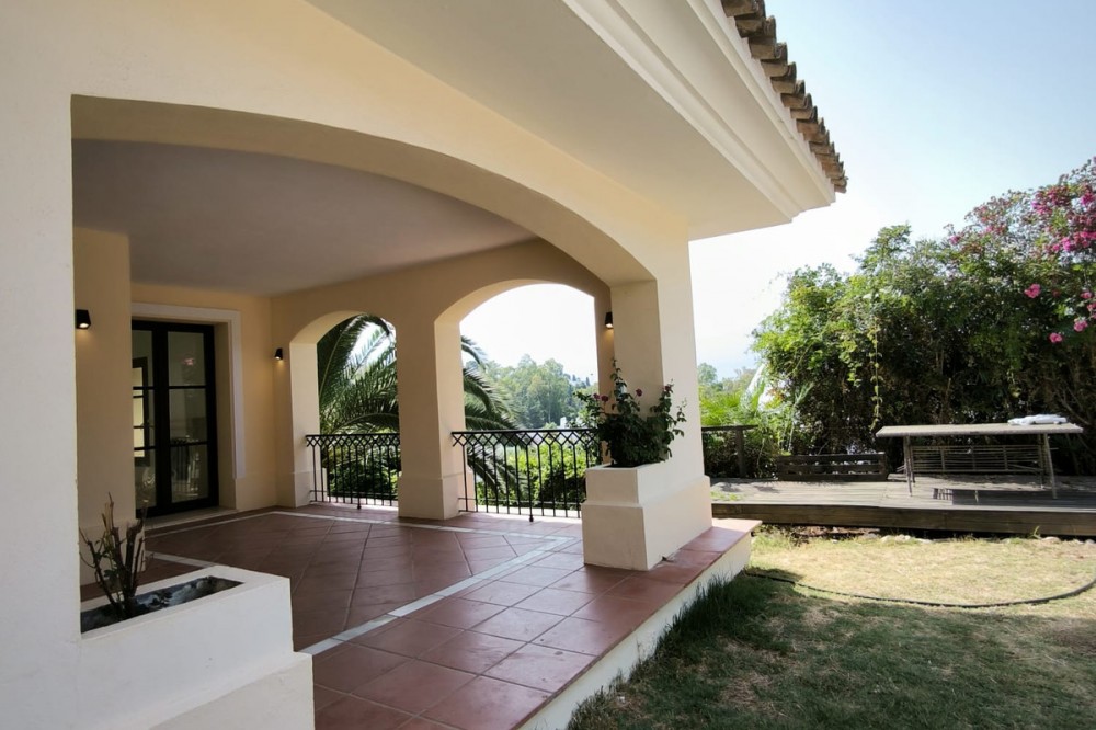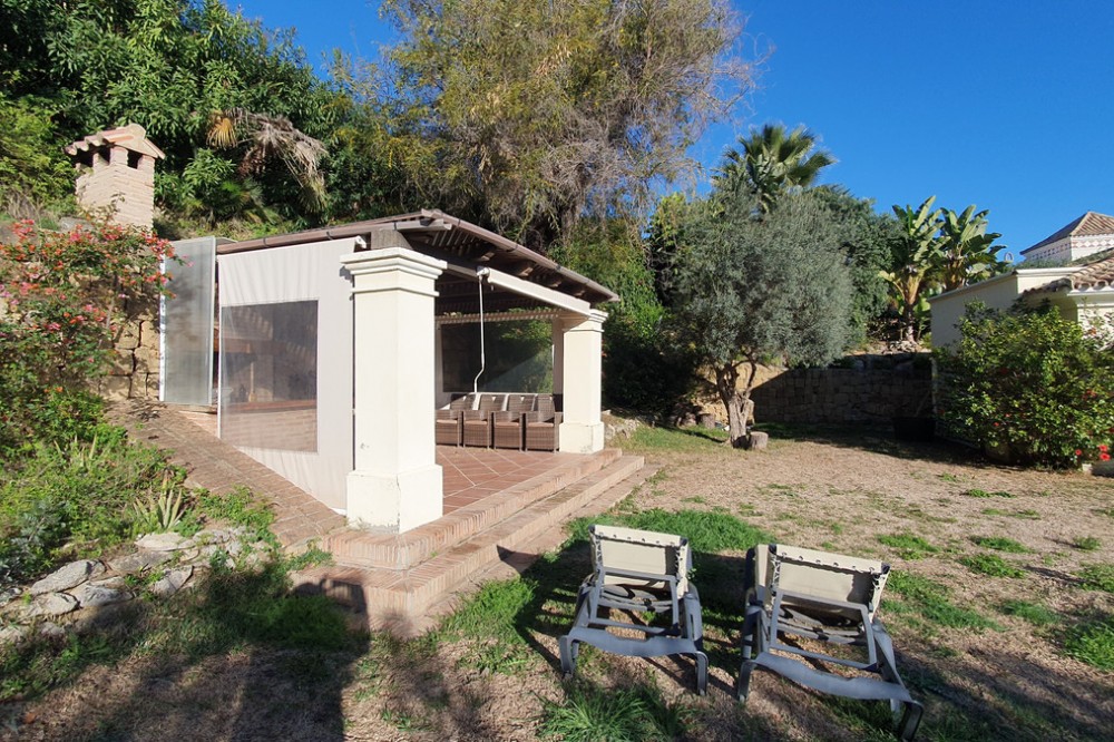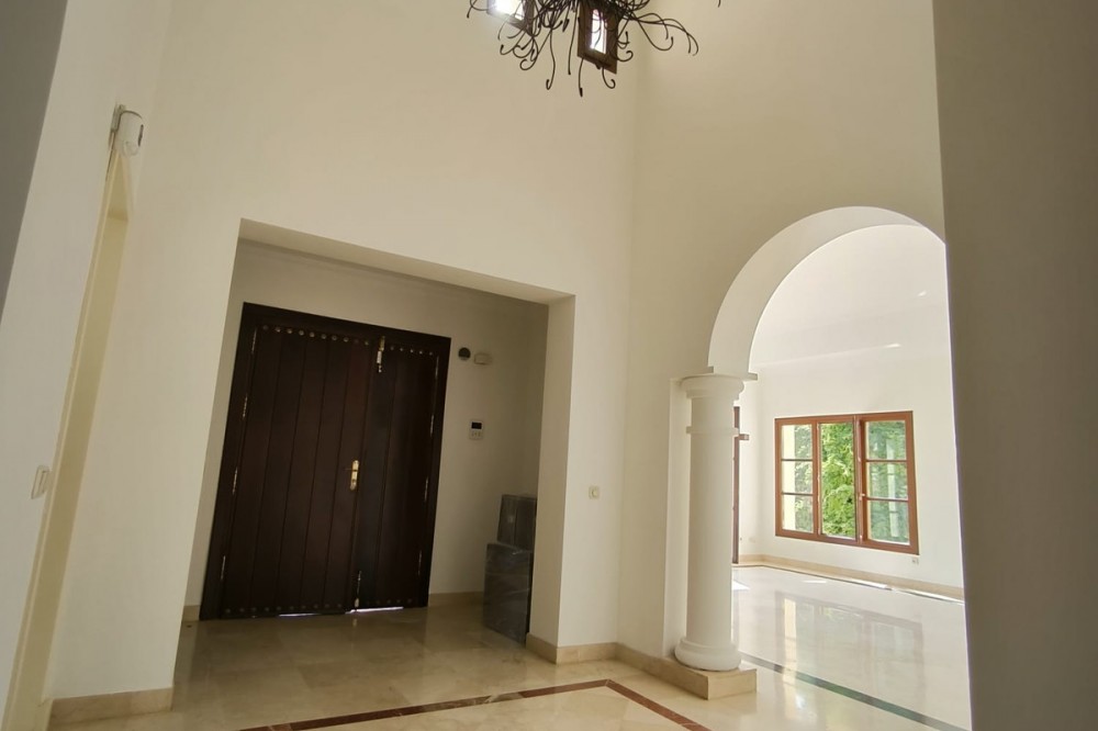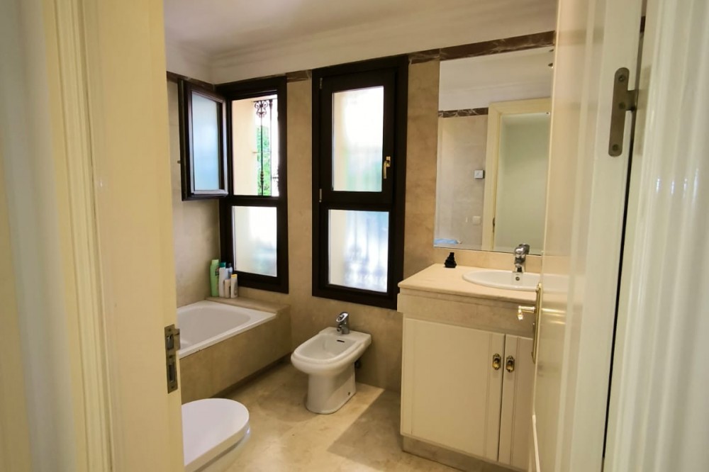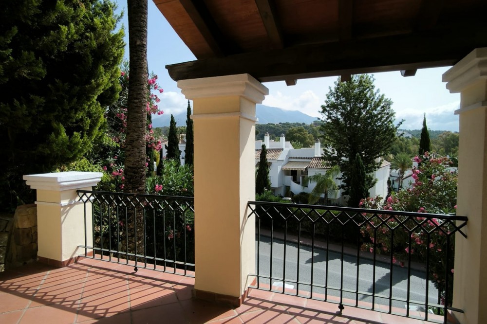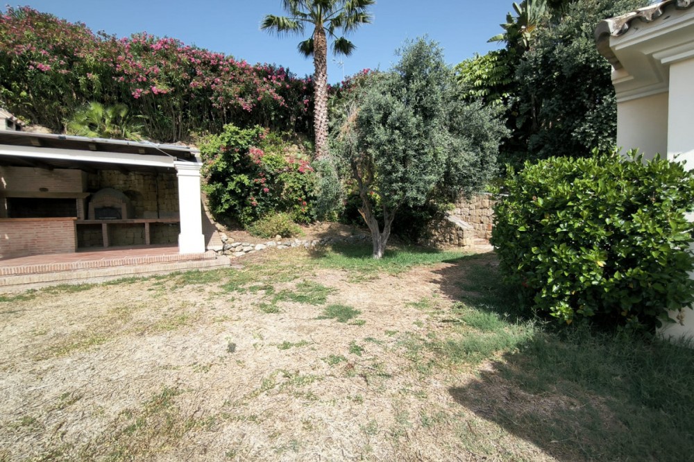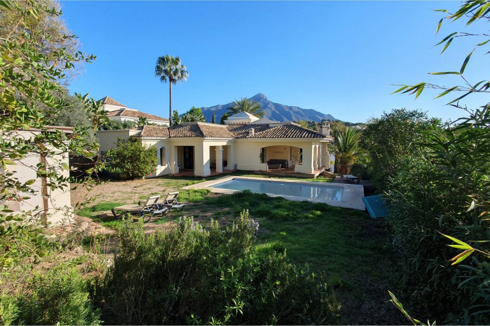 • This classic-style house is located in a group of villas with private access in the heart of the Golf Valley in Nueva Andalucía. The villa is distributed on two large floors. The main entrance gives access to a large living room with very bright fireplace from which you can enjoy wonderful panoramic views of La Concha. The living-dining room has direct access to the garden, the pool and an extensive garden with a barbecue area that allows you to enjoy the maximum leisure time outdoors. On this same floor next to the kitchen there is a hall that gives access to a bedroom with en-suite bathroom and dressing room, a second bedroom, a full bathroom and a courtroom. Direct access to the garden and orientation maximize light entry on this floor. The basement floor also has direct access to the garden from its 2 bedrooms, very bright, share a large bathroom, on this floor there is also a room enabled as lavender and a large room that can be arranged for cinema, gym, etc. The house has 2 independent garages. One of them can be arranged for multipurpose room. A villa with great potential in the heart of Nueva Andalucía.