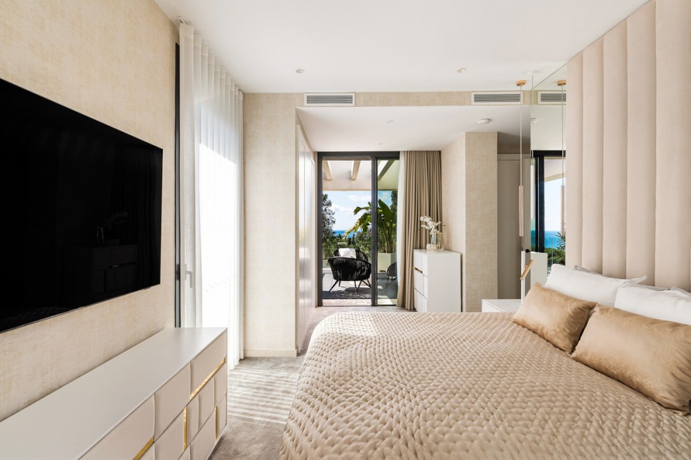 - Located in the prestigious area of Sierra Blanca, this modern villa offers a prime setting just 1.8 km from the Golden Mile’s beaches. Completed in 2022, the property combines exceptional design with the highest quality finishes, delivering sea views from every level and true luxury living in one of Marbella’s most sought-after neighbourhoods. From the moment you enter, the attention to detail is clear. A bespoke modern kitchen with fully integrated Miele appliances connects seamlessly to the open-plan living and dining area, flowing directly onto the expansive terrace, pool, and gardens. Thanks to its south to west orientation and floor-to-ceiling windows, the villa is bathed in natural light throughout the day. Only the finest materials have been used, including Porcelanosa tile flooring inside and out, triple-glazed Cortizo windows, Porcelanosa bathroom fittings, oak carpentry, and ambient lighting throughout. Comfort and convenience are guaranteed with underfloor heating across the entire home, zoned air conditioning, a domotics system for lighting and climate, and a built-in cinema-grade sound system. The outdoor areas are designed for relaxation and entertaining, with Mediterranean planting, citrus trees, and a low-maintenance rear garden with magnolias. The heated pool includes a swim current system, perfect for endless laps under the sun. The villa’s layout offers three bedrooms upstairs and one on the lower level. The master suite enjoys its own en-suite bathroom, while the two additional bedrooms share a high-spec bathroom. Each bedroom opens onto a private terrace with sea views and peaceful seating areas. The lower level features a further bedroom with en-suite, a utility room with Miele appliances, storage, and a large private garage fitted with a Tyssenkrupp car turntable for ease of access. Additional gated driveway parking adds practicality. The showpiece of the property is the spectacular rooftop solarium. With panoramic views stretching from Puerto Banús to Gibraltar and across to North Africa, this level is designed for entertainment and wellness. It includes a dining space for up to ten guests, an outdoor teppanyaki grill, a Porcelanosa kitchen with fridge, dishwasher, and island, a large jacuzzi, an outdoor shower, a Balinese bed, and a bespoke Scandinavian sauna with built-in Bluetooth. An automated retractable roof and heating panels ensure year-round enjoyment. Las Vistas 4 combines prime location, world-class qualities, breathtaking views, and exceptional lifestyle features, making it a rare opportunity to own one of Marbella’s finest modern villas.