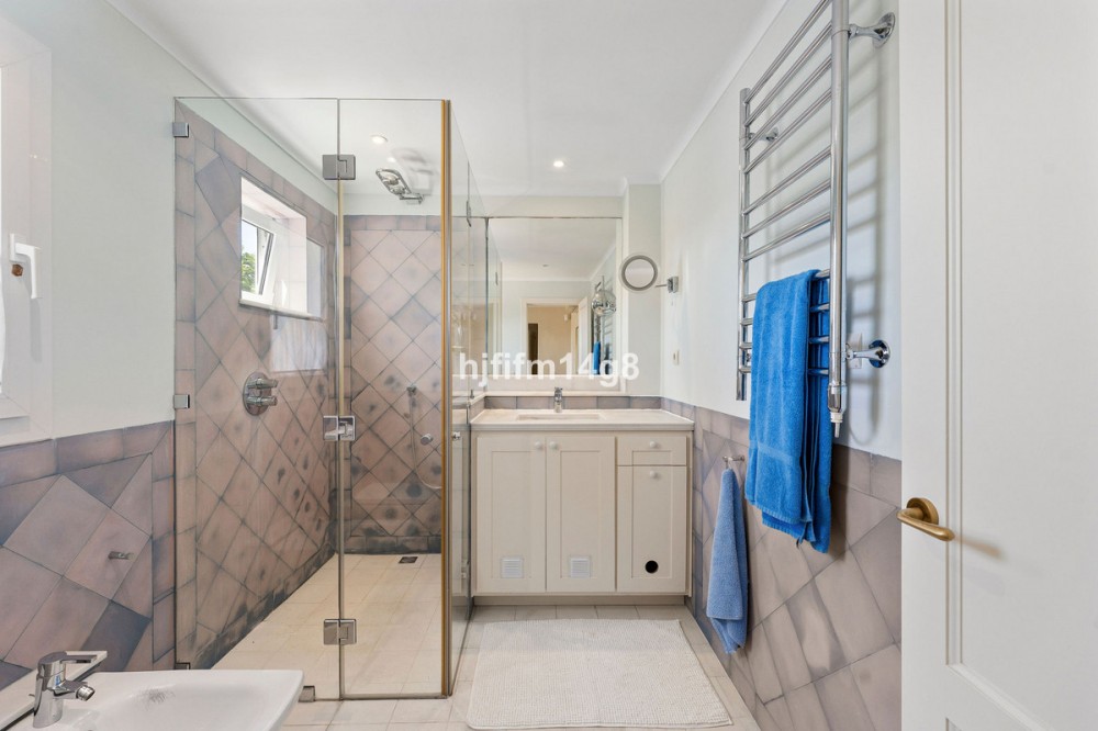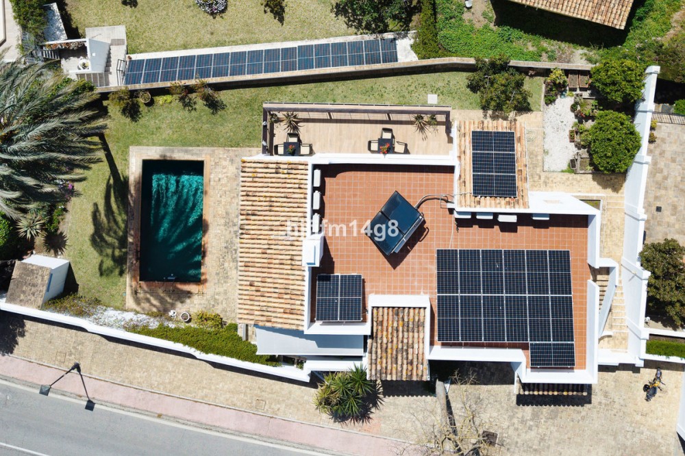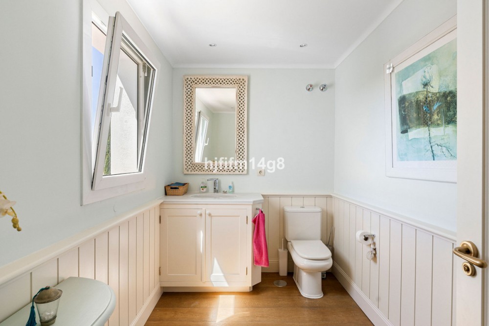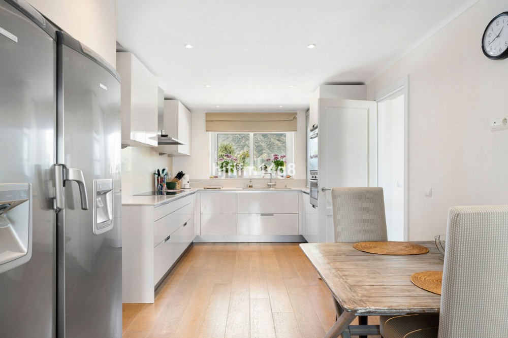 - This charming house for sale is ideally situated on the edge of the hill between Nueva Andalucía and San Pedro, offering stunning panoramic views to the east, south, and west. Located on one of the most sought-after streets in Nueva Andalucía, the home benefits from both a peaceful setting and proximity to all the conveniences of the area, including world-class golf courses, renowned restaurants, shopping, beaches and much more. As you enter the home, you’re welcomed into a bright and airy hallway with large windows that flood the space with natural light. The hallway also features built-in wardrobes. Straight ahead, the open-plan living and dining area creates a spacious and inviting environment, highlighted by a beautiful open fireplace and a striking staircase. The views from this level are breathtaking, with sweeping vistas to the west. The living room leads to a well-sized terrace, perfect for outdoor dining and relaxation, with ample space for both a dining area and a cozy lounge. On this level, you’ll also find a newly refurbished kitchen, a versatile office/bedroom, and a modern bathroom. Additionally, there is access to the garage, which accommodates one car. The lower floor features three comfortable double bedrooms and three bathrooms. There is also a practical laundry room, additional storage space, and plenty of room for customization—whether you want to create a gym, home cinema, or simply need extra storage. This level also provides access to the private garden and pool area, where you can unwind in peace. The garden includes a small vegetable plot, fruit trees, and a covered terrace, ideal for enjoying the Mediterranean lifestyle. The location of this property offers the best of both worlds: a tranquil retreat with unrivaled views and easy access to the vibrant lifestyle of Nueva Andalucía, making it an exceptional opportunity in one of the most desirable areas of Marbella.