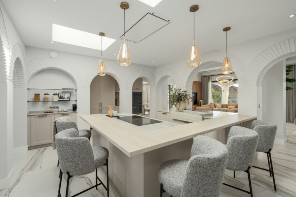- This villa is a charming Mediterranean retreat that seamlessly blends traditional style with refined contemporary touches. Located on a spacious plot of over 1,000 m² within the prestigious gated community of Altos Reales, on Marbella's coveted Golden Mile, this exceptional property offers an atmosphere of tranquility and luxury. Its manicured gardens create a lush setting ideal for relaxation, complemented by a private pool and inviting outdoor jacuzzi. The spacious terraces have been designed with al fresco entertaining in mind, providing a perfect setting for gatherings surrounded by the area's natural charm. Inside, the villa displays an impeccable design with a neutral color palette that enhances a sense of calm from the first moment. Mediterranean architectural elements, such as elegant arches, harmoniously connect the spaces, maintaining an open and flowing layout. The living area stands out for its high ceilings with white-painted wooden beams, paying homage to the property's Andalusian character. The modern and functional kitchen is equipped with high-end appliances and features a central island that combines functionality and style as a culinary space and informal dining area. The villa features five carefully decorated bedrooms, ensuring privacy and comfort. The master suite offers direct access to a private conservatory and a luxurious en suite bathroom. Every corner has been designed to offer an elegant, warm, and sophisticated living experience in one of Marbella's most exclusive settings.