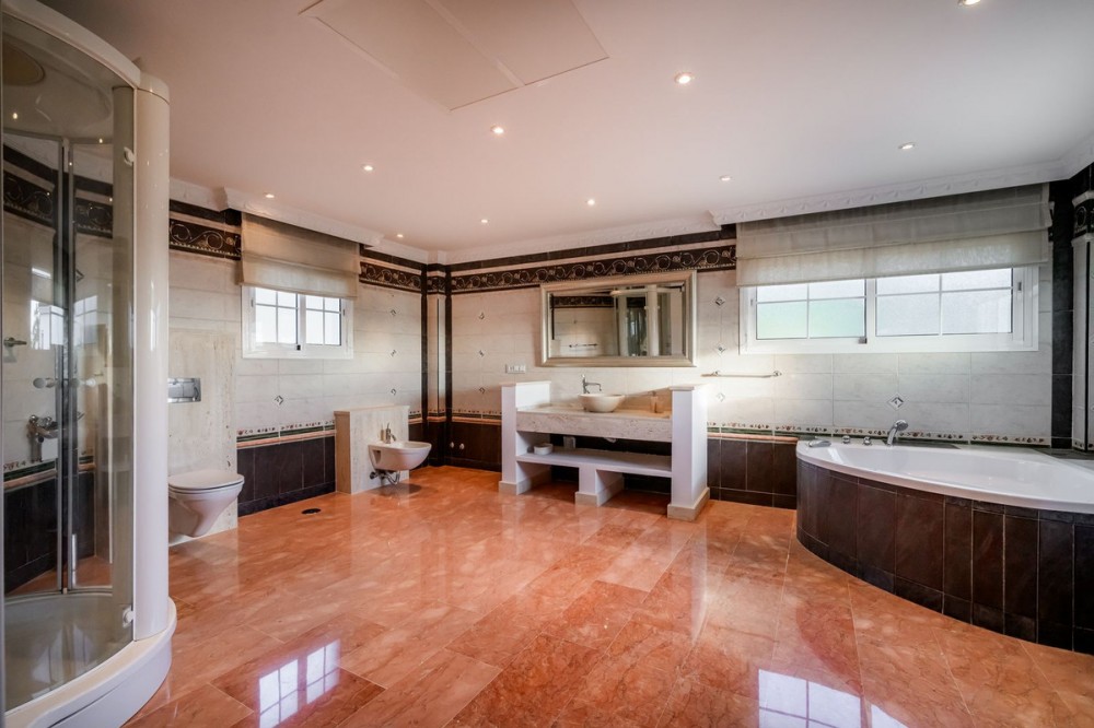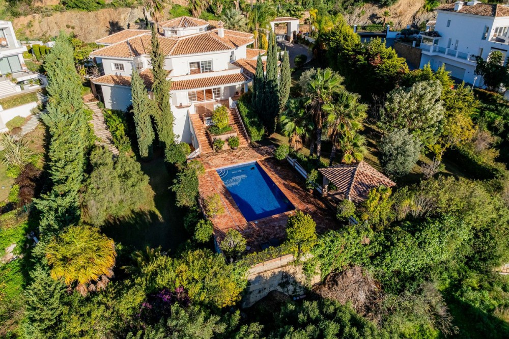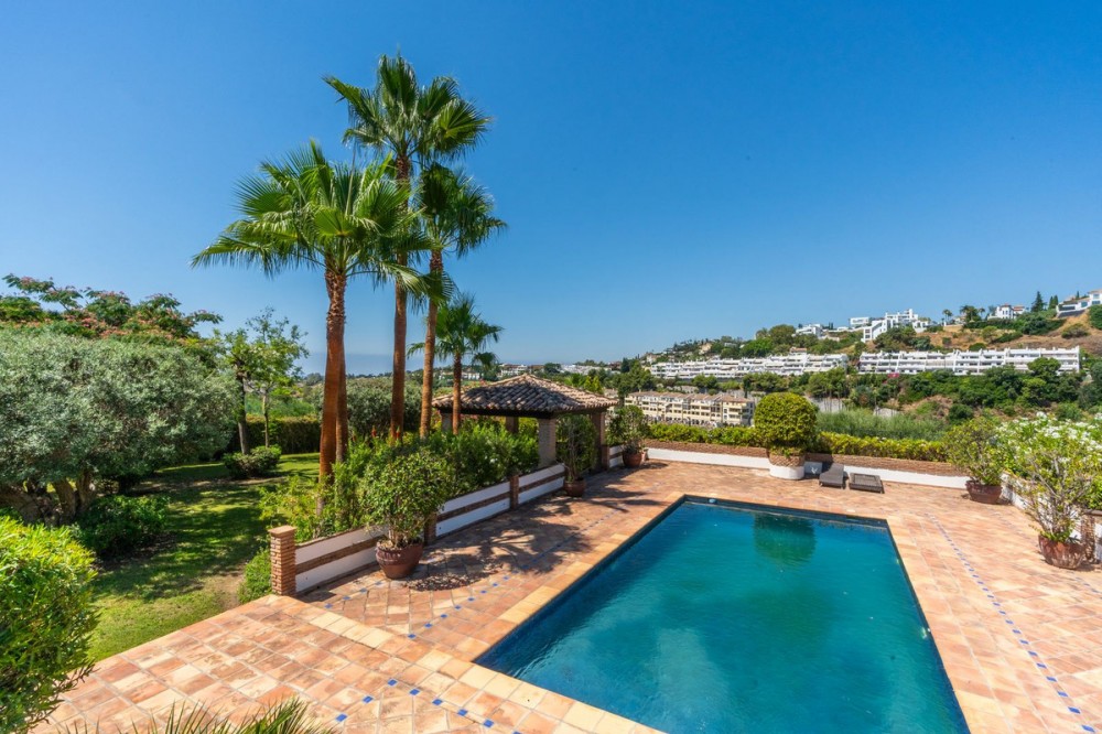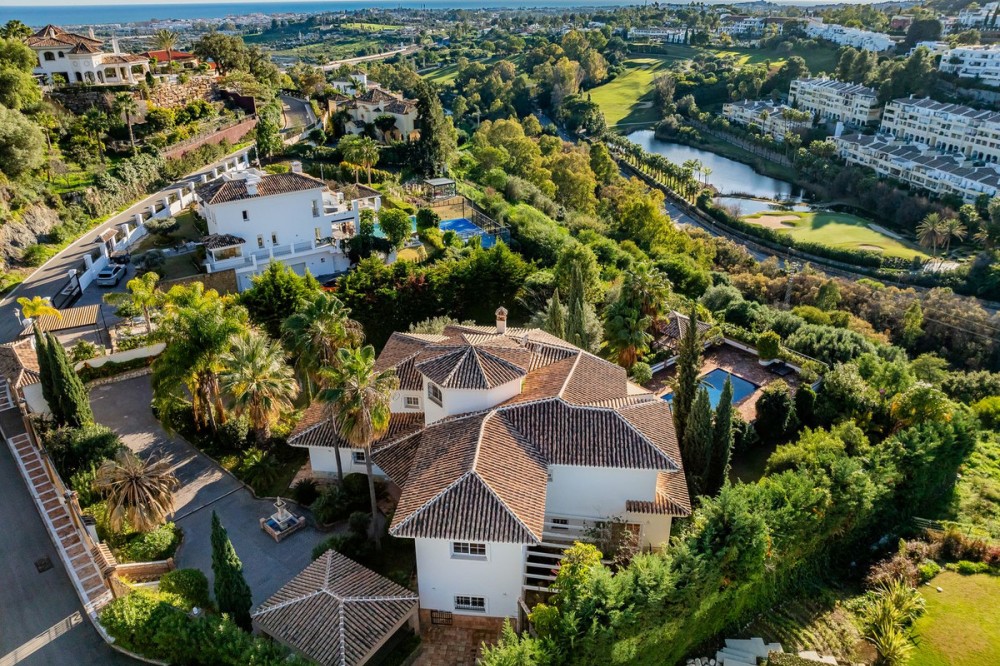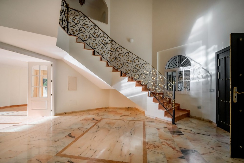 - SPECTACULAR VILLA WITH LARGE PLOT IN GATED COMMUNITY WITH 24-HOUR SECURITY Impressive villa, located in an exclusive and secure area between Nueva Andalucía and La Quinta, just minutes from Puerto Banús and San Pedro de Alcántara, close to all kinds of services (International School, restaurants, supermarkets, etc.) and surrounded by the best golf courses in the area: La Quinta Golf, Los Naranjos Golf, Aloha Golf, etc. Large Mediterranean-style villa, spread over a total of four floors. On the main floor, the property features a spacious living room with a dining area, two bedrooms with en-suite bathrooms, a large kitchen, and a guest toilet. The upper floor features three large bedrooms with en-suite bathrooms. The master bedroom also has a dressing area and a terrace with beautiful views of the sea, the golf course, and the mountains. The upper floor of the property offers an office area. On the basement level, the property offers a two-car garage, a separate apartment with a bedroom, bathroom, living room, and kitchen. There is also a spa area, a wine cellar, a machine room, a large storage room, and more. Externally, the property boasts a large 2,750 m2 plot with a private pool, a spacious garden, and parking for several cars. Located within an exclusive and private residential area with 24-hour security. An ideal property for clients who want to enjoy a very secure property with a large plot and lots of potential, located in one of the most sought-after areas of Marbella.
