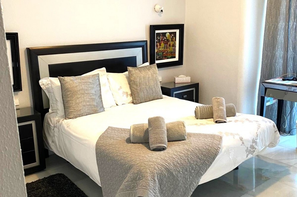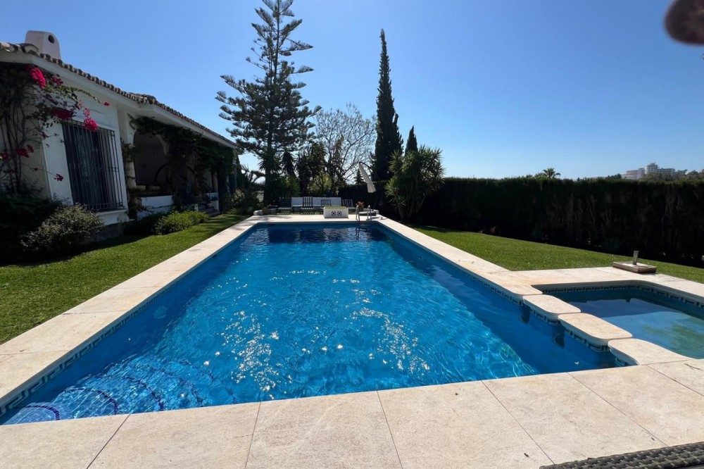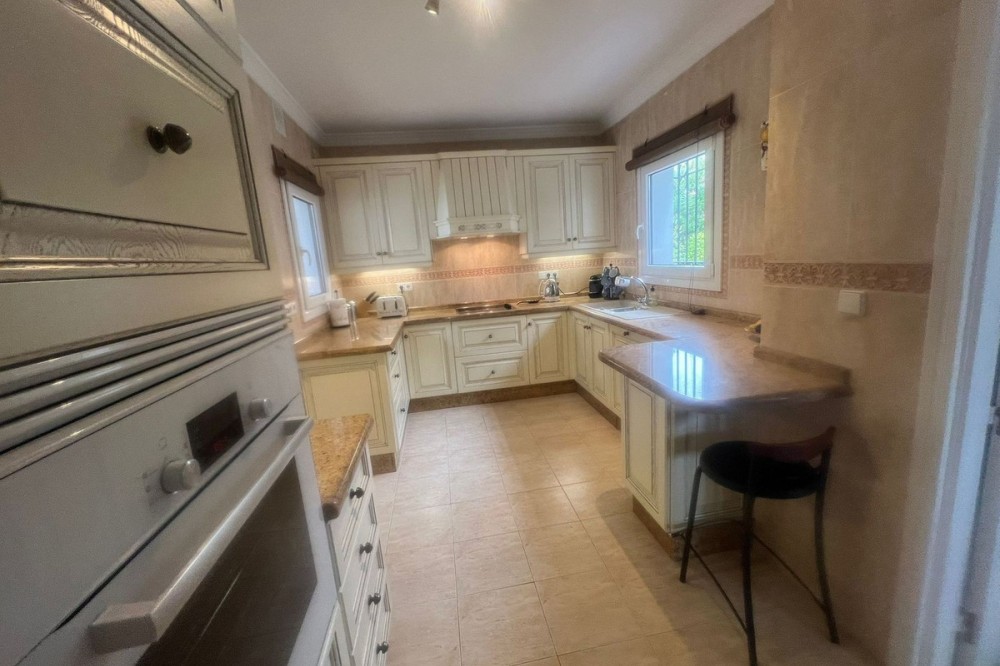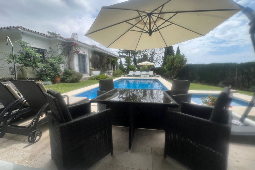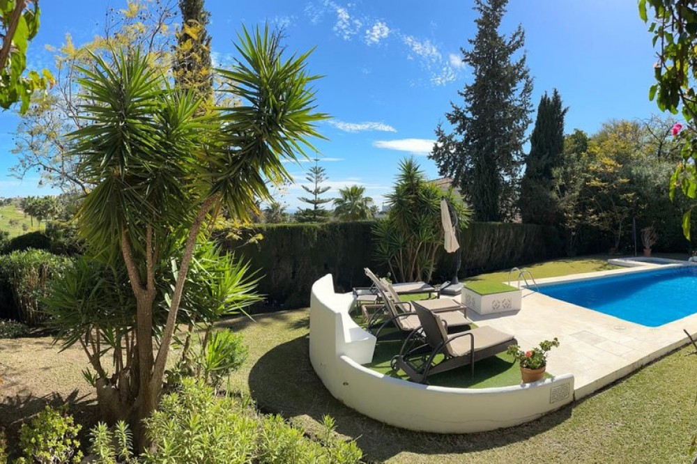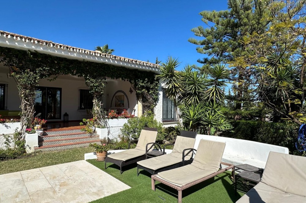 - Set on a generous double plot in Paraiso Alto, this fully renovated 4-bedroom, 3-bathroom bungalow offers an exceptional blend of space, style, and scenery. Ideally south-facing, the property enjoys panoramic sea views from the garden as well as picturesque golf course views, creating a peaceful and luxurious atmosphere. Inside, the home boasts a bright and modern layout with open-plan living areas, air conditioning, and a sleek contemporary kitchen. All bedrooms are spacious, and the bathrooms have been upgraded to a high standard. Security and comfort are paramount, with a fully integrated alarm system and external surveillance cameras already in place. The double plot not only ensures privacy and expansive outdoor space, but also offers potential for future expansion (plans available), additional landscaping, or recreational features like a pool or guest annex. This property is a rare opportunity — perfect as a permanent residence, a stylish second home, or a smart investment.