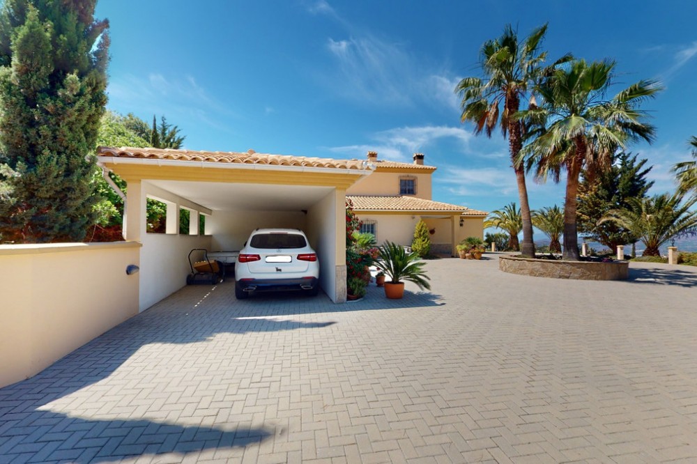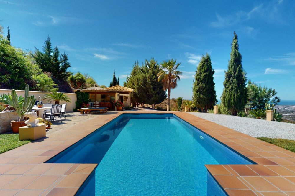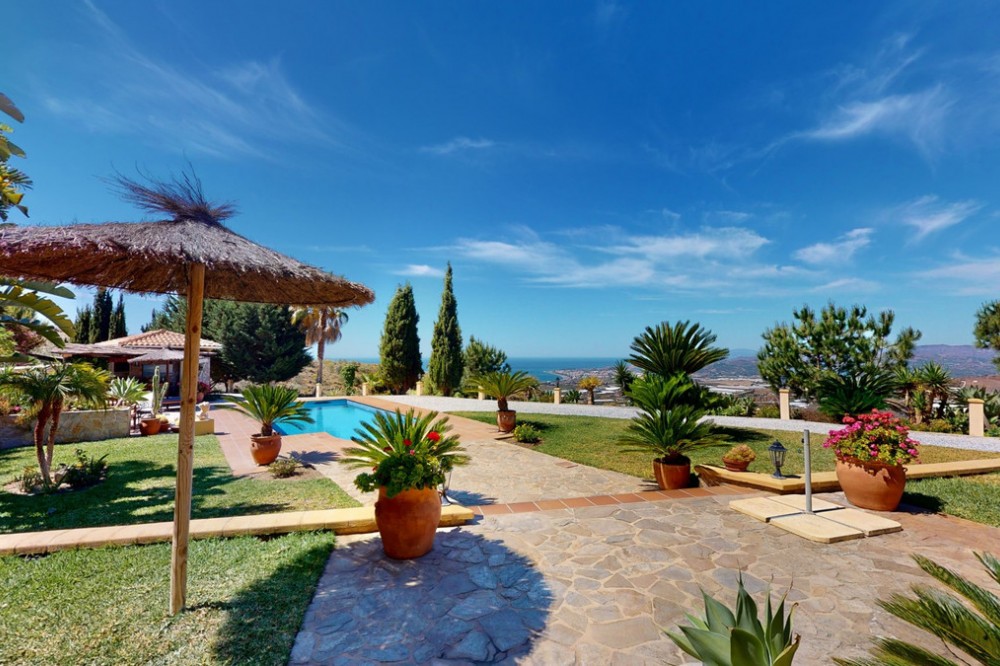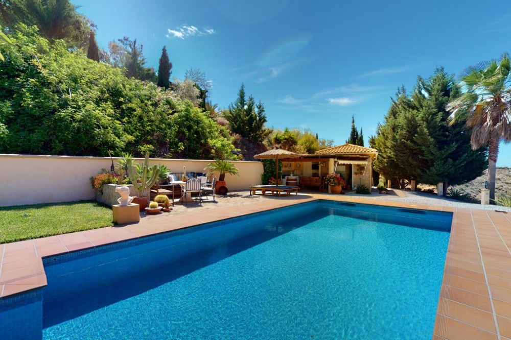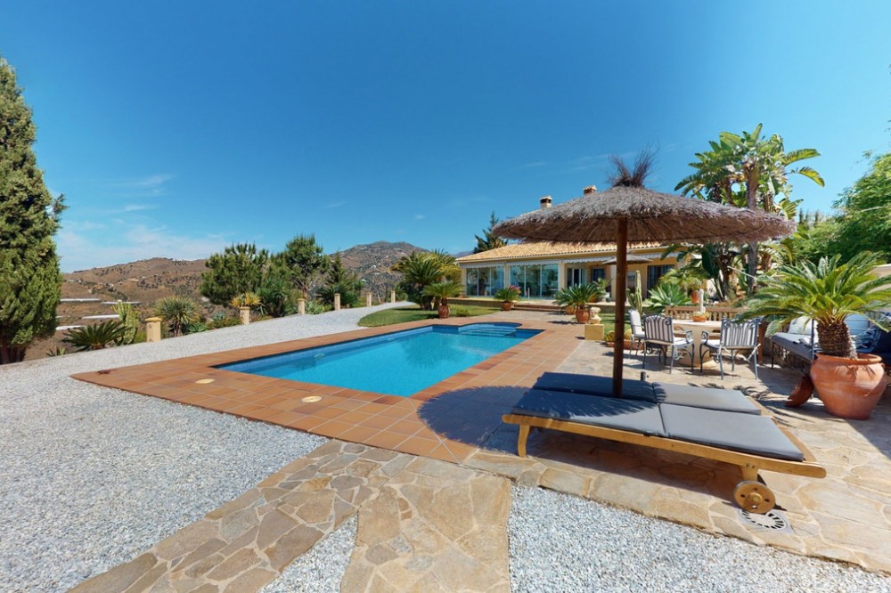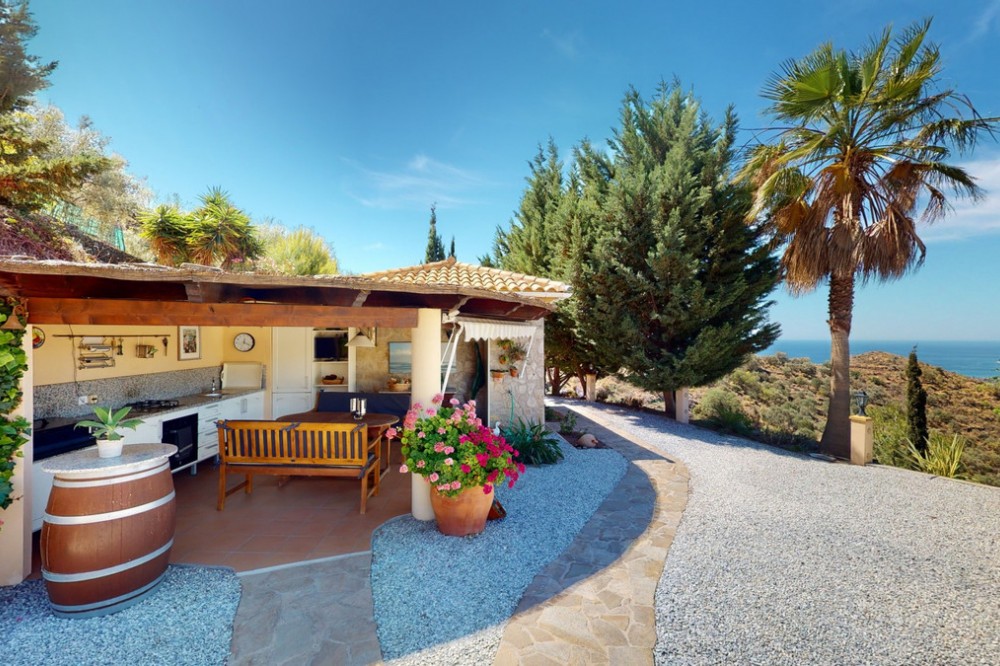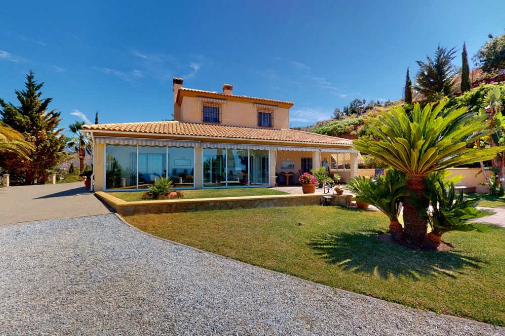 - The perfect view paired with the right southwest orientation, which together gives the superlative to absolute happiness. A villa which leaves nothing to be desired, built to a very high standard with an incomparable beautiful garden with spa, sauna and pool, a luxurious outdoor kitchen with integrated dining area. All this and more is offered by this unique villa, located between Algarrobo and Sayalonga. Due to its exposed location, in addition to absolute privacy, you have the romantic view of the setting sun - partly over the Mediterranean Sea and sometimes - depending on the season - over the fabulous mountain landscape of Málaga. Over an asphalted, with pines lined private access road one reaches the imposing entrance area of the property , where a palm island is in the midst of rondel. There are several parking spaces and a garage plus a large carport. On the first floor of the villa is the living room with separate fireplace room, a guest toilet and laundry room, a modern kitchen with access to the very spacious conservatory, which lacks nothing. Further, on the first floor there is a really nice bedroom with a bathroom on suite. On the upper floor of the villa is the master bedroom with a spacious bathroom on-suite , as well as an attached dressing room. The property is equipped with central heating, air conditioning and a fireplace. On the plot are planted a variety of fruit trees, palm trees , tropical plants and pine trees. 15 minutes to the beach and the sea, as well as the golf course and marina of Caleta - and only 40 minutes drive to the airport of Málaga. We are pleased to be able to present this dream property to you soon, either personally or via virtual viewing. Because this world, it is unique - just like our Axarquía. In Andalusia. On the Costa del Sol. Here, on the sunny side of life...