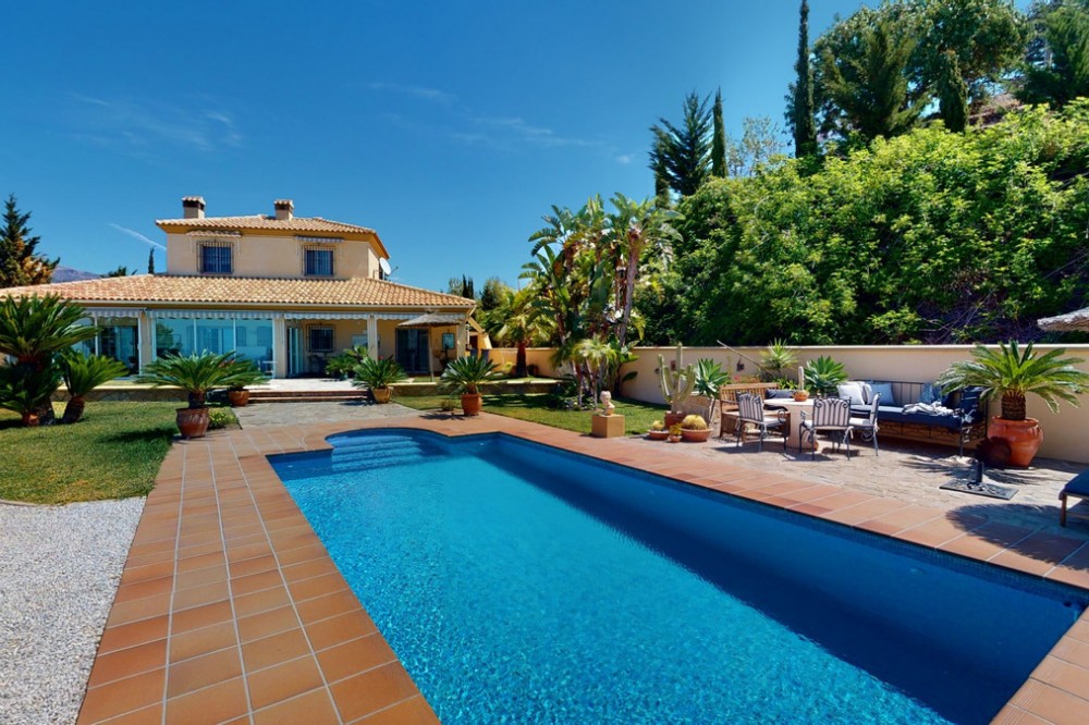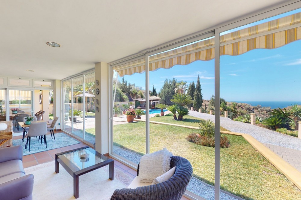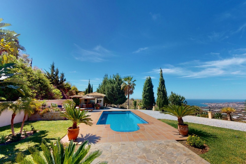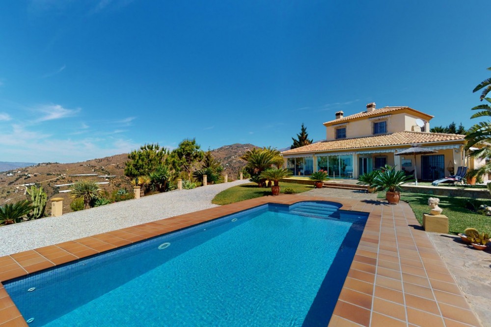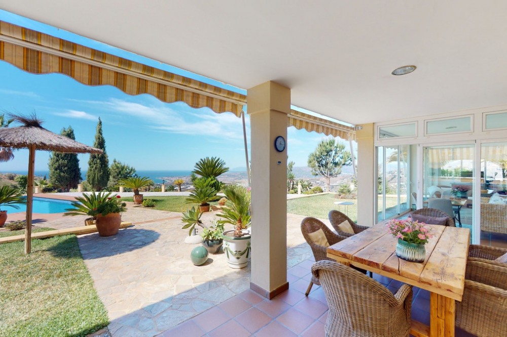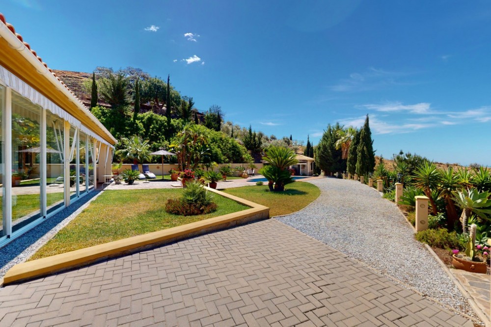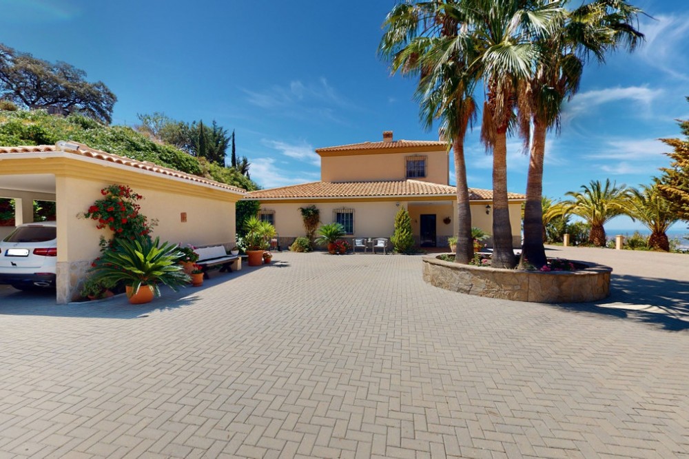 - The perfect view paired with the right southwest orientation, which together gives the superlative to absolute happiness. A villa which leaves nothing to be desired, built to a very high standard with an incomparable beautiful garden with spa, sauna and pool, a luxurious outdoor kitchen with integrated dining area. All this and more is offered by this unique villa, located between Algarrobo and Sayalonga. Due to its exposed location, in addition to absolute privacy, you have the romantic view of the setting sun - partly over the Mediterranean Sea and sometimes - depending on the season - over the fabulous mountain landscape of Málaga. Over an asphalted, with pines lined private access road one reaches the imposing entrance area of the property , where a palm island is in the midst of rondel. There are several parking spaces and a garage plus a large carport. On the first floor of the villa is the living room with separate fireplace room, a guest toilet and laundry room, a modern kitchen with access to the very spacious conservatory, which lacks nothing. Further, on the first floor there is a really nice bedroom with a bathroom on suite. On the upper floor of the villa is the master bedroom with a spacious bathroom on-suite , as well as an attached dressing room. The property is equipped with central heating, air conditioning and a fireplace. On the plot are planted a variety of fruit trees, palm trees , tropical plants and pine trees. 15 minutes to the beach and the sea, as well as the golf course and marina of Caleta - and only 40 minutes drive to the airport of Málaga. We are pleased to be able to present this dream property to you soon, either personally or via virtual viewing. Because this world, it is unique - just like our Axarquía. In Andalusia. On the Costa del Sol. Here, on the sunny side of life...