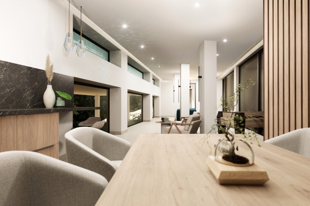 - Tucked away on a quiet cul-de-sac in Sotogrande’s tranquil F Zone, this striking new villa is currently under construction and set for completion in May 2025. Designed with modern living in mind, the home embraces its south-facing position, flooding the interior with natural light and opening up to lush garden views and the calming backdrop of native woodlands. Occupying a generous 1,786 m² plot, the villa is accessed via a long private driveway that ensures complete privacy. Inside, the 550 m² layout is spacious and thoughtfully planned, offering five large bedrooms, multiple living and entertaining areas, and seamless transitions to outdoor spaces. There are 265 m² of open terraces, 64 m² of covered terraces, and a stunning rooftop terrace—perfect for sunset views and alfresco evenings. The home will be equipped with high-spec features, including underfloor heating, full air conditioning, and an advanced domotic system for effortless control of lighting, climate, and security. Outside, the 14.5 m x 5 m saltwater infinity pool—solar-heated for energy efficiency—sits in harmony with the landscaped gardens, creating an ideal space for relaxing and entertaining. Combining sleek architecture, sustainable tech, and a peaceful setting, this property is a rare find for buyers looking for a refined lifestyle in one of Sotogrande’s most desirable neighborhoods.