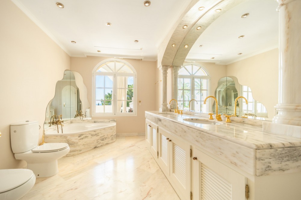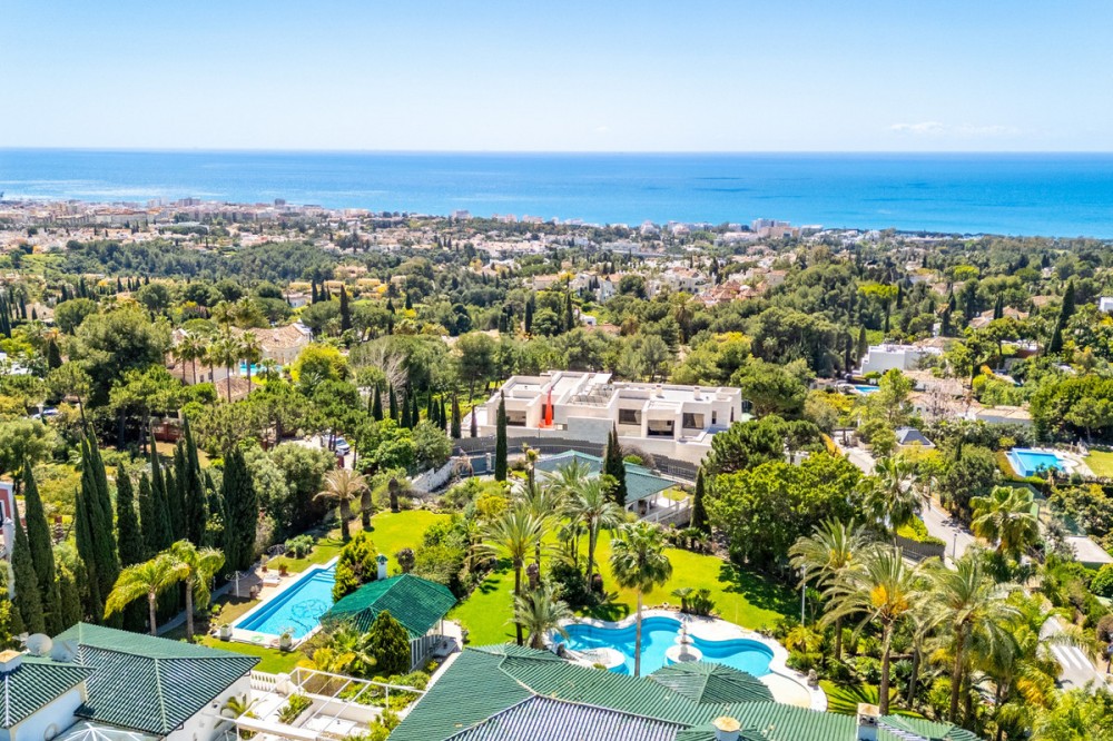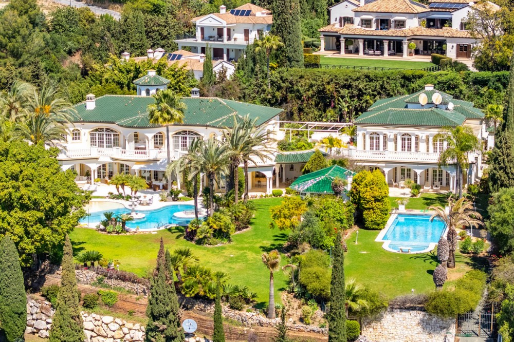 - This exceptional property is set on a generous, elevated plot of 7,200 m² in the exclusive, gated Cascada de Camoján community in Marbella and offers breathtaking views of the Mediterranean Sea. The impressive luxury residence consists of three separate properties: the four-bedroom main house, an adjoining, connected seven-bedroom guest house, and a self-contained four-bedroom guest finca with its own tennis court. The property welcomes you with an imposing entrance gate leading to a spacious driveway. This provides access to a four-space underground garage, two further garages on the ground floor, and ample space for eight additional vehicles outside. The entrance of the main house opens into a magnificent double-height reception hall with a stunning imperial double staircase. The ground floor houses the elegant living room with large French windows that let in plenty of natural light, a stylish study, a fully equipped gym, and a spacious kitchen. Directly adjacent to the living room is a spacious dining room for up to 12 people, which offers access to a long, elegant indoor bar with seating for at least 10. This is also connected to an outdoor bar, ideal for entertaining guests on the spacious terrace. The kitchen is also connected to the garages on this level via an adjoining utility room. Upstairs, you'll find four luxurious bedrooms, each with its own bathroom. From here, there is also direct access to the adjoining guest house, which includes seven additional bedrooms, several bathrooms, and a total of three fully equipped kitchens. The basement of the main house houses four additional garage spaces, several storage rooms, and the property's utility rooms. Both the main house and the guest house have their own lavishly landscaped gardens and a heated pool – each completely independent of the other. The separate guest finca, ideal for visitors or staff, features four bedrooms, private living areas, and a special highlight, a private tennis court. In addition to its unique living comfort, this property also offers enormous potential as an exclusive investment: Due to the exceptional size of the plot, there is the possibility of building up to six luxurious villas on this site – a rare opportunity in one of Marbella's most desirable locations. This property combines outstanding architecture, absolute privacy, luxurious amenities, and excellent development opportunities at the highest level. Discover a new level of living in Cascada de Camoján – an oasis of tranquility with spectacular views. Contact us today for an exclusive viewing of this unique property.