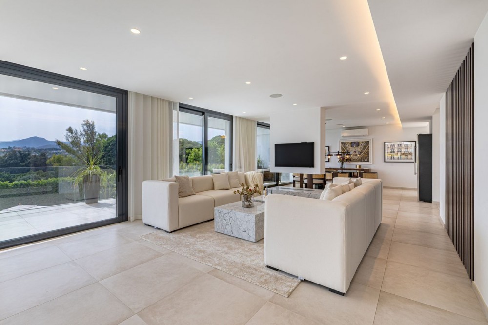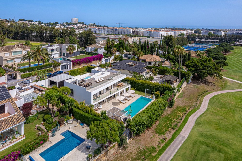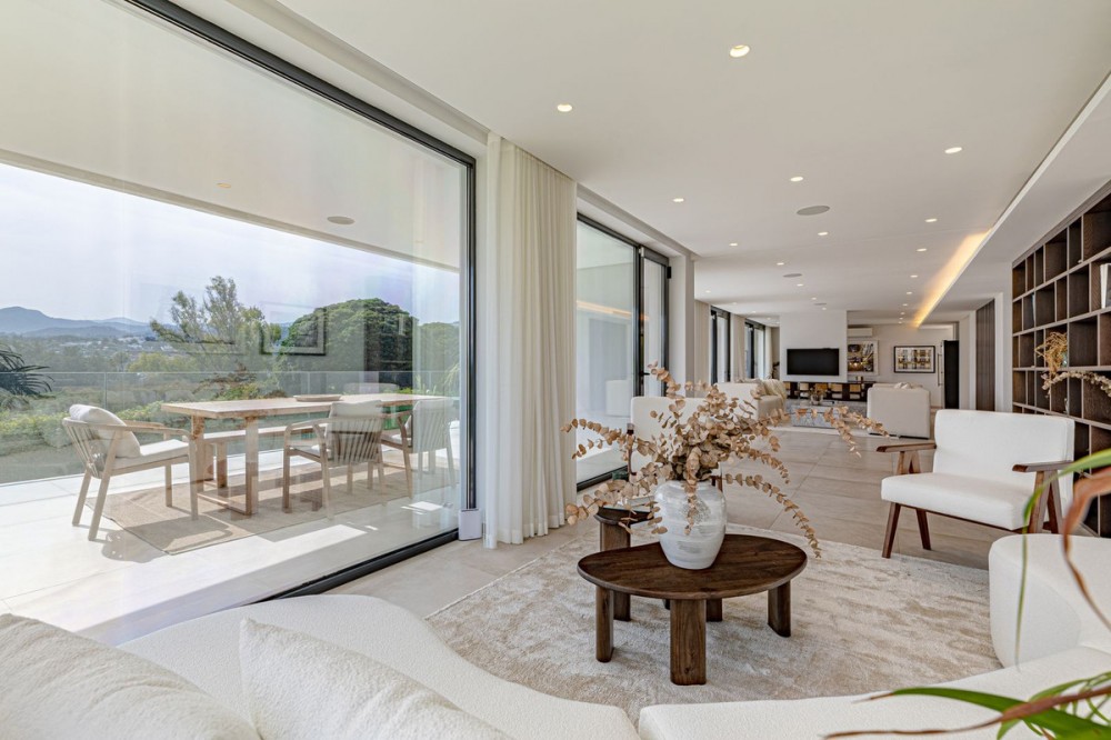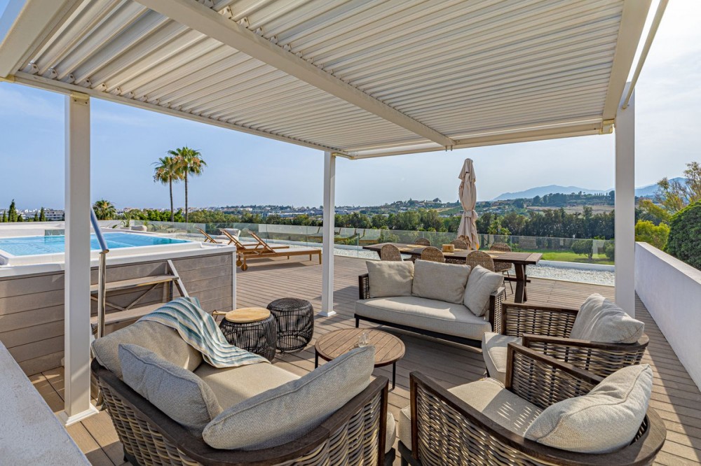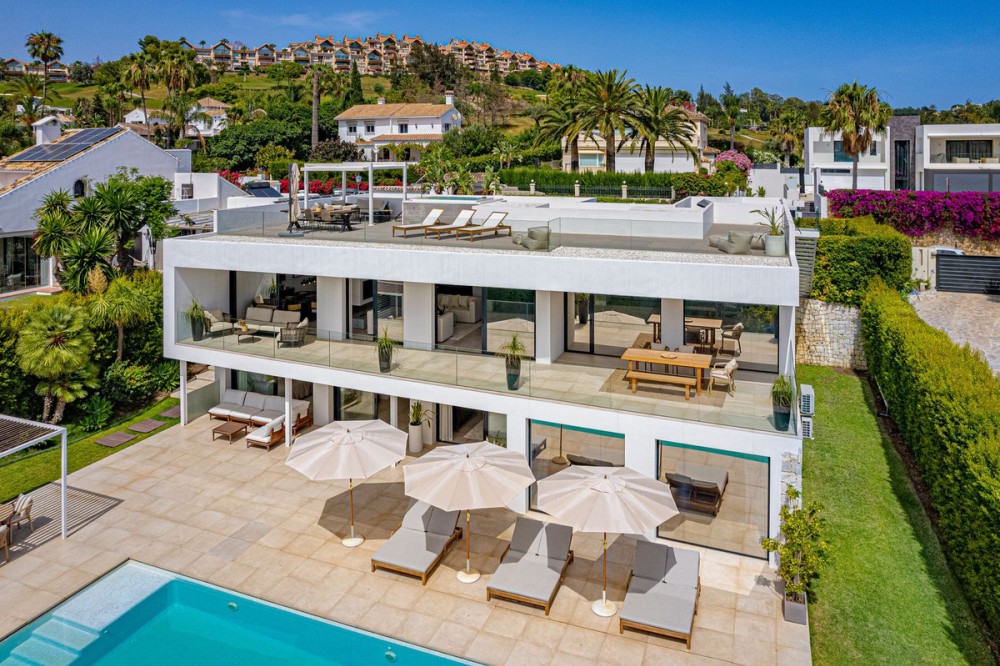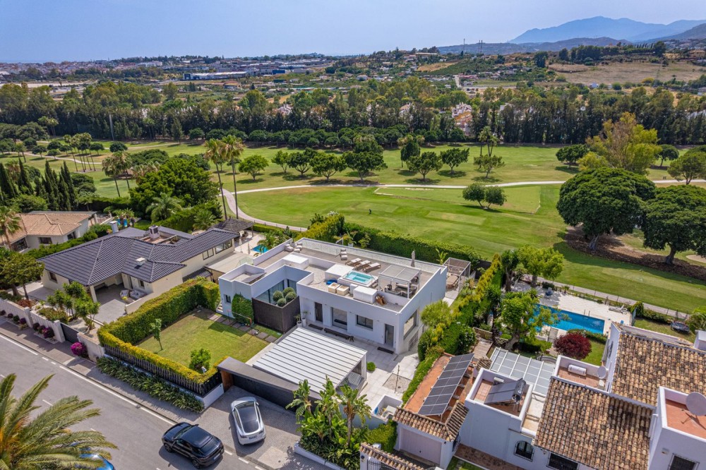 - Introducing this fantastic villa, a striking frontline golf villa that redefines modern Mediterranean living. Nestled in one of Marbella’s most prestigious enclaves, this exceptional residence fuses architectural sophistication with effortless comfort, creating a home that’s both visually stunning and remarkably functional. Set against the backdrop of lush fairways and majestic mountains, Orion 51 offers sweeping views from every corner. Expansive outdoor spaces, including sun-drenched terraces and a private pool, are designed for stylish entertaining and tranquil relaxation. A private driveway ensures seamless access, while the villa’s layout maximizes privacy and light. Inside, the open-plan living area is flooded with natural light, connecting seamlessly to a state-of-the-art kitchen that caters to both gourmet meals and casual gatherings. The primary suite is a serene retreat, complete with its own terrace access and a beautifully appointed en-suite bathroom that radiates refined elegance. For wellness and entertainment, Orion 51 is equipped with a cutting-edge gym, a cozy private cinema, and a rooftop solarium featuring a jacuzzi with panoramic views — the perfect setting to unwind and soak in Marbella’s golden hours. Located just minutes from premier golf courses, upscale dining, boutique shopping, and the iconic Puerto Banús. Enjoy exclusive, direct access with your buggy to the prestigious Los Naranjos Golf Course from your villa.
