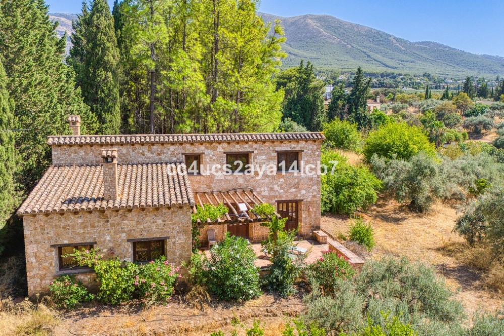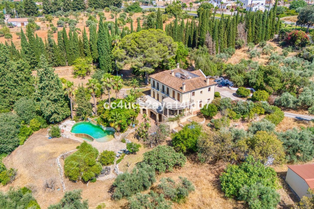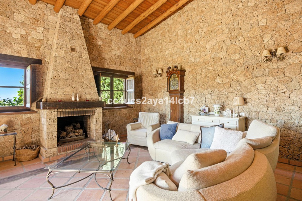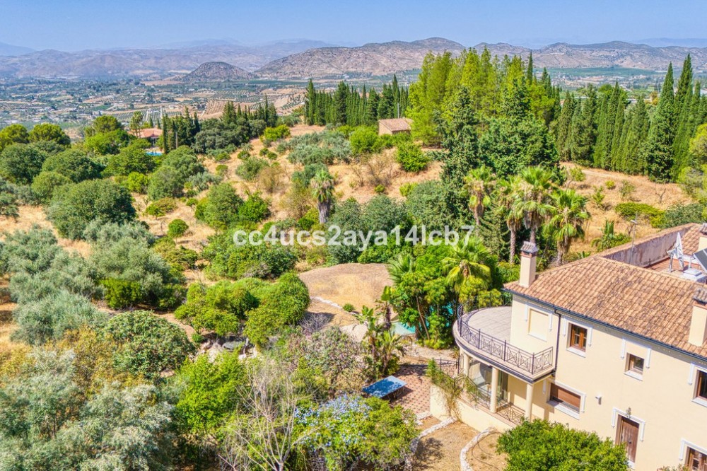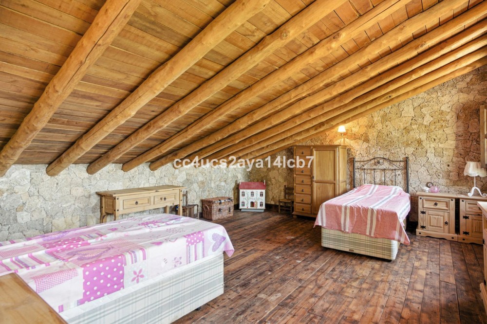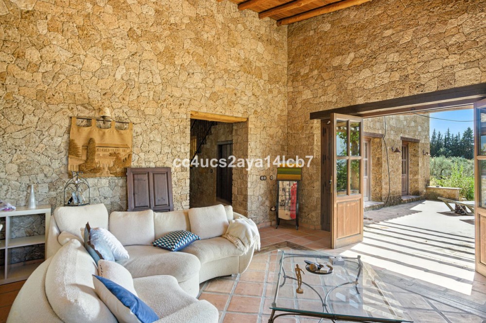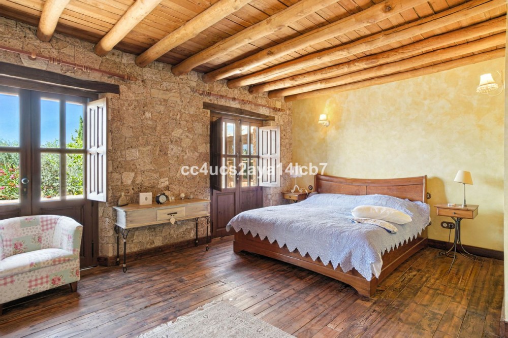 - This stunning country home in Alhaurín el Grande was built in 2005 by the current owners to an exceptionally high and personalised standard. Set on a generous plot of over 35,000m², the property is accessed via its own private driveway and enjoys breathtaking views across the surrounding countryside. The house is currently arranged as a four-bedroom, four-bathroom residence, though there is significant potential to extend or adapt the layout to suit individual needs. Upon entering the home, you are greeted by a grand entrance hall with impressively high ceilings that continue throughout the property, adding a sense of space and elegance. On the ground floor, there is a dedicated study featuring exquisite rosewood panelling reclaimed from an original English Tudor house, which could easily be transformed into an additional bedroom. The home benefits from double-glazed windows throughout and includes a guest toilet on this level. The large lounge provides an inviting living space, with the potential to be expanded further by opening it into the adjacent kitchen and private seating area. The kitchen itself is German-designed and of excellent size, featuring granite worktops, top-of-the-range Gaggenau appliances, an American-style fridge, and a convenient walk-in pantry. Ample storage space is available throughout the ground floor, which also includes a separate office. Upstairs, the first bedroom includes a mezzanine level and an en suite bathroom. The second bedroom features a private terrace with stunning views, also with a mezzanine and en suite. The master bedroom is truly expansive, offering wonderful vistas, a luxurious en suite with both bath and shower, and a vast walk-in wardrobe. This wardrobe area could also be converted into another bedroom with its own separate access if desired. The basement level of the home is exceptionally unique for a Spanish property. It includes a fully equipped bar, pool table, utility room, gym area, and a separate room with shower and toilet, which could serve as an additional bedroom. One of the standout features is the cinema room, all finished with remarkable historical touches including 500-year-old Tudor bricks and flooring salvaged from a traditional cotton mill. Adjacent to the main house is a charming guest cottage or casita, built with authentic Spanish limestone. This beautiful space includes two bedrooms, one bathroom, and a fully fitted kitchen complete with a pizza oven. The flooring is a distinctive feature, sourced from the original Guinness factory. With its peaceful setting, extensive land, and flexible layout, this one-of-a-kind property offers an ideal combination of privacy, charm, and development potential – perfect for those seeking a luxurious countryside lifestyle in Alhaurín el Grande.