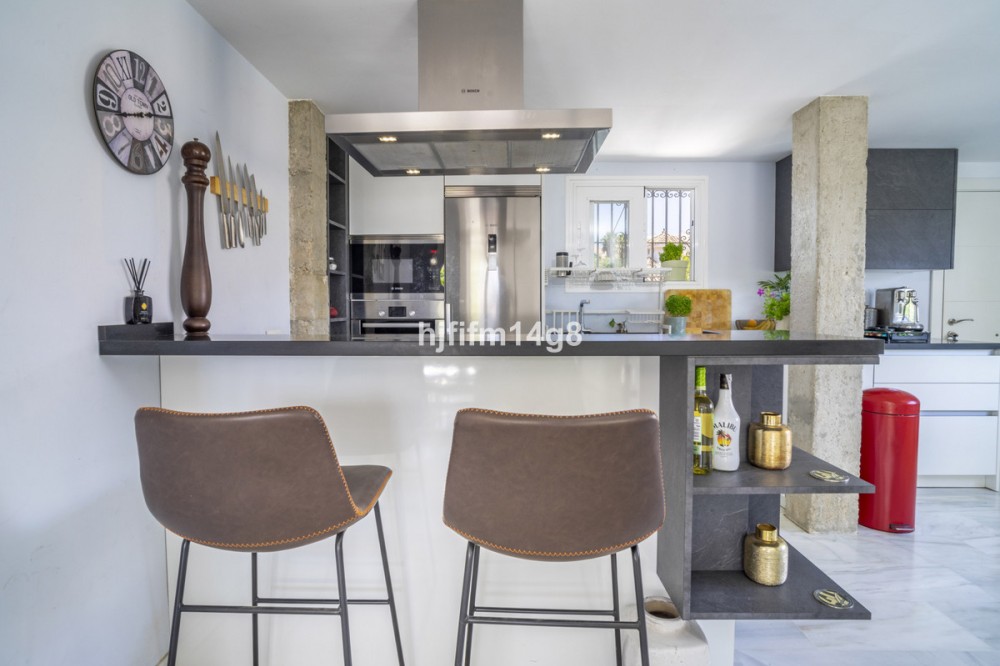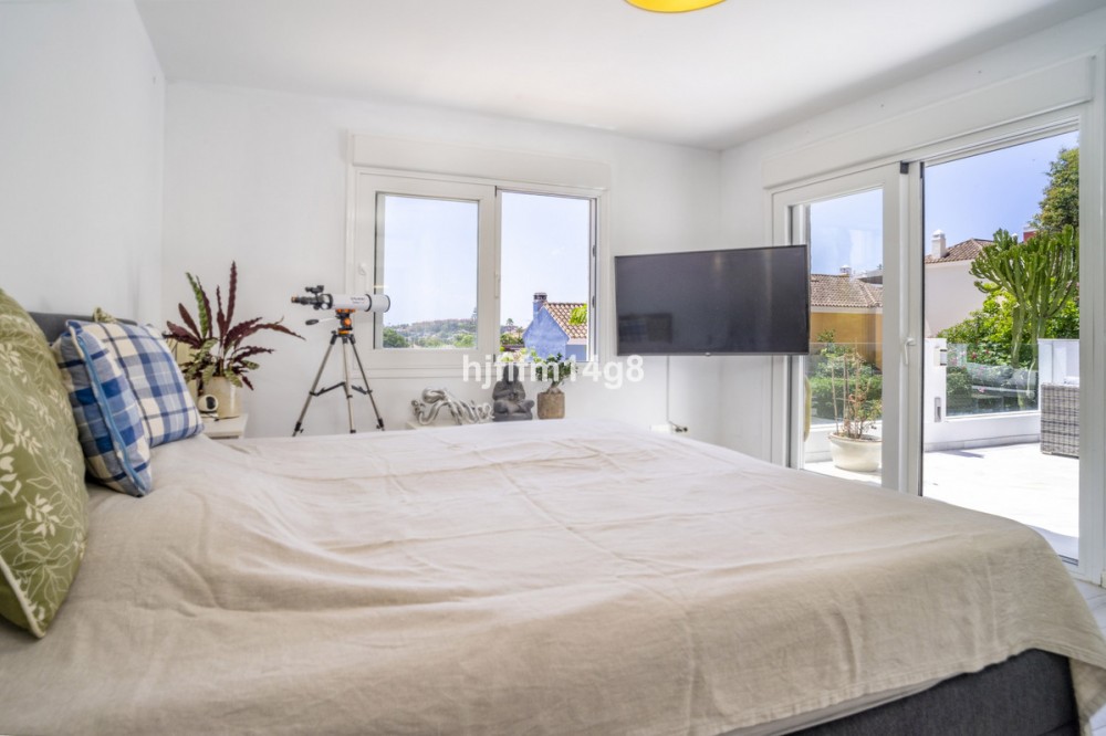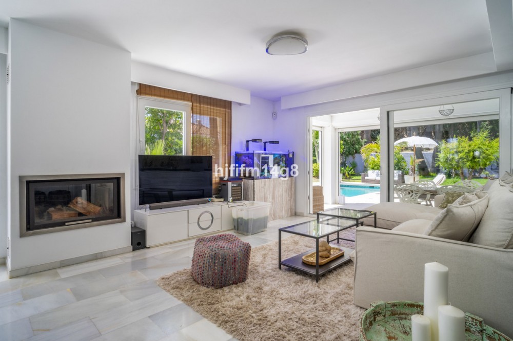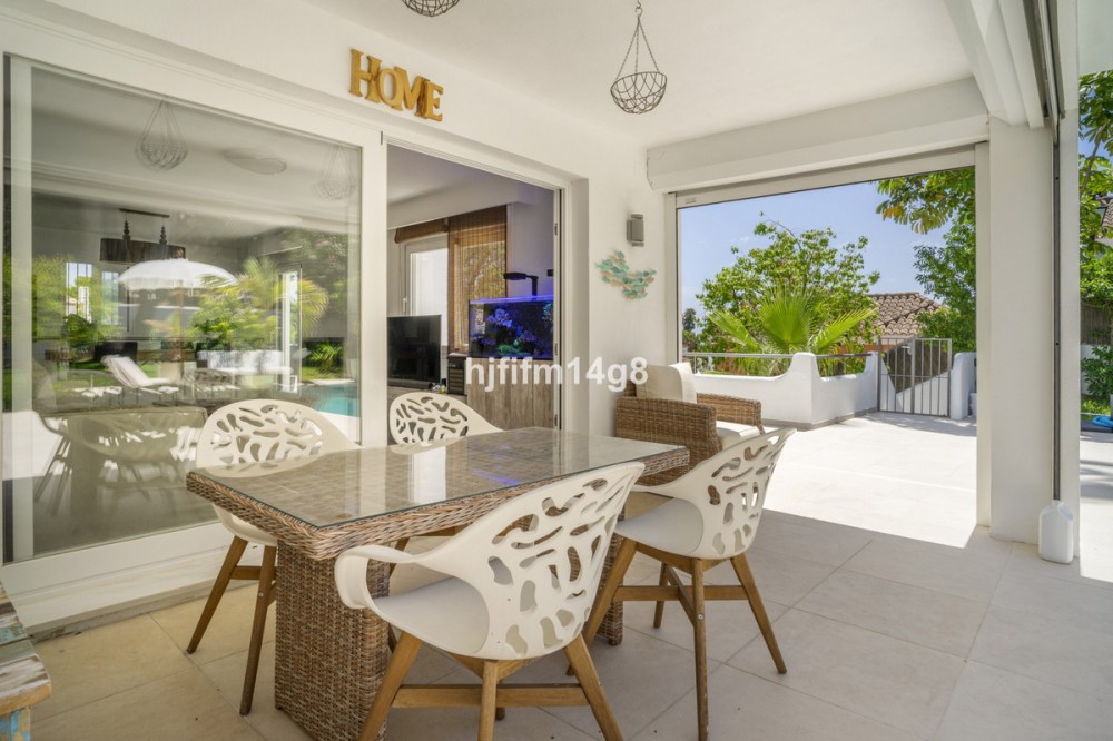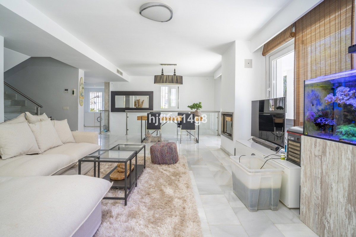 - Discover this elegant villa located in the prestigious Los Naranjos Hill Club, Nueva Andalucía. Situated in a peaceful cul-de-sac, this charming home offers a perfect blend of privacy, comfort, and Mediterranean lifestyle, just a short distance from top international schools, renowned golf courses, and only 4 km from the golden beaches and luxury marina of Puerto Banús. The entrance level welcomes you with a bright open-plan layout that seamlessly integrates a fully equipped modern kitchen, a spacious dining area, and a cozy living room with a fireplace. Large sliding doors lead out to a generous terrace, offering partial golf views and overlooking the private swimming pool and lush garden, creating an ideal space for outdoor dining and relaxation. On this floor, you’ll also find a guest bedroom with direct access to the pool area, along with a full bathroom. Upstairs, the master suite features an en-suite bathroom with underfloor heating and a private terrace boasting stunning mountain and sea views — the perfect retreat for peaceful mornings or sunset evenings. The lower level hosts two additional bedrooms that share a modern bathroom. Both rooms enjoy direct access to a secluded private garden, enhancing the sense of tranquility and space. The property also boasts a private garage. This villa offers an exceptional location, just minutes from Marbella town centre and San Pedro, making it an ideal family home or a smart investment for rental opportunities in one of Marbella's most sought-after residential areas.