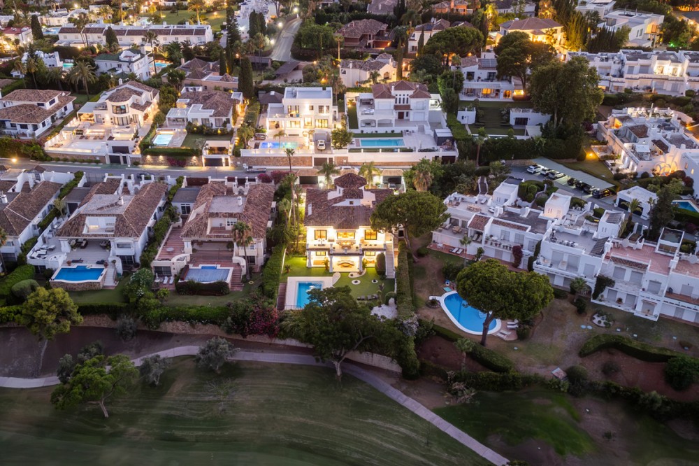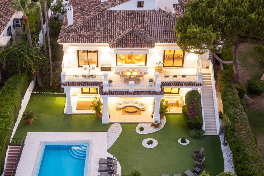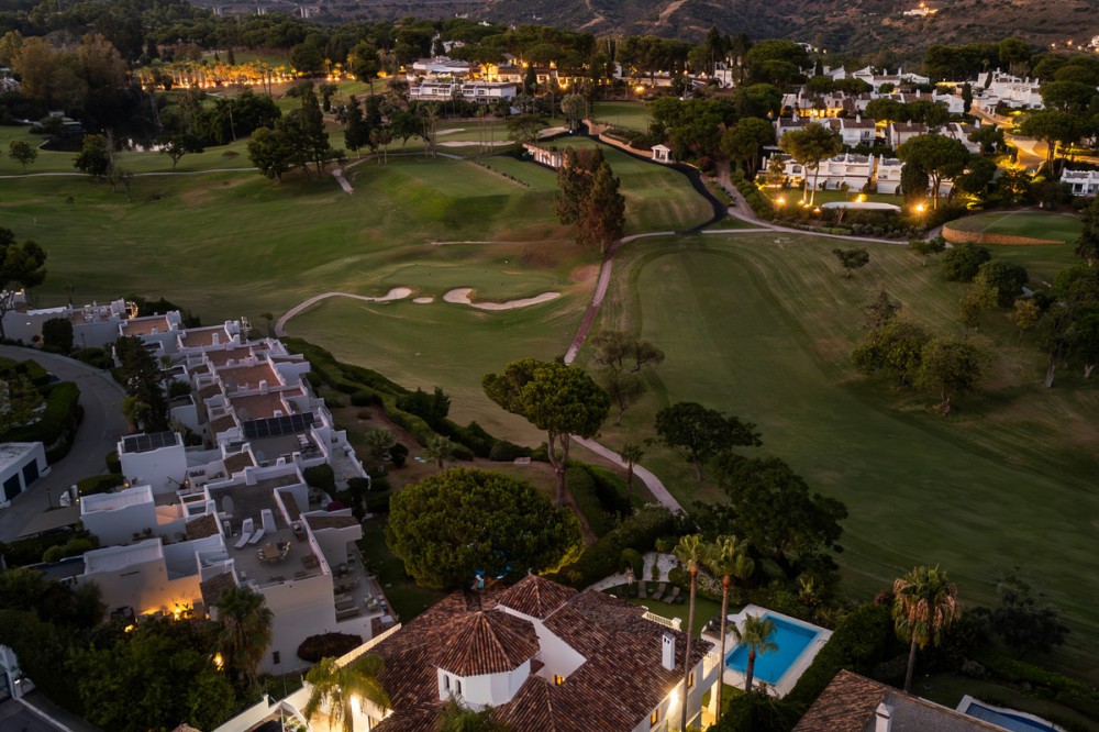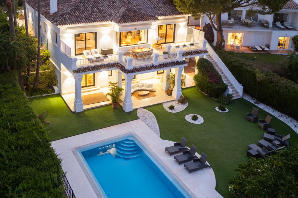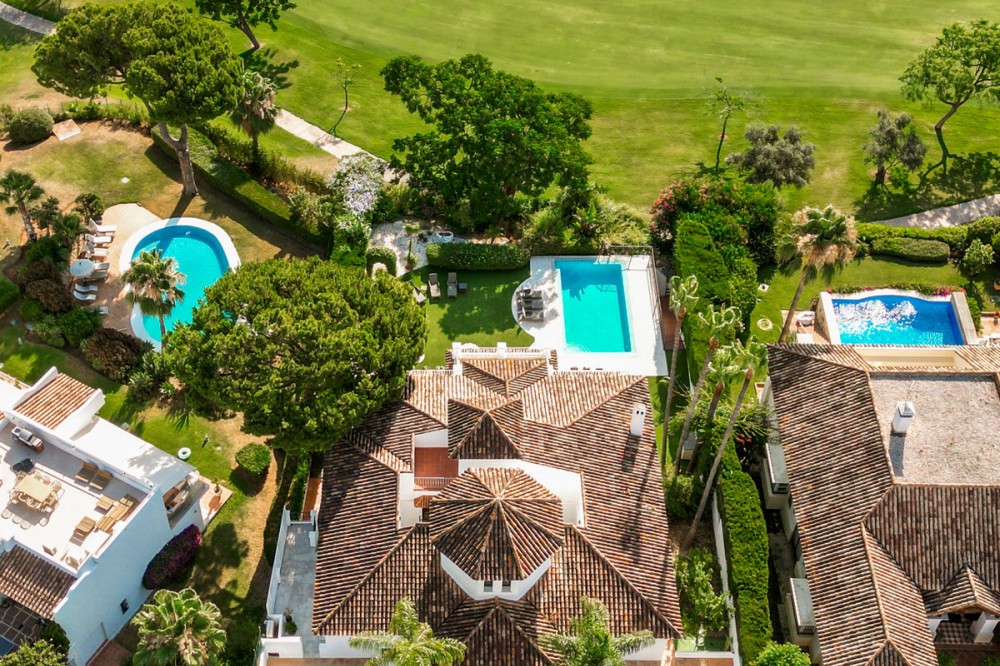 - Stunning frontline golf villa with panoramic mountain views to La Concha as well as overlooking the beautiful Aloha Golf course. The Villa is situated on a quiet cul-de-sac, just a short distance to the famous Puerto Banús marina and Aloha Gardens. The property is extremely convenient in terms of the floor plan distribution. All the main social areas such as kitchen, living room, dining room are well connected with direct accesses outside to the beautiful outdoor space that gives you a generous amount of natural sunshine throughout the home. All bedrooms are extremely good size with en suite bathrooms. All the bedrooms on the lower part of the house also have direct accesses to the gardens and pool area. This is an incredible opportunity to acquire an elegant high standard Andalusian villa in the most prime location of Nueva Andalucia with walking distance to all the amenities. This home is an ideal permanent or holiday home, don't miss this one of a kind