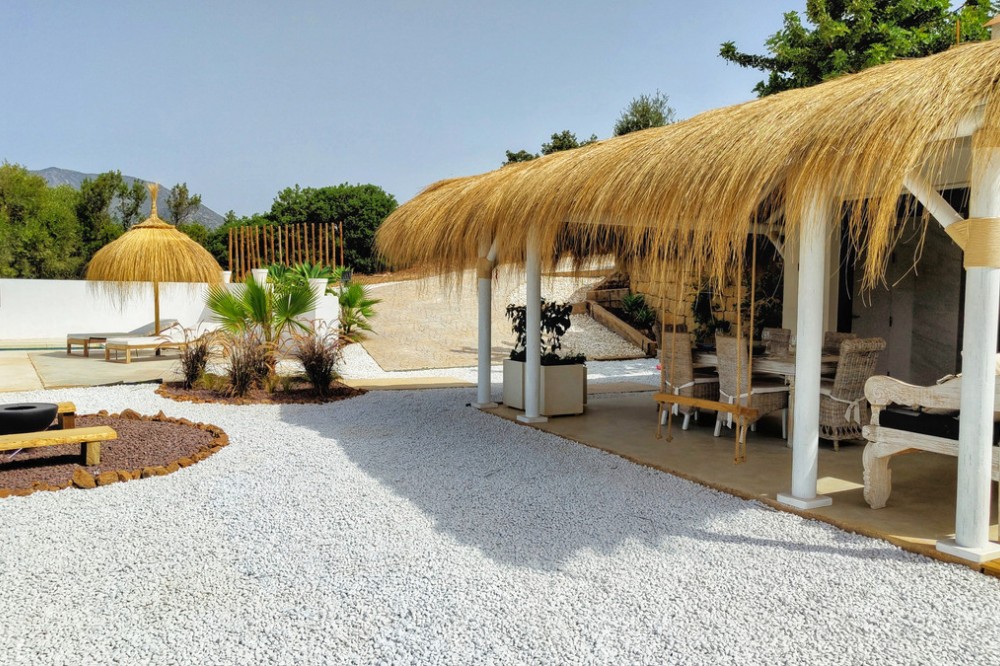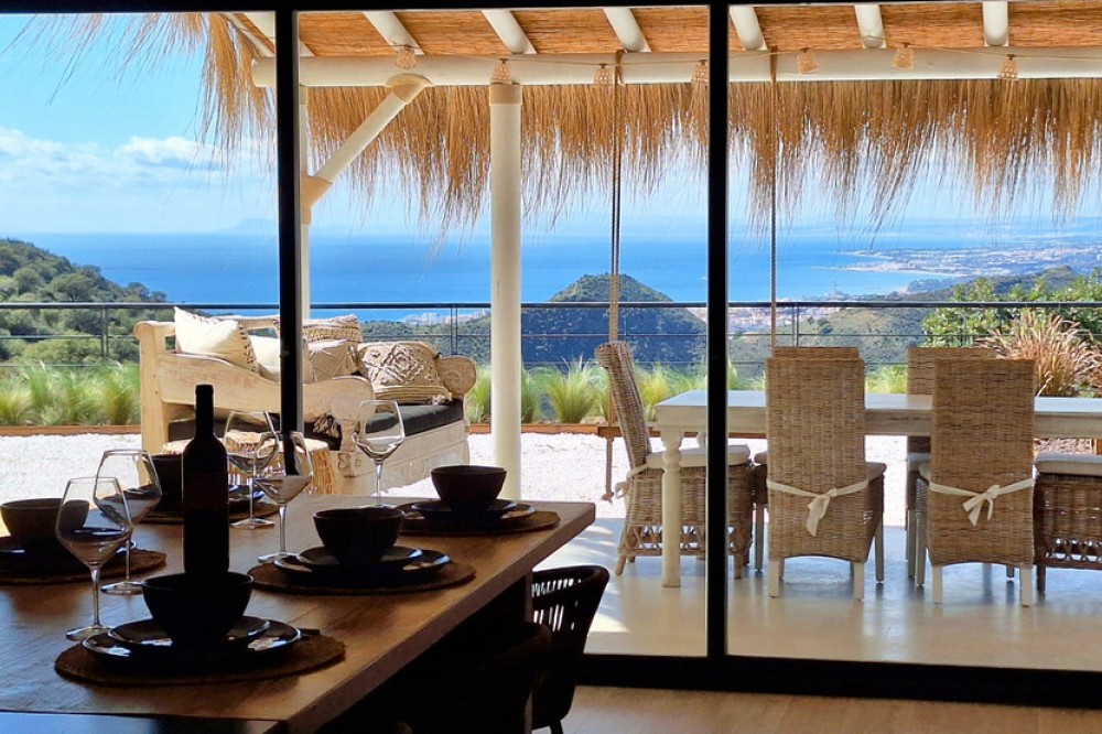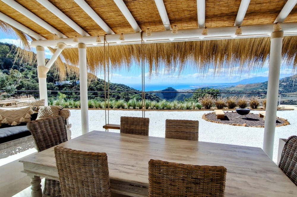 - Can you imagine waking up every morning surrounded by pure nature, in a private estate with panoramic views stretching across the Mediterranean, Gibraltar, and Africa? This hidden gem in the Altos de Marbella makes every day feel like a holiday.Set on a fully fenced 7,000 m² plot, this beautifully renovated countryside home is self-sufficient and environmentally conscious. Enjoy silence, privacy, and the natural beauty of a setting where only birdsong breaks the peace.The house offers two bedrooms — one with a dreamy walk-in wardrobe, and the other with an en-suite bathroom. The spacious, warm living room opens up to postcard-worthy views, while the fireplace makes every evening feel cozy and inviting. The open-plan kitchen, finished to a high standard and featuring a large wooden table for six, is ready for your best moments.Fully equipped with individual air conditioning units in every room, a solar panel system, its own water well, and a massive 50,000-liter water cistern — everything here has been designed for comfortable, private, and connected living without sacrificing modern comforts.The estate is planted with fruit trees — orange, fig, avocado, vines, and more — and is accessed via a well-maintained dirt road, just 10 minutes from the beach and 15 minutes from Marbella’s town center.Whether from your pergola-covered terrace or by the fireplace, every corner of this home offers a window into peace, beauty, and natural luxury.Only 10 minutes from Marbella’s iconic arch, Los Monteros beach, Playa del Cable, Costa del Sol Hospital, and ALDI supermarket.The abbreviated information document is available to you. Expenses: Taxes (ITP or VAT+AJD) + Notarial and registration expenses. AGB