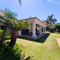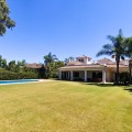 - Exclusive Luxury Villa on the Frontline Golf in San Roque Club Located in the prestigious San Roque Club, just a 5-minute walk from the Clubhouse, this magnificent 7-bedroom villa combines elegance, comfort, and an unbeatable setting. Set on a generous 2,214 m² plot, the property is distributed over 3 levels plus a tower, offering breathtaking views of the sea, mountains, and surrounding golf courses. At the heart of the villa lies a beautiful central patio with a fountain, a unique feature that fills the home with light and connects the ground-floor rooms. The patio also offers several charming sitting areas where you can relax in the shade while listening to the soothing sound of the water. This level includes 3 en-suite bedrooms, a fully equipped kitchen, a separate dining room, a cozy sitting room, an elegant and spacious main living room with fireplace, a bodega, a laundry room and a guest toilet. The first floor features three en-suite bedrooms, including the master suite with a dressing area and direct access to a spacious private terrace overlooking the golf course. The other two bedrooms enjoy beautiful sea views. The basement offers a garage with space for 4 cars, an additional bedroom with its own bathroom, and a leisure and games room. Outdoors, the property features a tropical garden with Mediterranean vegetation and a spectacular private pool, creating the perfect setting to enjoy the Andalusian lifestyle in an atmosphere of privacy and exclusivity. San Roque Club stretches across 136 hectares of oak-dotted landscape and boasts two championship 18-hole golf courses, both of which have hosted prestigious international tournaments. Close by is the prestigious area of Sotogrande, synonymous with refined living, offering a vibrant marina with fine dining, beach clubs, world-class polo, equestrian facilities, tennis clubs, and more. This is a rare opportunity to acquire a property that combines timeless luxury, authentic charm, and an unbeatable location within one of the most exclusive golf resorts on the Costa del Sol.