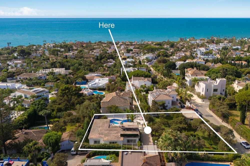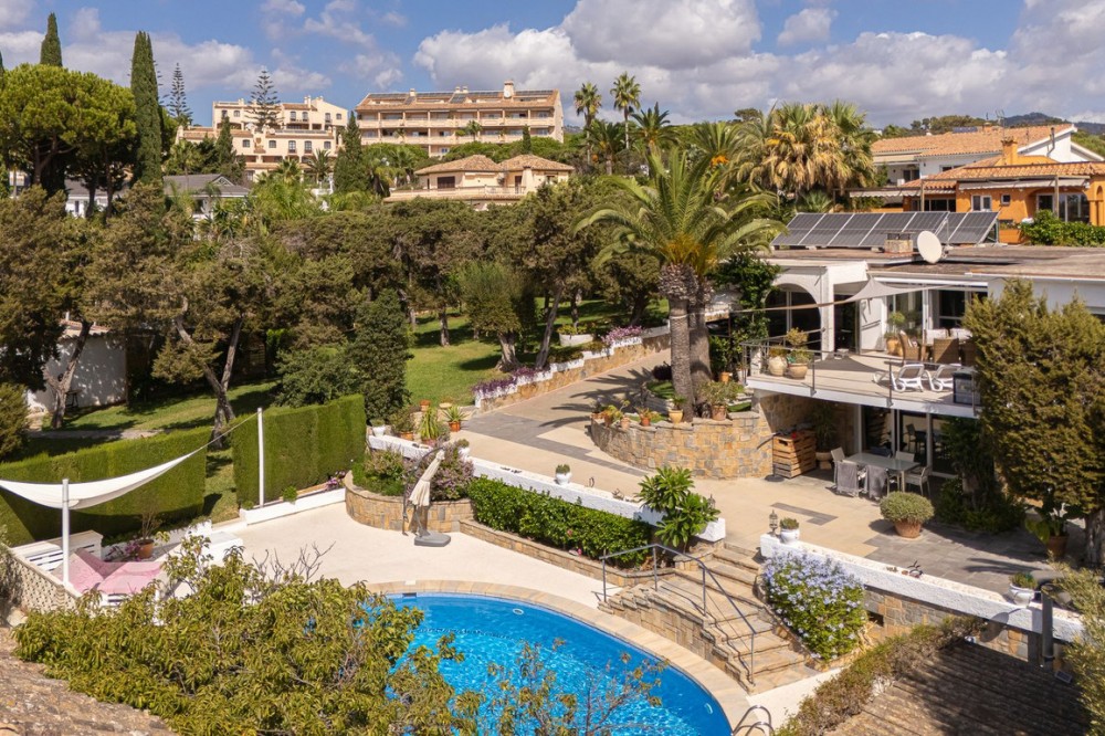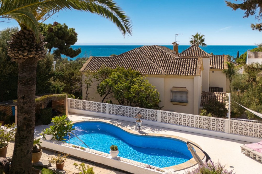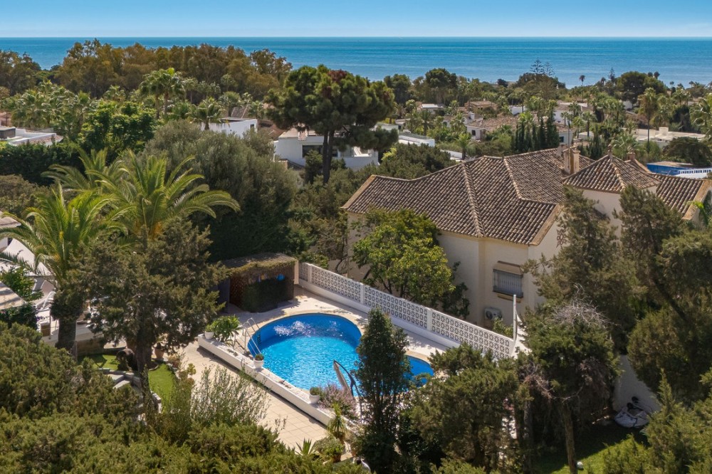 - LOCATION! LOCATION! UNIQUE opportunity to own a charming villa on a DOUBLE PLOT (1,676m²) in the very sought-after area of Marbesa, just a short walk to the beach and Simbad restaurant. Enjoy breathtaking SEA VIEWS from GROUND LEVEL! The property offers flexible living across TWO LEVELS: Independent guest level with large windows, kitchen, bedroom, and bathroom overlooking the garden and salt water pool. Main level with bright living/dining room on two levels, large kitchen, one bedroom + bathroom with a bath and master suite with ensuite bathroom (shower), bar area (easily converted to another bedroom), and covered terrace/BBQ leading to the pool, pool house & chill-out area. Outside, relax in the beautiful mature gardens, designed for the Mediterranean lifestyle. Parking: 2 large covered garages with windows & direct access to the property. 1 uncovered space + room for 3 additional cars behind the garden. This is a well-maintained hidden gem with incredible potential—perfect as a family home, holiday retreat, or investment. A must-see! Call us for a viewing today! It will be sold in no time!Detached Villa, Marbesa, Costa del Sol. 3 Bedrooms, 3 Bathrooms, Built 398 m², Garden/Plot 1676 m². Setting : Beachside, Close To Shops, Close To Sea, Close To Schools. Orientation : East, South East, South, South West, West. Condition : Good. Pool : Private. Climate Control : Air Conditioning. Views : Sea, Panoramic, Pool. Features : Covered Terrace, Fitted Wardrobes, Private Terrace, Guest Apartment, Double Glazing. Furniture : Optional. Kitchen : Fully Fitted. Garden : Private, Landscaped, Easy Maintenance. Parking : Garage, Covered, Open, More Than One, Private.
