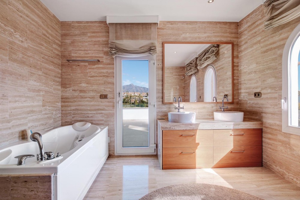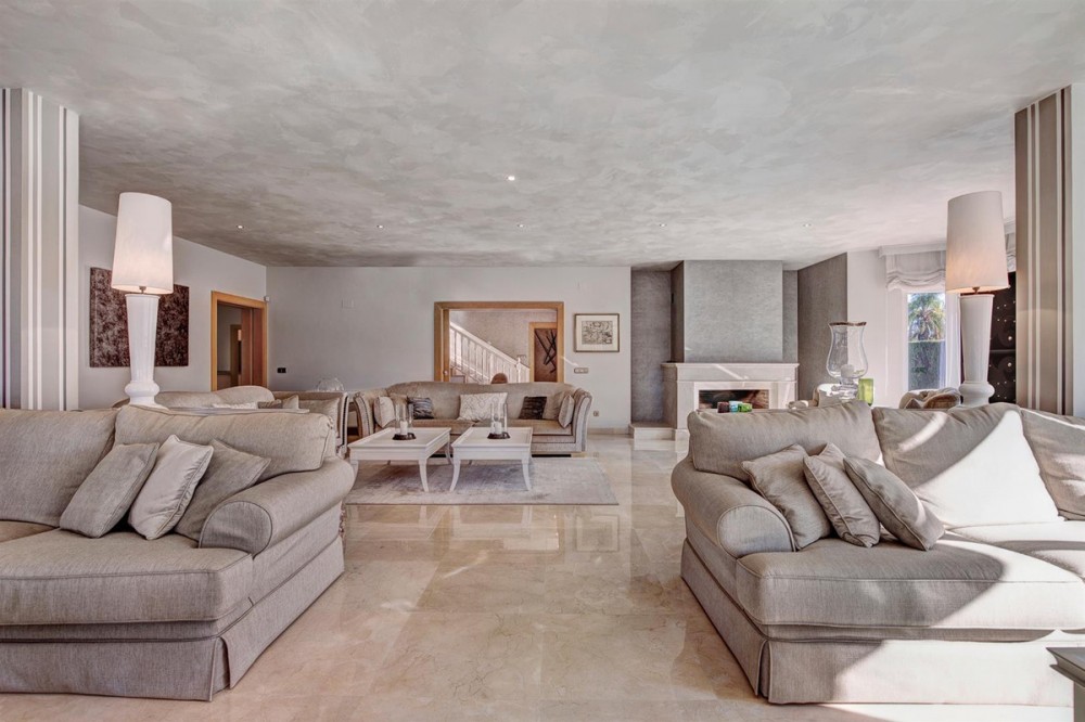 - A family villa situated in the highly sought-after residential area of Guadalmina Baja, in San Pedro de Alcántara. The 564 m² property boasts six spacious bedrooms and six bathrooms, on a generous plot of 1,880 m²; perfect for a large family wishing to settle in Marbella. The fully fitted kitchen is complemented by a separate laundry room and a dedicated storage area, while the living room offers several seating areas around a welcoming fireplace, all oriented towards the covered terraces and lush gardens. A private swimming pool and a barbecue area further enhance the outdoor lifestyle, while the well-maintained garden provides a tranquil retreat. The villa is presented in good condition and includes a variety of functional spaces. Fitted wardrobes are found in the bedrooms, while a games room and an office add to the versatility of the home. Balconies extend from several rooms, offering further opportunities to relax and enjoy the unobstructed views of La Concha mountain. Conveniently located close to shops and the town centre, this villa combines privacy with accessibility. Its proximity to local amenities, combined with its extensive spaces and practicality, makes it an outstanding choice for families seeking a comfortable and safe lifestyle in one of Marbella's most prestigious residential areas.