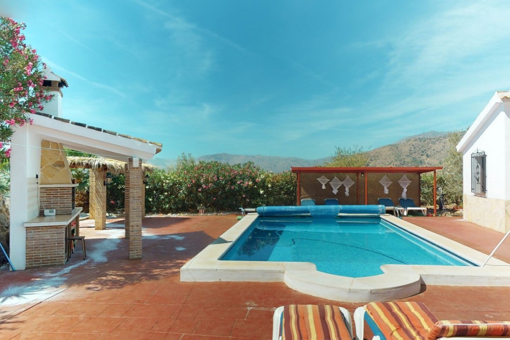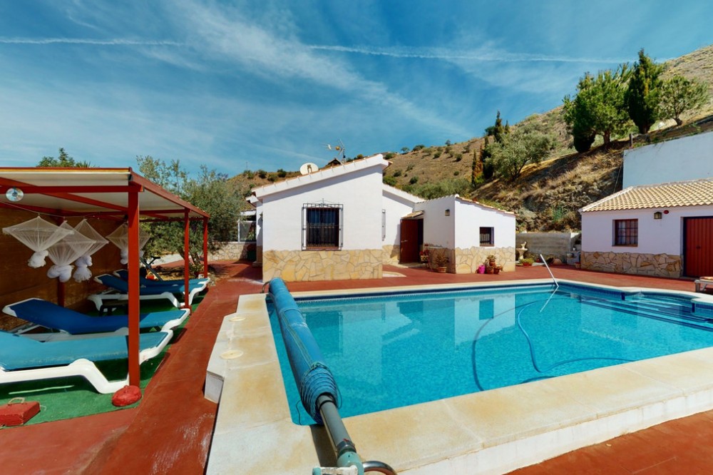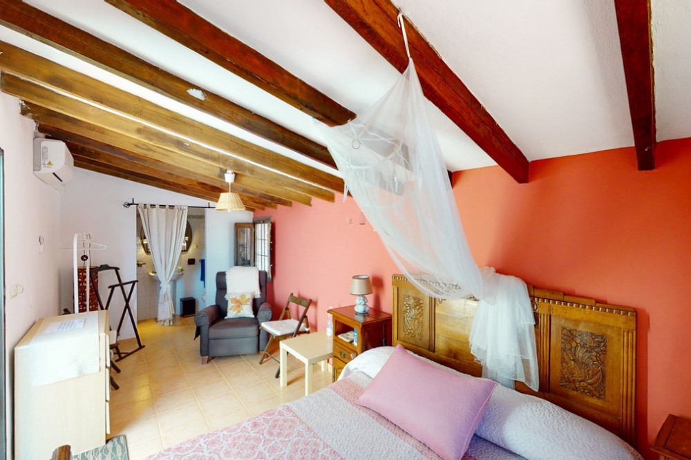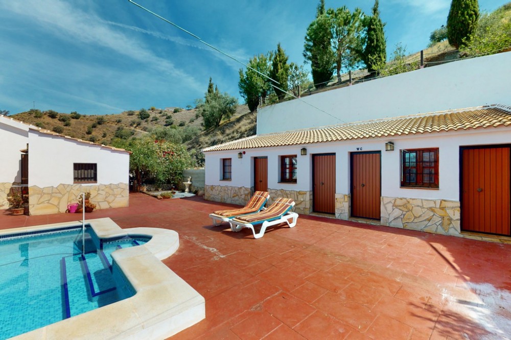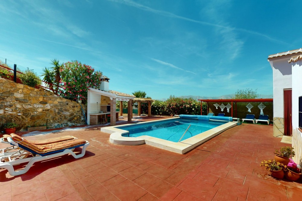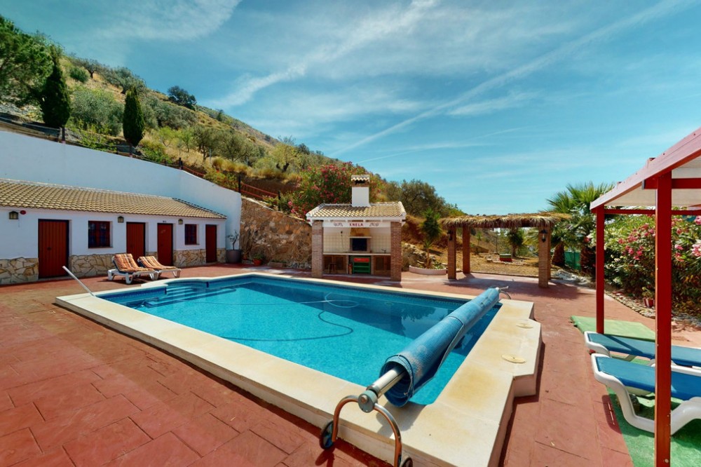 - Beautiful country house, with absolute privacy and spectacular views of the town, the countryside and the mountains, located five minutes from the town of El Borge. It has more than four hectares of land with olive trees, mangoes and vines. It has two large water tanks, one with 3,000L capacity and another one with 100,000L. In the outdoor area there is parking space for more than three vehicles, a pool with sun loungers, a bathroom and barbecue and it also has a small house, that could be made into a separate guest apartment. In the main house we find a large kitchen with a dining room, a spacious living room with a fireplace and an winter garden. There are also two bedrooms and a room, that could be used as another bedroom. One would just have to add a door. A separate guest apartment with an bathroom on-suite is located right next to the main house. The house is licensed for rural rentals and produces interesting annual benefits. This is a perfect home for residential use or as an investment. We are pleased to be able to present this dream property to you soon, either personally or via virtual viewing. Because this world, it is unique - just like our Axarquía. In Andalusia. On the Costa del Sol. Here, on the sunny side of life...