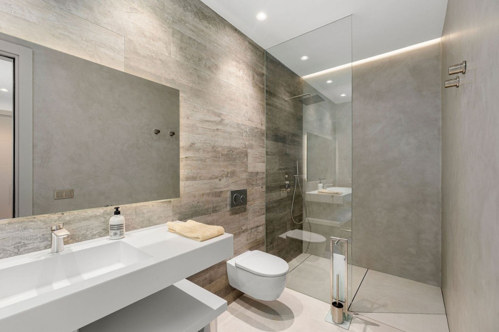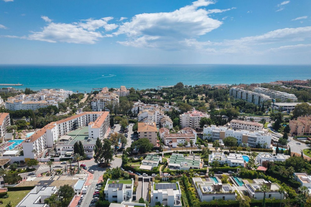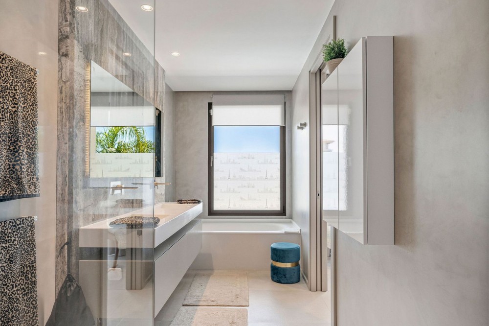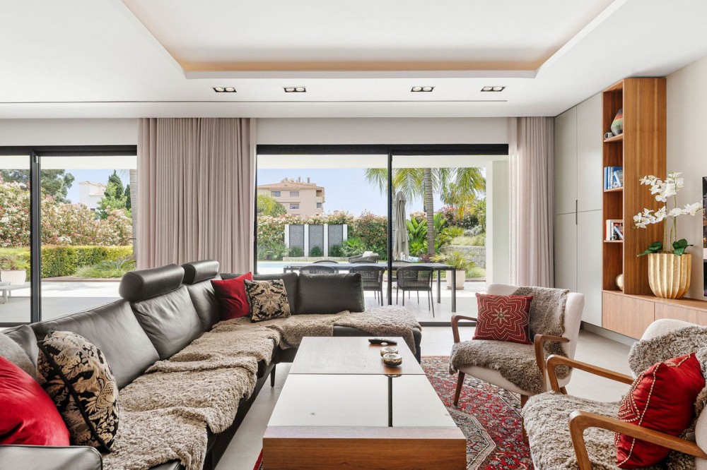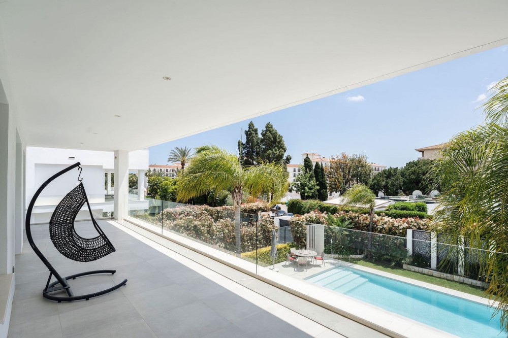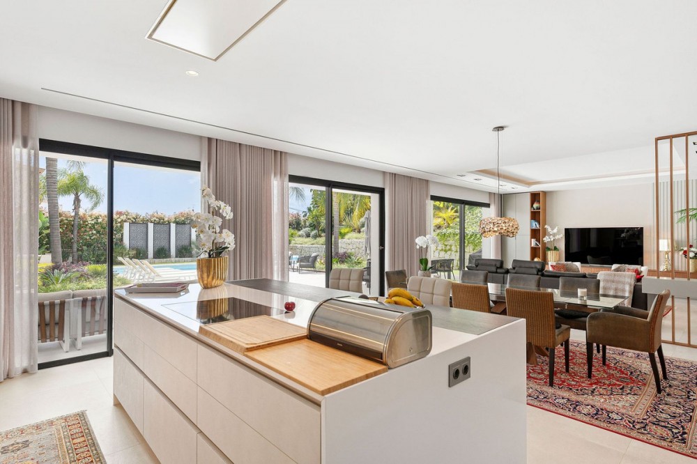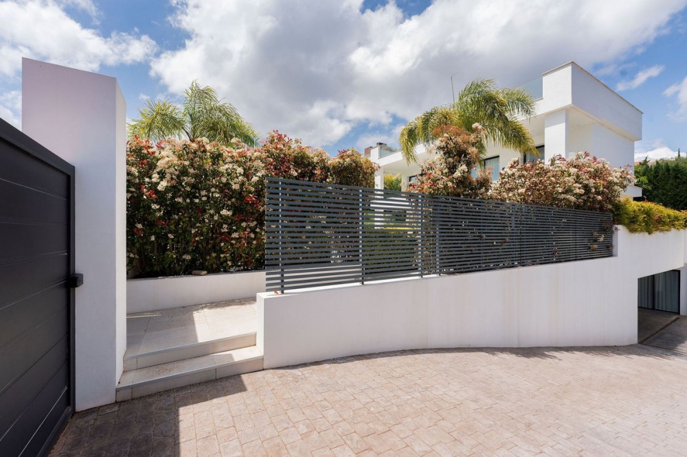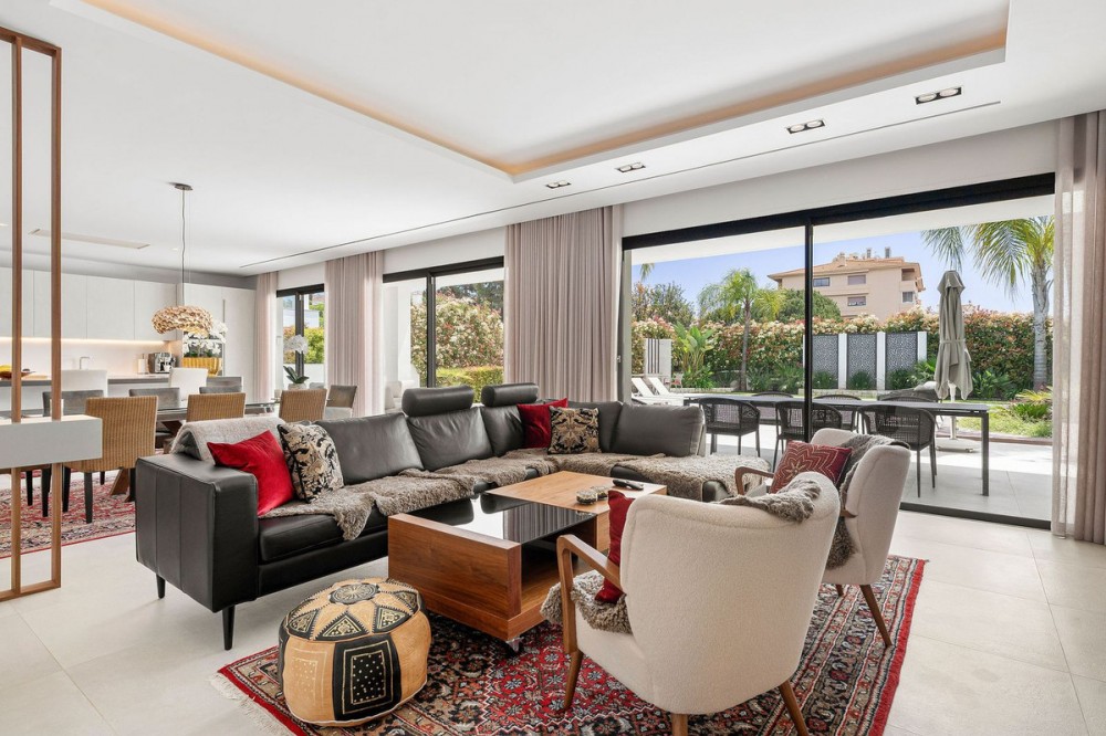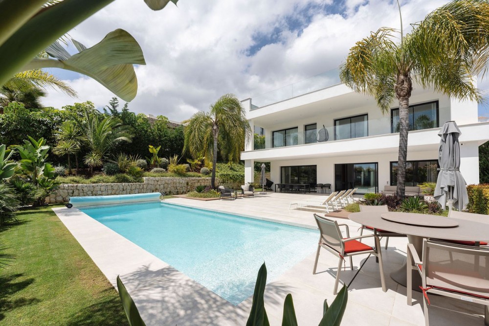 - Welcome to this modern and very well built house in the lower Nueva Andalucia area. As you enter you are greeted with a large open kitchen that leads to the dining and living area, from here you can access the large covered terrace and onto the pool area with ample space for sunbathing and with an outdoor shower. On the main floor you have a bedroom onsuite currently used as an office. On the first floor you have 3 bedroom onsuite, all with access to a covered terrace. From here you have stairs leading onto the solarium which has been fitted with solar panels yet leaving space to create an entertaining space. In the basement floor floor you have the laundry area, a 2nd guest toilet, a bedroom suite, a large room that could be used as a cinema room etc and lastly a large garage for up to 4 cars. All floors are accessed by stairs or an elevator. The technology in the house is modern with water based underfloor heating powered by aerothermic system, the ac is thorugh the Airzone system, water filters & solar panels make this house very efficient to live in. A house in a very central position makes this a perfect all year living or a holiday home with the added bonus of being an attractive rental property due to its size and location.