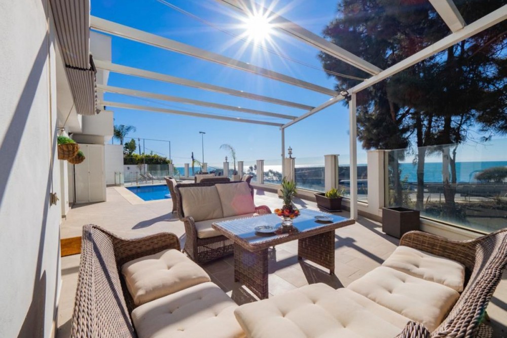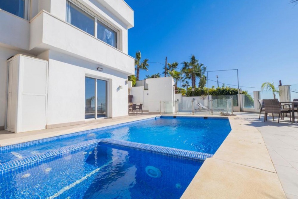 - MAGNIFICENT and incredibly bright and spacious villa, fully reformed recently with absolutely stunning sea views from both floor levels!!! Located in the lovely El Chaparral area, with its award winning golf course and superb clubhouse, just a short drive to the centre of both La Cala and Fuengirola, this superb property is just a dream! The property has 2 very spacious lounge-dining rooms, modern open plan fully fitted kitchen, 6 very large double bedroom suites with fitted wardrobes and ensuite bathrooms plus a guest bathroom. There are 2 lifts: one within the house connecting the 2 floor levels and another from the garage to the garden level. The outdoor space is carefully thought out and designed for easy maintenance. Large terraces surround the house, affording sunshine or shade at all times. The front terrace area is south facing, with pool and integrated jacuzzi, shaded areas for dining and an outdoor kitchen. To the rear of the property is a lawned and more secluded shady area with another pool....perfect for a good swim and peace and quiet away from the rest of the family!! The property is sold with some furniture if the buyer wishes, electric blinds at all windows, alarm system and many more extras. And....just a few minute' s walk to the lovely sandy beaches of the area and the numerous beach restaurants. The property also has a tourist licence for holiday rentals!