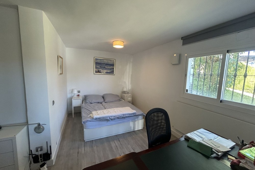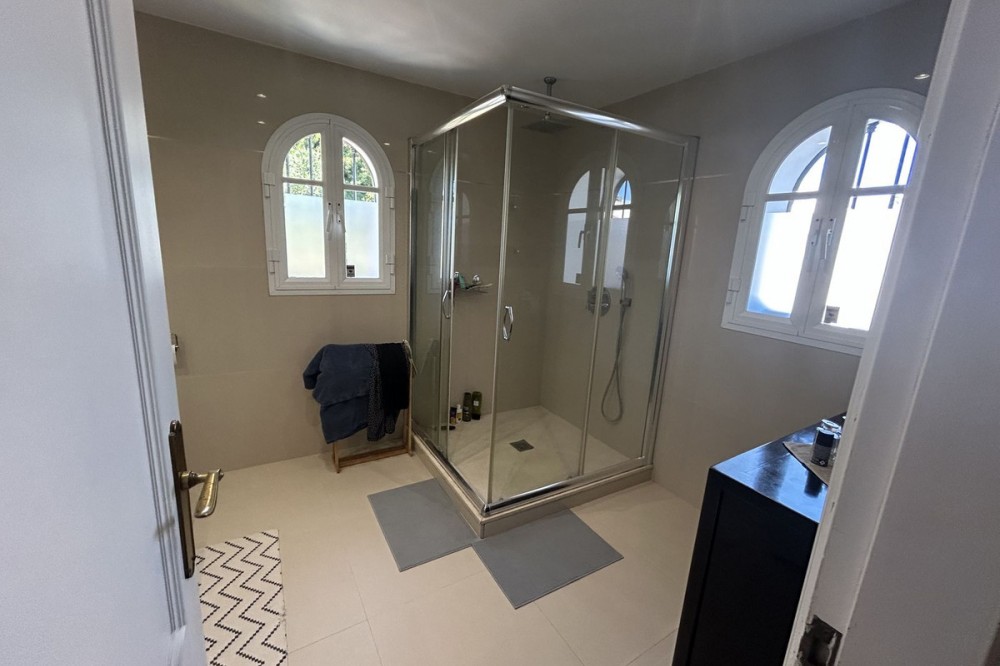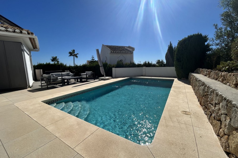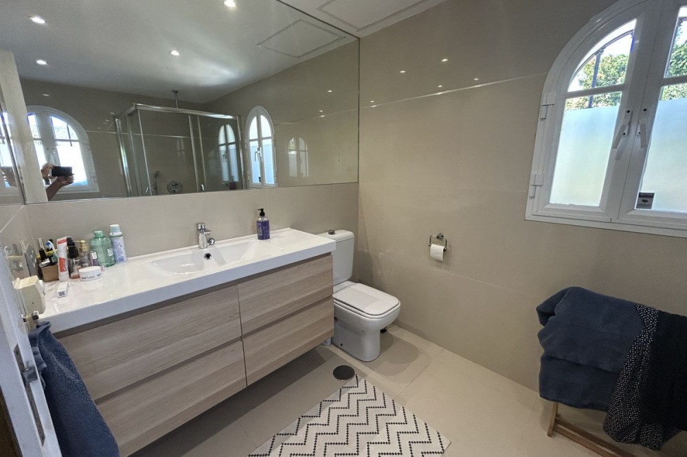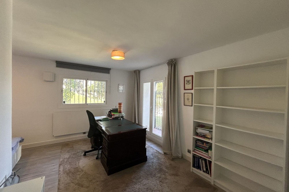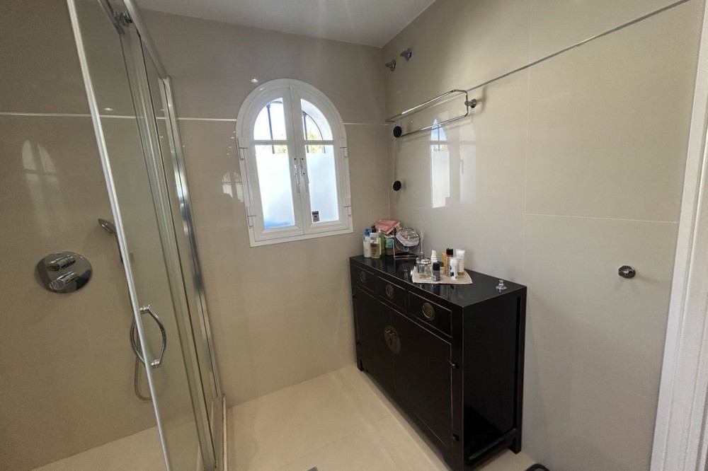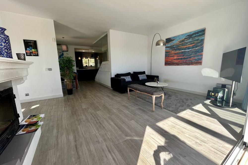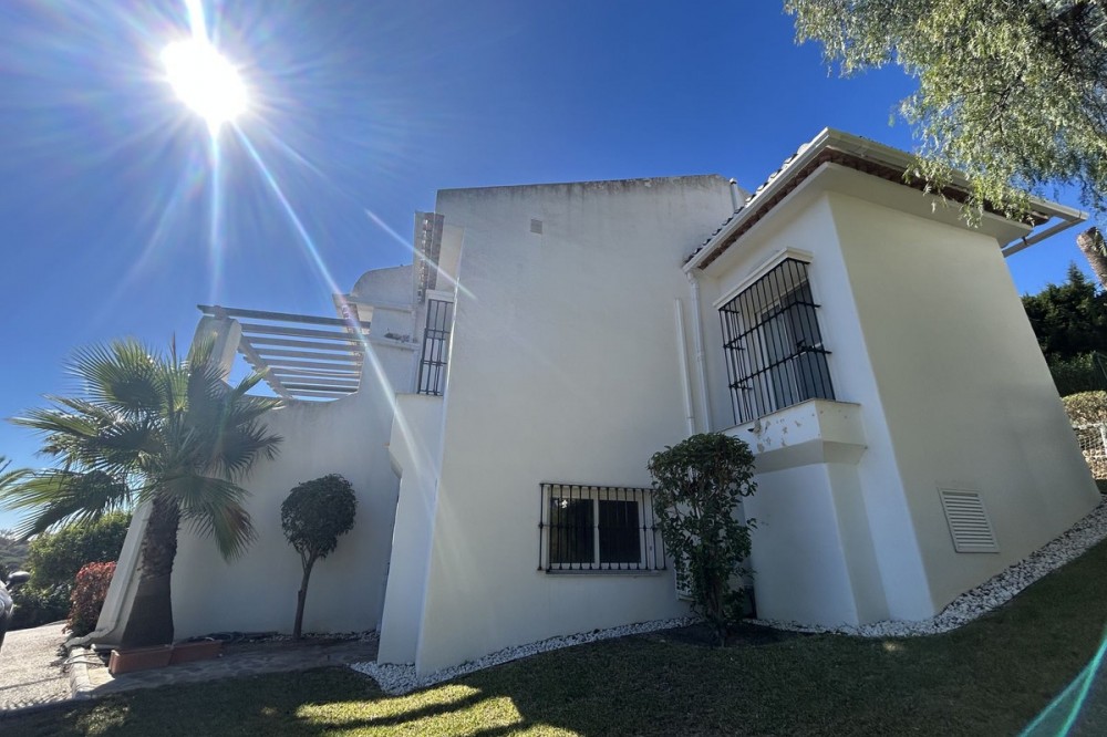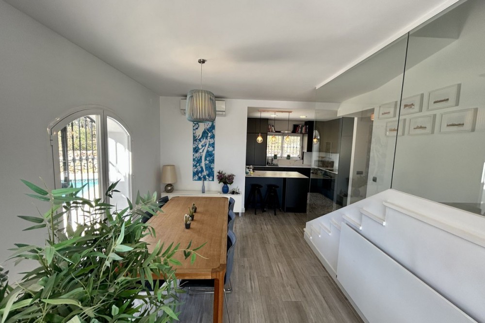 - Discover this beautiful detached Villa that offers an abundance of privacy, nested in the heart of Elviria. Situated in a well maintained gated residential community of 19 Villas, it's surrounded by nature and is only a 5 minute drive away from sandy beaches and amenities. Refurbishments in 2019 included converting the ground floor and garage area into an ample game & family room which can be used as a 5th bedroom. This entire floor can also be transformed into a separate 1 bedroom apartment with open plan living room and kitchen. It has a lot of natural light thanks to a large window and 2 double glass doors that lead outside. You access the property up a private driveway with 2 parking spaces. Going up few stairs you then enter the Villa and find yourself in the bright open concept design, where the living room, dining room and kitchen blend together effortlessly, keeping everything within easy reach. From the living room with a fireplace, you access a sunny terrace with pergola from where you can enjoy nice views to the sea and surroundings. From the dining room and fully fitted modern kitchen you access the private pool area with a large terrace and fenced garden. This entire main level has a seamless, practical and functional flow, adding 2 bedrooms and a bathroom with walk in shower and underfloor heating. The living & dining room as well as the 4 bedrooms and game room offer high-quality infrared heaters by Redwell, known for energy efficiency, they are maintenance-free and feature safety thermostats to prevent overheating. On the upper floor you find the main bedroom with a large bathroom with underfloor heating and a terrace with pergola from where you have lovely sea views. Once you go down to the lower level you find another large bedroom with access to the garden, a good sized bathroom with a walk in shower, the laundry room and the ample game room where you have a large double sliding door with electric shutters and a lot or wardrobe storage space. As mentioned before, this can be used as a 5th bedroom or can be made into a cozy apartment. The Villa is on a 568m2 plot which is part of the Acacias Park community but for private use only and the gardens are maintained by your own gardener. Other features of this property include: gated community with modern app-controlled access. Sea views. Private pool with outdoor shower, fenced in garden, terraces and BBQ. Infrared heaters. Rain gutters. Solar panels for water heating. New air conditioning units with filters. Preinstalled alarm system. Electric underfloor heating in the 2 main bathrooms. Fireplace in the living room. Partially furnished. In addition, the complex offers a large communal pool with club house and BBQ area and a Tennis court. Mediterranean charm and prime location provide both tranquility and convenience making this a hidden Gem in one of Marbella's most desirable and prestigious areas. Within a 5 minute drive you will find bars, restaurants, cafes, shops and facilities for comfortable living. There are golf courses, famous tennis and beach clubs and schools within a short distance: The Málaga International Airport is a 30 minute drive away. The center of Marbella is less than a 10 minute drive away.