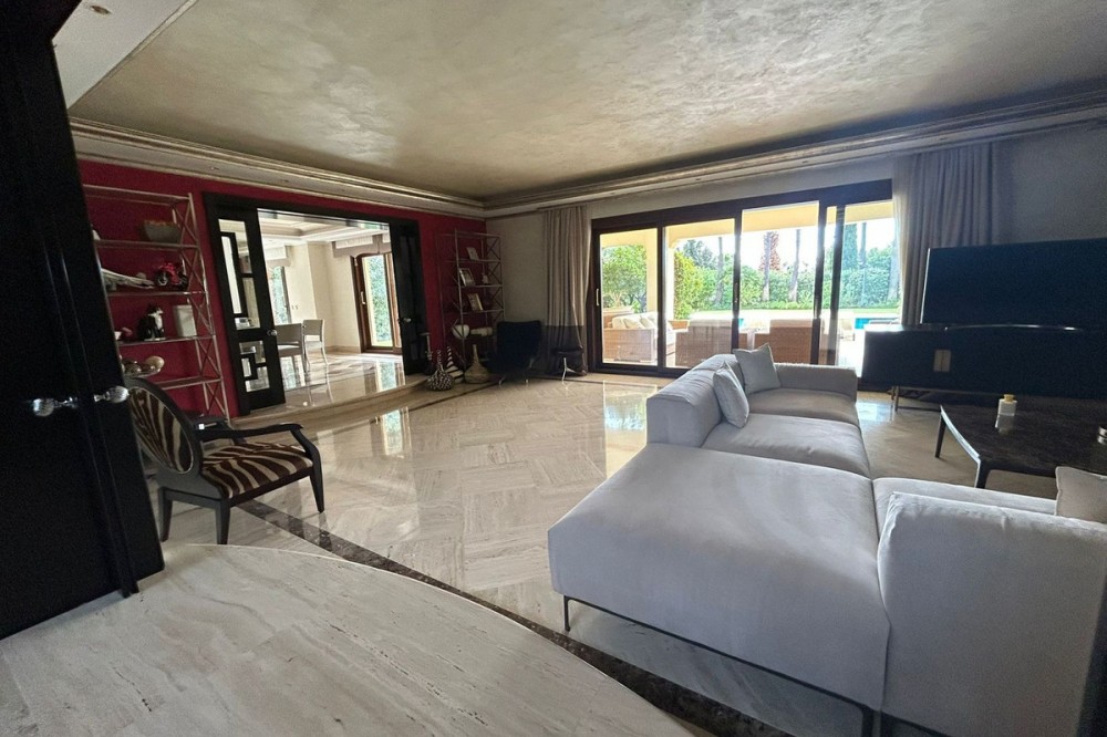 • Situated on one of the most prestigious roads in Sierra Blanca, this magnificent villa embodies the essence of Marbella luxury living. Set on an expansive plot of almost 2,000 m², the property enjoys total privacy, lush gardens, and breathtaking sea views. The villa extends over 985 m², featuring seven bedrooms and seven bathrooms, designed with refined Mediterranean architecture and timeless elegance. The master suite includes a private terrace and large walk-in wardrobes, creating a sanctuary of comfort and sophistication. The property boasts a 350 m² lower level with a fully equipped gym and sauna, an elegant bar area, and a spacious garage for multiple cars. The outdoor spaces feature beautifully landscaped gardens and a swimming pool surrounded by generous terraces for dining and relaxation. In excellent condition and requiring only minor refurbishment, this home represents a rare opportunity to acquire an exceptional property in Marbella’s most exclusive gated community — a blend of classical style, tranquility, and panoramic Mediterranean views.