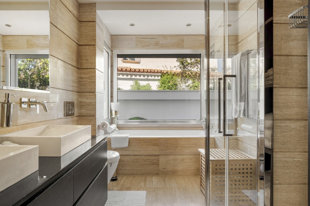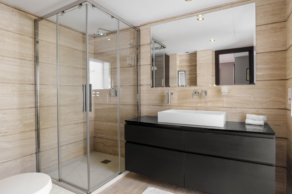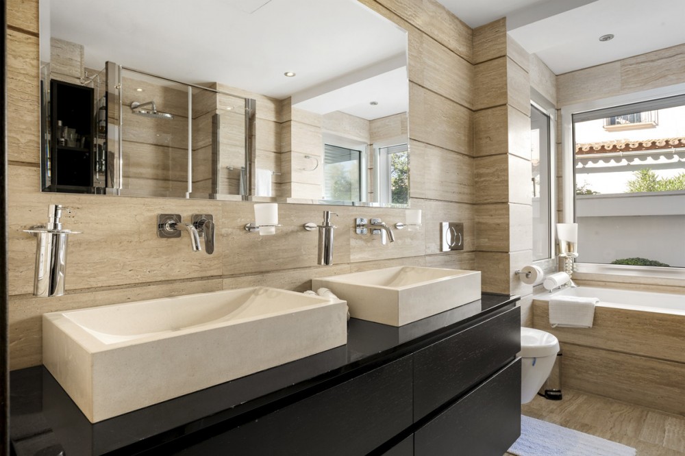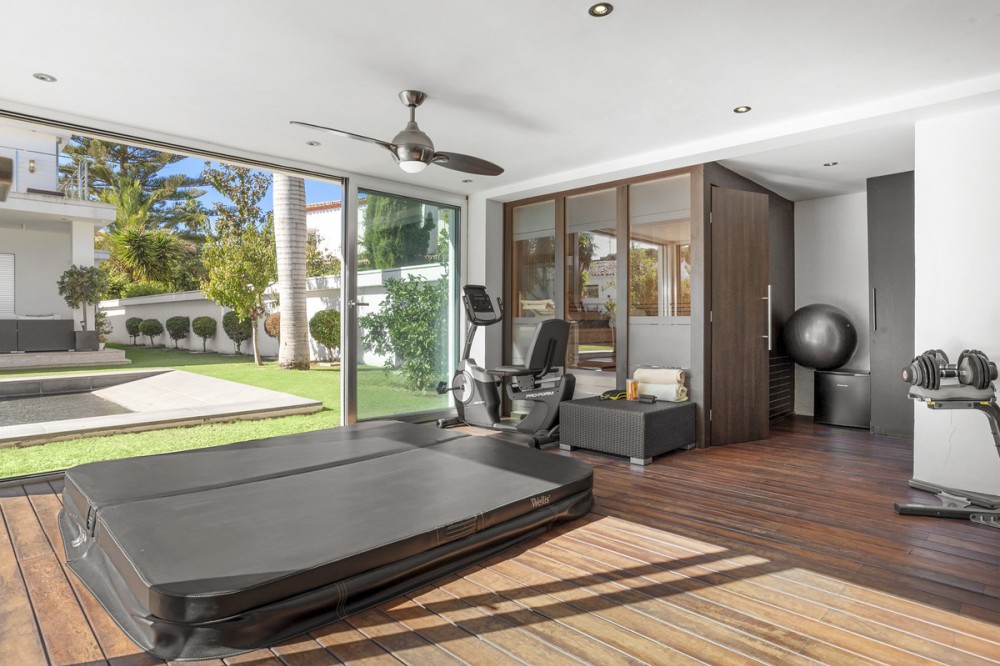 - Ideally located in the heart of Nueva Andalucía, this elegant contemporary villa combines modern design, Mediterranean charm, and a prime Marbella address. Within walking distance to Centro Plaza and Puerto Banús, the property enjoys one of the most convenient and desirable settings in the area — perfect for both living and investment. Despite its central location, the villa offers exceptional tranquility, as it is situated on a quiet dead-end street with no through traffic. Built over two floors on a generous 843 m² plot, the villa offers 350 m² of built space plus 133 m² of terraces and porches, creating a perfect indoor-outdoor flow. In addition, it features a spacious 50 m² garage and a beautifully designed 50 m² gazebo, offering a shaded retreat with a fully equipped outdoor kitchen, lounge, and dining area — ideal for relaxing or entertaining under the Marbella sun. The open-plan living area with double-height ceilings connects seamlessly with the terraces, the garden, and the private pool, ideal for entertaining or unwinding in style. The pool itself is finished with natural lava stones, creating a striking aesthetic and a luxurious touch. The modern kitchen is fully equipped and includes a dedicated fridge room with ample space for storing food, drinks, and supplies — a practical and luxurious feature that enhances everyday living and entertaining convenience. Featuring four spacious bedrooms, each with an en-suite bathroom, and two guest toilets, this home offers exceptional comfort and privacy. Throughout the property, you’ll find underfloor heating in every room, independent hot and cold air-conditioning units, and ipe wood flooring, ensuring the highest standards of luxury and comfort. On the lower level, there is an exclusive cinema and music room, built to an extremely high specification with a bulletproof surround system — a level of acoustic quality unmatched in Marbella. Connected to the garage, there is also a 12 m² storage room providing additional convenience. The wellness area includes a private gym, sauna, jacuzzi integrated into the floor, and a full bathroom, creating a perfect space for relaxation and wellbeing. From the upper terrace, you already enjoy partial golf and mountain views, and the property also offers excellent expansion potential. It is possible to build an exterior staircase along the side of the house leading up to the terrace, as well as to add an additional 100 m² roof terrace — further enhancing the panoramic views, outdoor living space, and overall value of the property. Thanks to its location, design, and rental appeal, this villa is one of the best options for both short-term and long-term rentals, generating an impressive ROI (Return on Investment) and a strong passive income potential. Close to world-class golf courses, beaches, restaurants, and international schools, this property represents a rare opportunity to own a luxury home in one of Marbella’s most sought-after areas — elegant, private, and highly profitable. All furniture is included in the price.