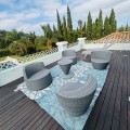 - Stunning villa located in the prestigious San Roque Club urbanization, one of the best golf courses in Andalusia, with private access and 24-hour security, including a guardhouse and security officer throughout the development. This magnificent villa boasts unobstructed views of the golf course and mountains. Situated on a 2,250 m² plot with a 600 m² built area, it is distributed over three floors. It comprises six spacious bedrooms, each with an en-suite bathroom and dressing room. One of the bedrooms also features a Turkish bath. The grand living room is spectacular, opening onto the garden and swimming pool. The immense kitchen is equipped with luxurious details and Miele appliances. The dining room is conveniently located adjacent to the kitchen, and there is also a large room dedicated to an exclusive wine cellar. A separate apartment with its own kitchen is also included on the ground floor. The garden area features a chill-out zone, a pool table, a dining area, a barbecue, a fully enclosed gym, and an enormous 12x6 meter swimming pool! At the rear, there's a closed garage for two cars and additional parking space outside but still within the private property. This villa also features underfloor heating and a Sonos sound system. Your dream villa is available for viewing.