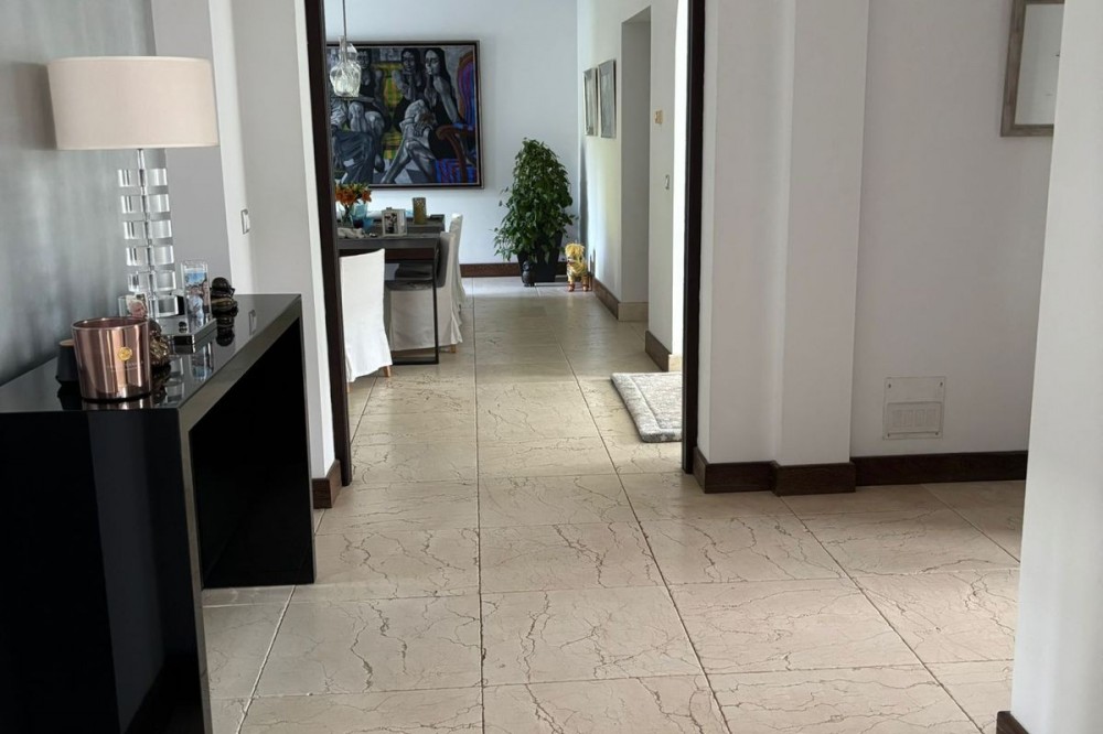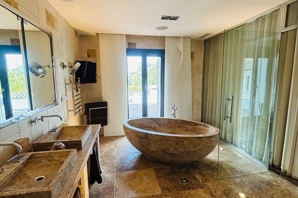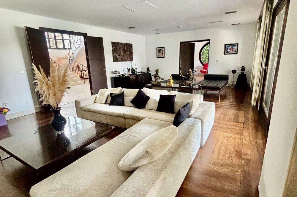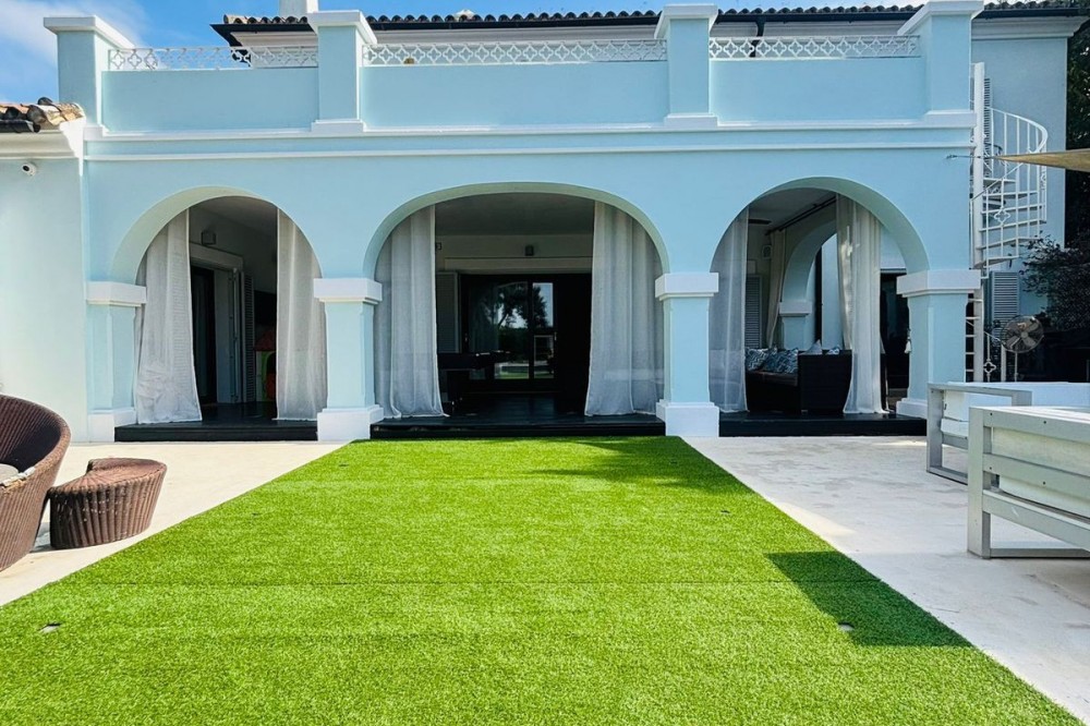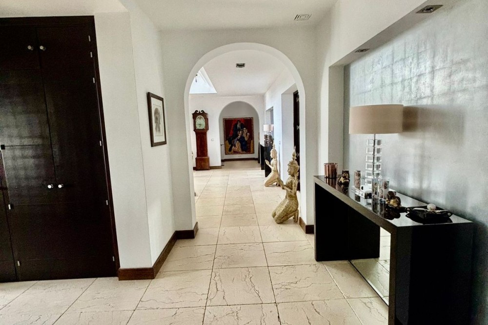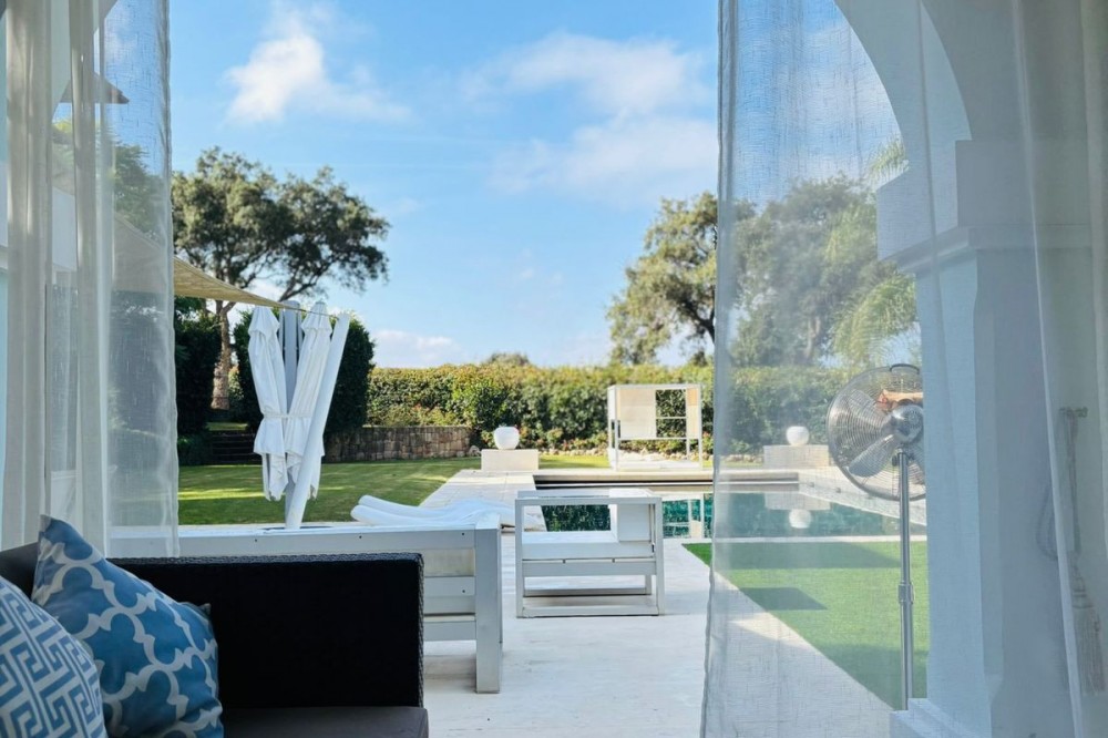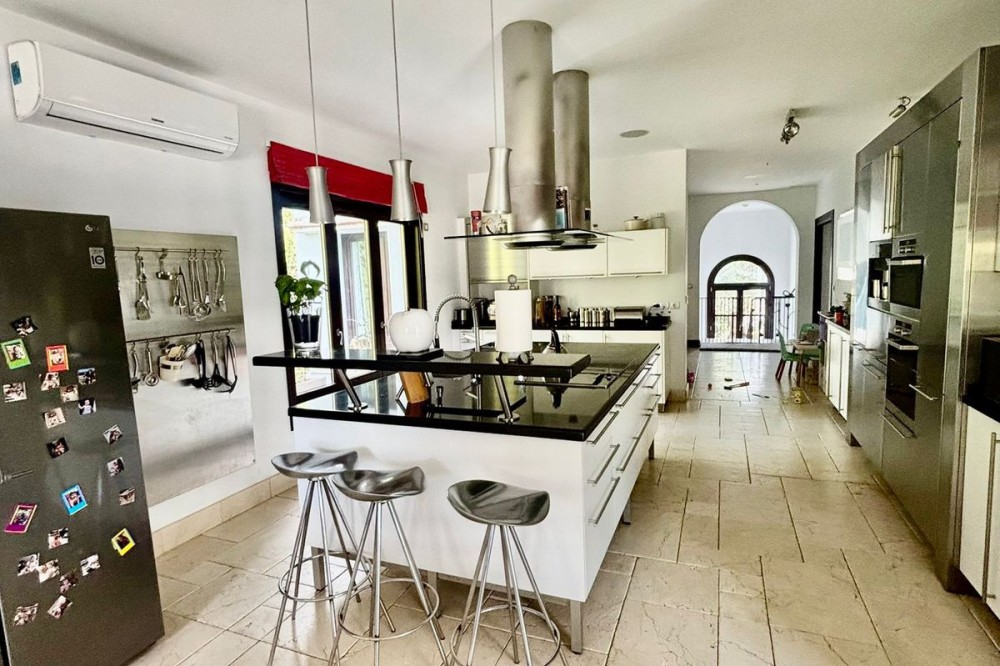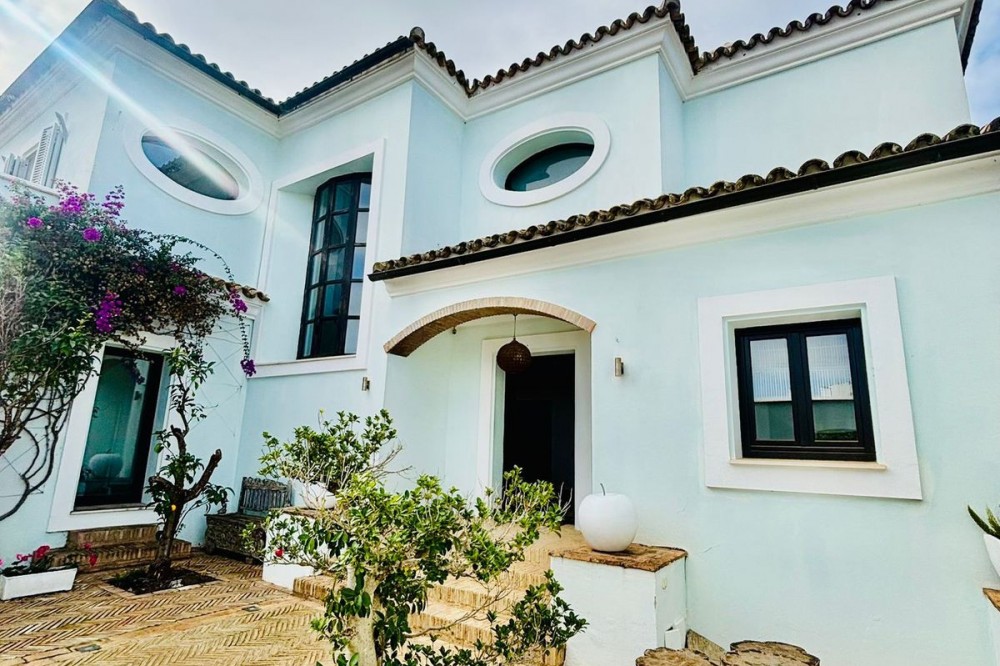 - Stunning villa located in the prestigious San Roque Club urbanization, one of the best golf courses in Andalusia, with private access and 24-hour security, including a guardhouse and security officer throughout the development. This magnificent villa boasts unobstructed views of the golf course and mountains. Situated on a 2,250 m² plot with a 600 m² built area, it is distributed over three floors. It comprises six spacious bedrooms, each with an en-suite bathroom and dressing room. One of the bedrooms also features a Turkish bath. The grand living room is spectacular, opening onto the garden and swimming pool. The immense kitchen is equipped with luxurious details and Miele appliances. The dining room is conveniently located adjacent to the kitchen, and there is also a large room dedicated to an exclusive wine cellar. A separate apartment with its own kitchen is also included on the ground floor. The garden area features a chill-out zone, a pool table, a dining area, a barbecue, a fully enclosed gym, and an enormous 12x6 meter swimming pool! At the rear, there's a closed garage for two cars and additional parking space outside but still within the private property. This villa also features underfloor heating and a Sonos sound system. Your dream villa is available for viewing.