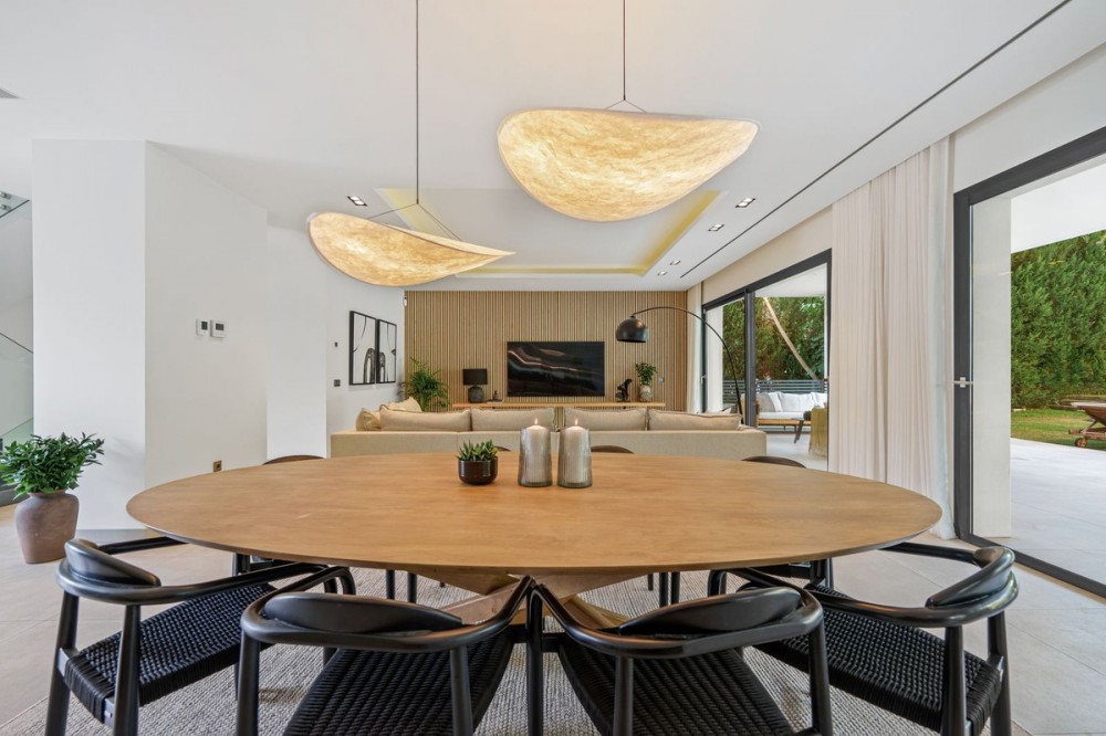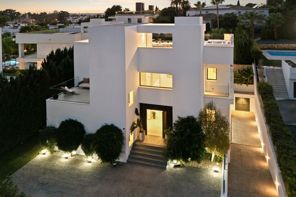 - Situated in the highly desirable area of Nueva Andalucía, just minutes from the vibrant marina of Puerto Banús, this contemporary residence blends modern elegance with exceptional comfort and practicality. Designed with open-plan living in mind, the home features expansive sliding glass doors that blur the boundaries between indoor and outdoor spaces. Sunlight floods the spacious lounge and dining areas throughout the day, while the sleek, fully equipped kitchen—complete with refined cabinetry and a large central island—offers the ideal space for casual meals and social gatherings. The exterior of the property is equally impressive, offering a collection of beautifully arranged terraces positioned for both relaxation and entertainment. A private garden with a sparkling pool creates a tranquil retreat, perfect for sunbathing, hosting friends, or enjoying quiet family moments. Crowning the home is an impressive rooftop solarium that elevates the lifestyle experience, featuring a jacuzzi, an alfresco dining area, a built-in barbecue, and sweeping views of the surrounding neighbourhood. Inside, each bedroom has been designed with a refined sense of style, offering fitted wardrobes, elegant ensuite bathrooms, and a warm, inviting atmosphere. The residence also includes a private cinema and entertainment room, ideal for movie nights or gaming, as well as a fully equipped home gym for wellness enthusiasts. A secure private garage provides added convenience. With its sophisticated design, premium amenities, and prime location close to beaches, renowned golf courses, shops, and restaurants, this property offers an exceptional modern lifestyle in one of Marbella’s most sought-after communities.