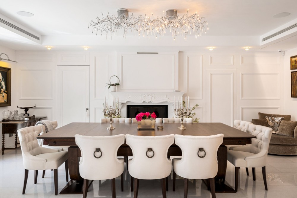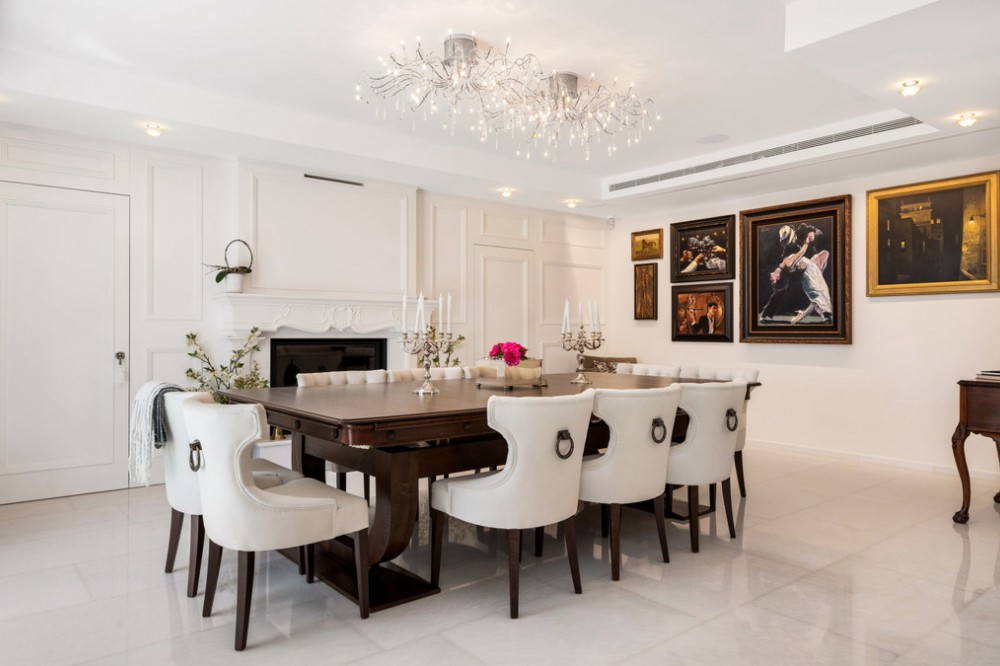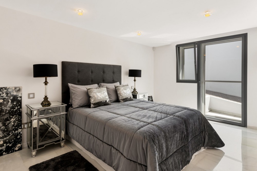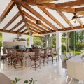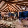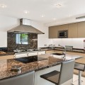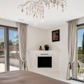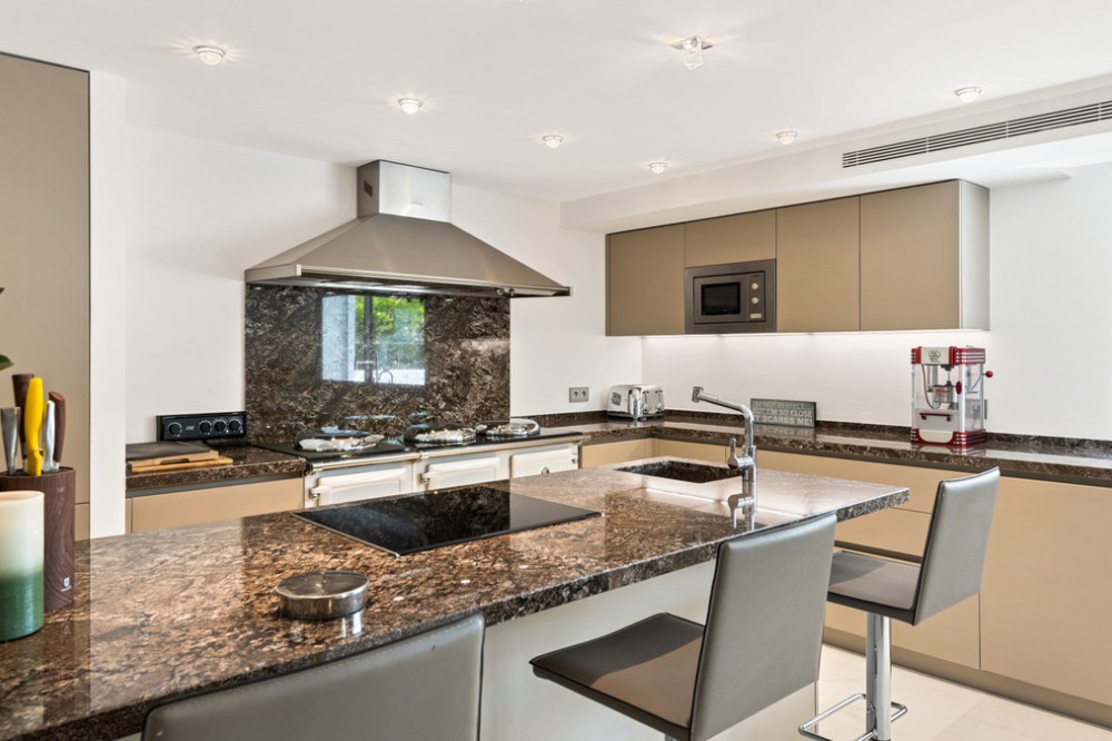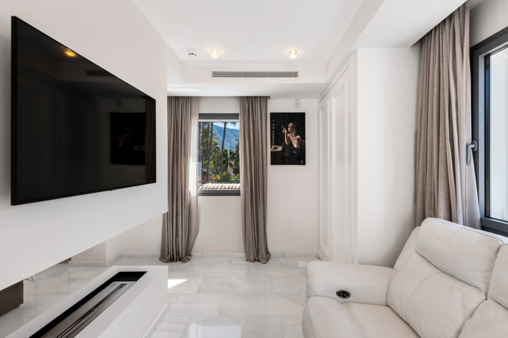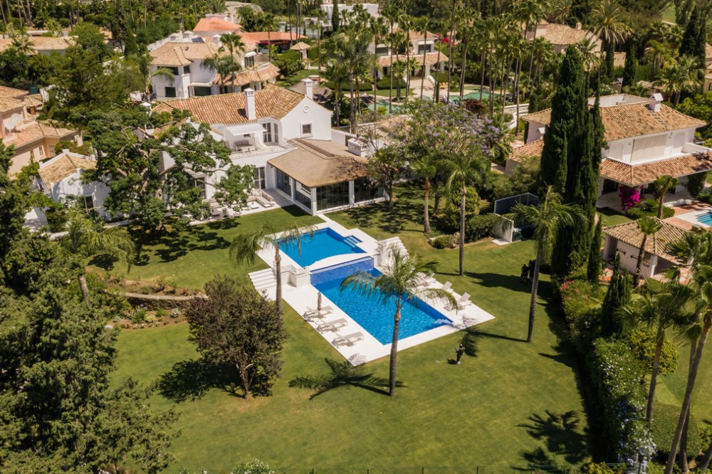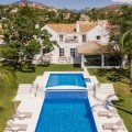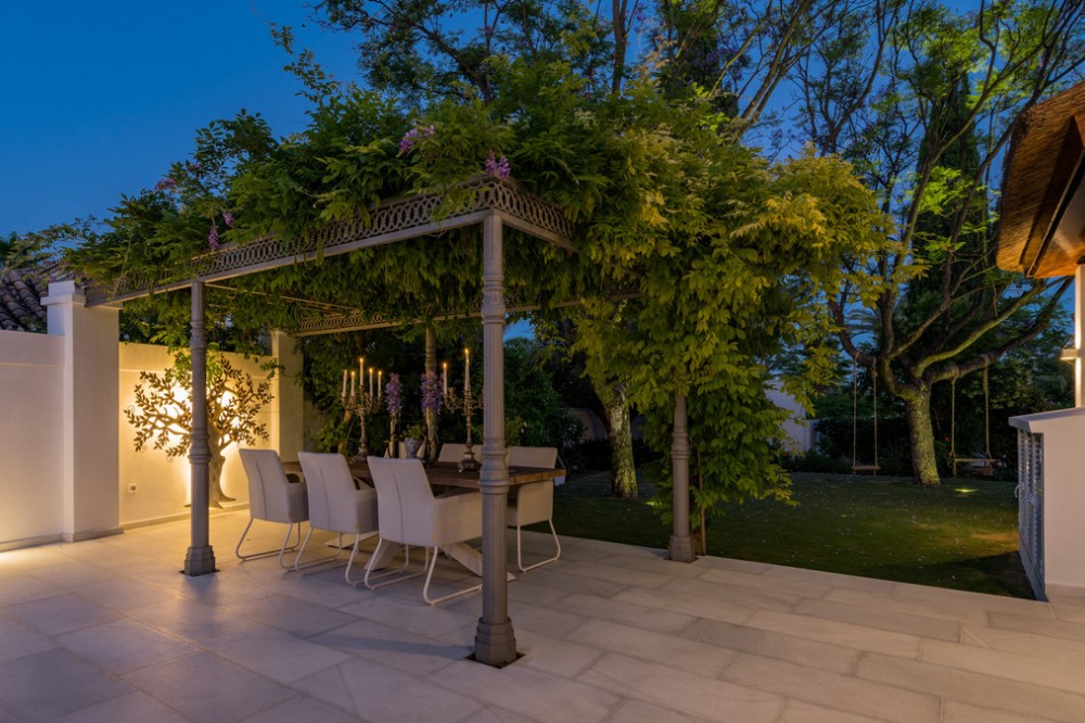 - Villa Hermosa in La Cerquilla sits on a generous 2,671 m² plot and offers six spacious bedrooms, blending elegant interiors with inviting outdoor spaces. Across from the bedroom wing is a lush vertical wall garden, ensuring every room enjoys a refreshing green view. For added convenience, a private stairway leads from the carport directly to the bedroom level, allowing occupants easy access without passing through the main house. The home’s main living area features a stylish curved sofa set around a sleek fireplace, built-in shelving with accent lighting, and large framed artwork that adds warmth and character. A separate formal dining room includes a long wooden table with upholstered chairs, twin chandeliers, and another fireplace, creating a refined setting for entertaining. The modern, well-equipped kitchen showcases taupe cabinetry, dark stone countertops, and an island cooktop. An adjacent dining space opens to the gardens, while a separate lounge with exposed wood beams, a bar, and a stone fireplace connects seamlessly to the terrace and pool area. These interiors combine contemporary finishes with classic details, providing both comfort and functionality. Outside, the villa boasts a large swimming pool with an elevated section and waterfall feature, surrounded by manicured lawns and mature trees for privacy. Multiple seating and dining areas, including a tiled courtyard with a decorative fountain, invite year-round enjoyment of Marbella’s climate. Expansive glass walls and terraces create an easy indoor-outdoor flow. Notably, the property offers one of the rare direct entrances to Los Naranjos Golf, with thoughtfully designed pathways wide enough for a golf buggy. Modern amenities include a zoned air-conditioning and underfloor-heating system that can be individually configured for each room—so one bedroom can be heated while another is cooled. A full home-automation (domotic) system integrates with iPads, iPhones, and other smart devices, and can be managed remotely for effortless control. With its six bedrooms, ample living spaces, landscaped gardens, and unique golf access, Villa Hermosa delivers both scale and style—a private retreat in the sought-after La Cerquilla neighborhood, close to premier golf courses, beaches, and all of Marbella’s amenities.