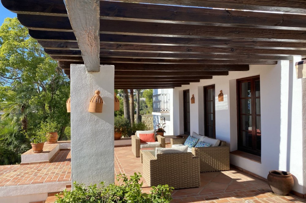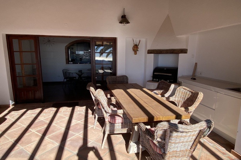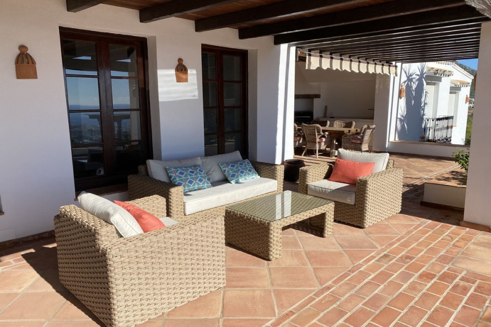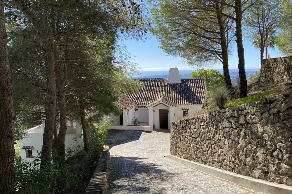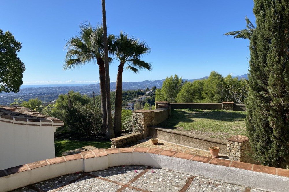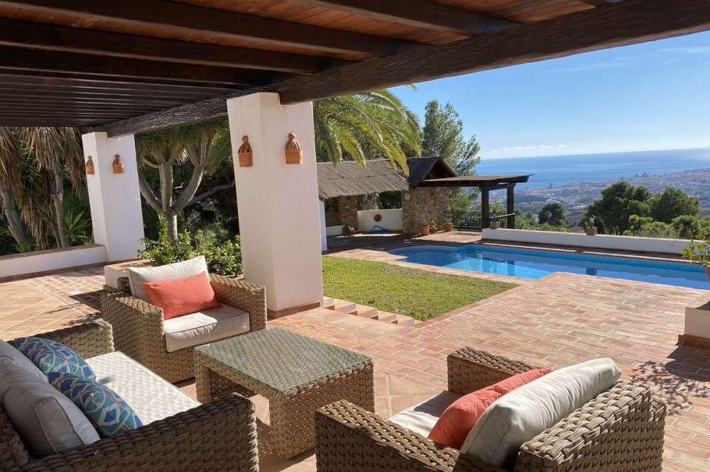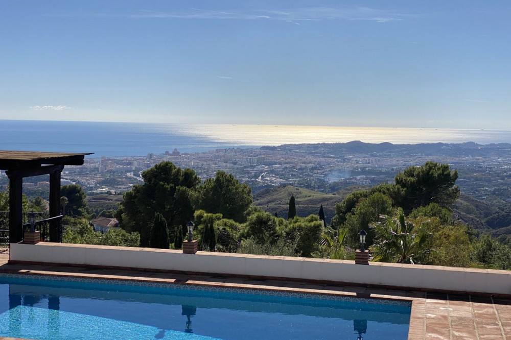• A STUNNING VILLA, IN ONE OF THE MOST COVERTED LOCATIONS IN MIJAS. ONE OF THE FINEST RESIDENCIES TO COME TO MARKET IN RECENT TIMES. PANORAMIC SEA VIEWS AND TOTAL PRIVACY. ONE OF THE BEST VIEWS TO BE HAD ON THE COAST! South orientation, secure gated and car port parking. AT A GLANCE 3/4 LARGE DOUBLE BEDROOMS 4 BATHROOMS - ALL EN SUITE IMMACULATE CONDITION THROUGHOUT RENOVATED TO A HIGH STANDARD POTENTIAL TO ENLARGE SUPERB LANDSCAPED GARDENS Electric gates leading to a sweeping driveway and an upper car parking area for 4 vehicles. Lower level double car port and additional hard standing. Entrance porch leading to a reception lobby, storage and a cloakroom. Superb open plan lounge with vaulted and beamed ceilings and a dramatic, full height feature chimney and fireplace. Adjacent to the lounge is a formal dining area with access, via large double doors, to a large covered terrace with a built in barbecue and newly fitted summer kitchen. This is an amazing place to entertain and to enjoy al fresco dining at its best, while soaking in the astonishing views beyond. Off the dining area is a fully fitted, high quality kitchen/breakfast room with granite work surfaces, breakfast bar and an American style fridge/freezer. Neighboring the kitchen is a breakfast area, additional storage and a wine cooler. Split level to the lounge is a mezzanine level which is currently used as a TV room and study. Equally this area could be used as an additional bedroom. Off the reception hallway steps lead to the first of the double guest bedrooms. This is a delightful room with access to the garden and boasting a large en suite with a free standing egg bath, twin wash hand basins and a large walk in shower. Off the bedroom is a large walk in wardrobe. Leading from the dining area is an expansive Master bedroom with a luxury en suite with twin wash hand basins and a large walk in shower. Split level to the sleeping area is a large sitting area and a range of wardrobes. Just a few steps down from the dining area leads to a further large guest bedroom with direct access to the garden and a further high quality en suite, again with twin wash hand basins and a large walk in shower. Leading from the kitchen there is external access that leads to a storage room, and also to a larger self contained area which is currently used for storage with an en suite bathroom. This area could easily be converted to become a small, self contained apartment. On the other side of the kitchen a door takes you to a covered walkway that leads to the car port. This area could very easily be converted into a further bedroom en suite and also enjoys the most spectacular of views. A new car port area could easily be erected at the end of the driveway. OUTSIDE The large garden affords total privacy whilst encapsulating the amazing country, mountain and sea views. The garden is a special feature of this unique property. It is a sylvan paradise set amidst a plethora of mature plantings, too numerous to list. Parts of the garden are a myriad of parkland style pathways with wonderfully cared for borders and natural stone walls. Majestic palms soar into the blue haven and all that can be heard is birdsong. Further covered and uncovered terraces make this a place ideal for extensive entertaining. The 10m x 4m pool is serviced by a thatched cabana and further seating areas. Further store rooms and gardeners’ space complete the outside areas. ADDITIONAL FEATURES GAS CENTRAL HEATING (not used by the current owner) AUTO IRRIGATION TO THE GARDEN BUILT IN WARDROBES AIR CONDITIONING - HOT/COLD UNDER FLOOR HEATING TO THE BATHROOMS CERAMIC TILED FLOORS ALARM SYSTEM LOCATION This beautiful villa is located in a prestigious, villa only urbanisation very close to the white washed and historical village of Mijas and just a short drive to the vibrant beach resort of Fuengirola. The villa is sold fully and tastefully furnished, subject to an agreed and signed inventory. We cannot recommend more highly the viewing of this exceptional residence which will appeal to the most discerning of buyers. DRIVING TIMES MIJAS VILLAGE 2 MINUTES FUENGIROLA/BEACH 8 MINUTES MALAGA 20 MINUTES MARBELLA 25 MINUTES