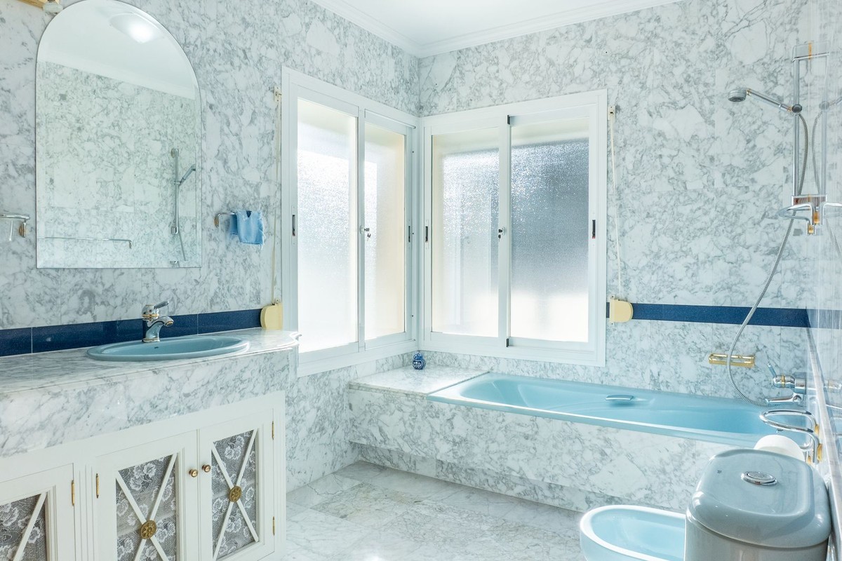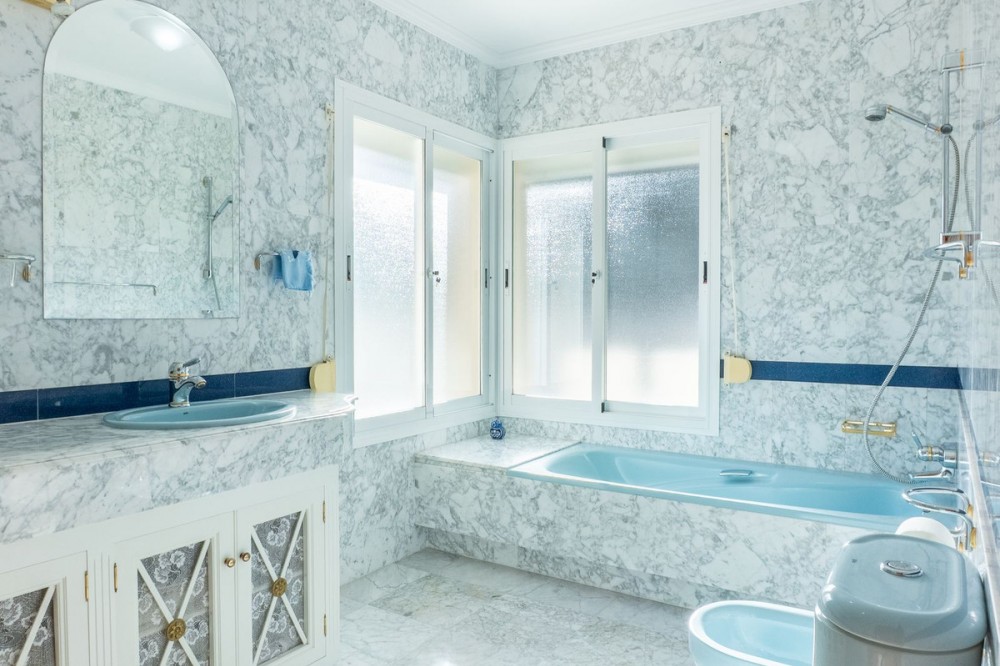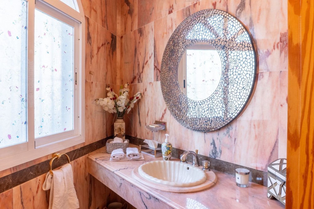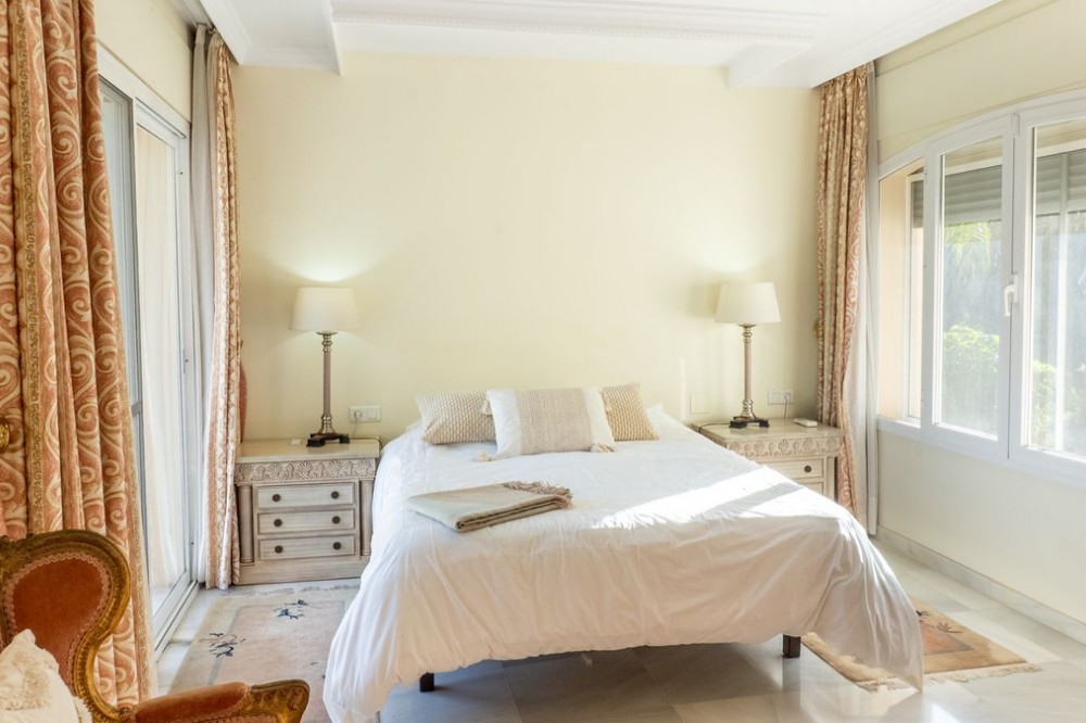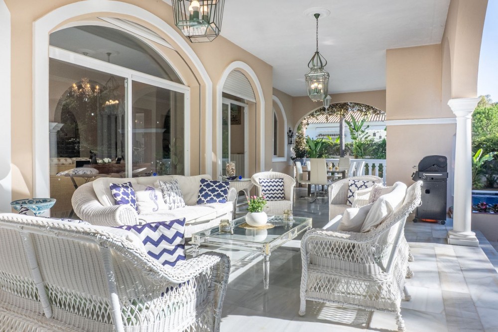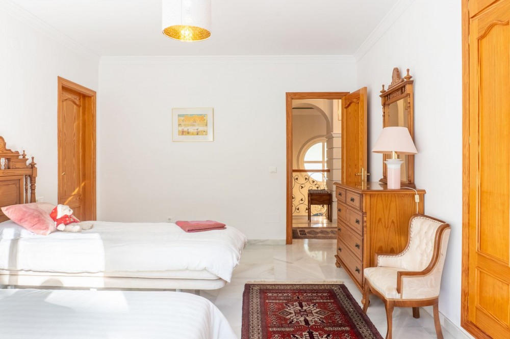 - This magnificent traditional-style villa is located in the exclusive New Golden Mile, within the prestigious El Presidente community, just 50 metres from the beach and its newly built seaside promenade. The location is exceptional, surrounded by all kinds of amenities and only five minutes’ drive from Puerto Banús and ten minutes from both Marbella and Estepona. The property sits on a 1,275 m² plot and offers 539 m² built, including 461 m² of internal living space and 80 m² of terraces, all facing south to ensure exceptional brightness throughout the day. Upon entering the villa, you are greeted by a spacious and luminous main living room featuring large windows that fill the space with natural light and provide seamless access to the terrace and the beautifully maintained garden. On this floor there is also a cozy tea room, a generous kitchen and dining area, a laundry room, a bedroom with an en-suite bathroom and walk-in wardrobe, as well as a guest bathroom. A large garage and several storage areas complement this level. The upper floor hosts the remaining four bedrooms, all exceptionally spacious, each with its own en-suite bathroom and direct access to large terraces that benefit from the south-facing orientation and pleasant open views. The property stands out for its charming traditional architecture, high ceilings, excellent condition and abundant natural light in every corner. This is a unique home, perfect as a family residence or as an investment opportunity in one of the most sought-after locations on the Costa del Sol.