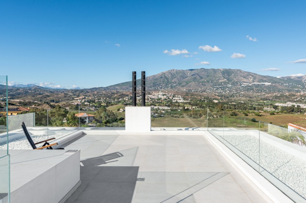 - CONTEMPORARY LUXURY VILLA WITH PANORAMIC VIEWS – BUILT 2024 Welcome to this spectacular newly built contemporary villa, a masterpiece of modern design and comfort completed in 2024. Positioned to capture sweeping panoramic views of the valley, mountains, and the Mediterranean Sea, this residence offers exceptional privacy paired with elegant, light-filled living spaces. MAIN LEVEL – OPEN PLAN LIVING & SEAMLESS INDOOR-OUTDOOR FLOW The entry level features a spacious lounge and an open-plan designer kitchen with floor-to-ceiling windows that frame the stunning mountain scenery. From here, the living spaces extend naturally toward the meticulously landscaped garden and the heated saltwater infinity pool. This level also includes a generous guest suite with an en-suite bathroom, as well as a stylish guest toilet. A private elevator connects all floors of the home. UPPER LEVEL – LUXURY BEDROOM SUITES & PANORAMIC TERRACES Upstairs, you’ll find two expansive bedroom suites, each with its own en-suite bathroom and direct access to a large terrace offering breathtaking views. A separate south-facing terrace leads to a spiral staircase taking you up to the impressive roof terrace. ROOF TERRACE – 360° VIEWS & COMPLETE PRIVACY The spacious rooftop solarium boasts uninterrupted 360-degree views of the valley, mountains, and the sea. It is an ideal space for installing a jacuzzi, creating a chill-out lounge, or simply enjoying peaceful sunsets in total privacy. LOWER LEVEL – FLEXIBLE SPACE & GENEROUS GARAGE The ground floor offers abundant additional space, including storage rooms, a laundry room, utility room, and a large garage accommodating more than four cars. This level also presents exciting possibilities for personalization: transform part of the space into a cinema room, gym, wine cellar, or even an independent guest apartment. OUTDOOR LIVING – DESIGNED FOR SUN, SHADE & RELAXATION The exterior has been thoughtfully planned with multiple areas for dining, relaxing in the shade, or sunbathing by the heated infinity pool. The eco-friendly pool features an electric cover that harnesses solar energy to naturally warm the water. FEATURES – High-quality materials throughout – Smart home system controlled via mobile app – Heated saltwater infinity pool with solar-assisted cover – Elevator to all floors – Extensive terraces including a full 360° roof terrace This villa combines striking contemporary architecture with top-tier functionality, creating a luxurious private retreat designed for modern living at its finest. Distances: Airport 25 min, 30Km Shopping Center Miramar 8 min, 4,4Km Fuengirola 15 min , 6Km Beach 9 min, 5Km Marbella 30 Min, 28Km Malaga Center 40 min, 38Km.