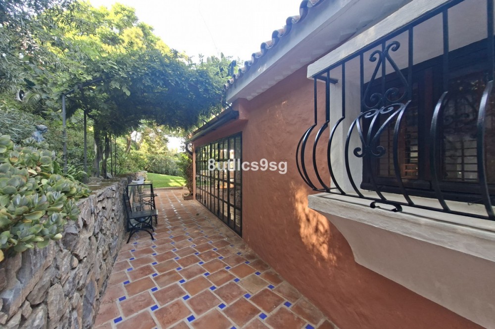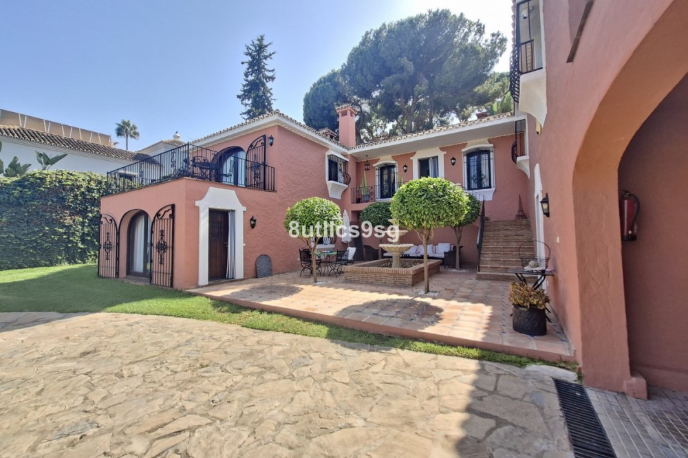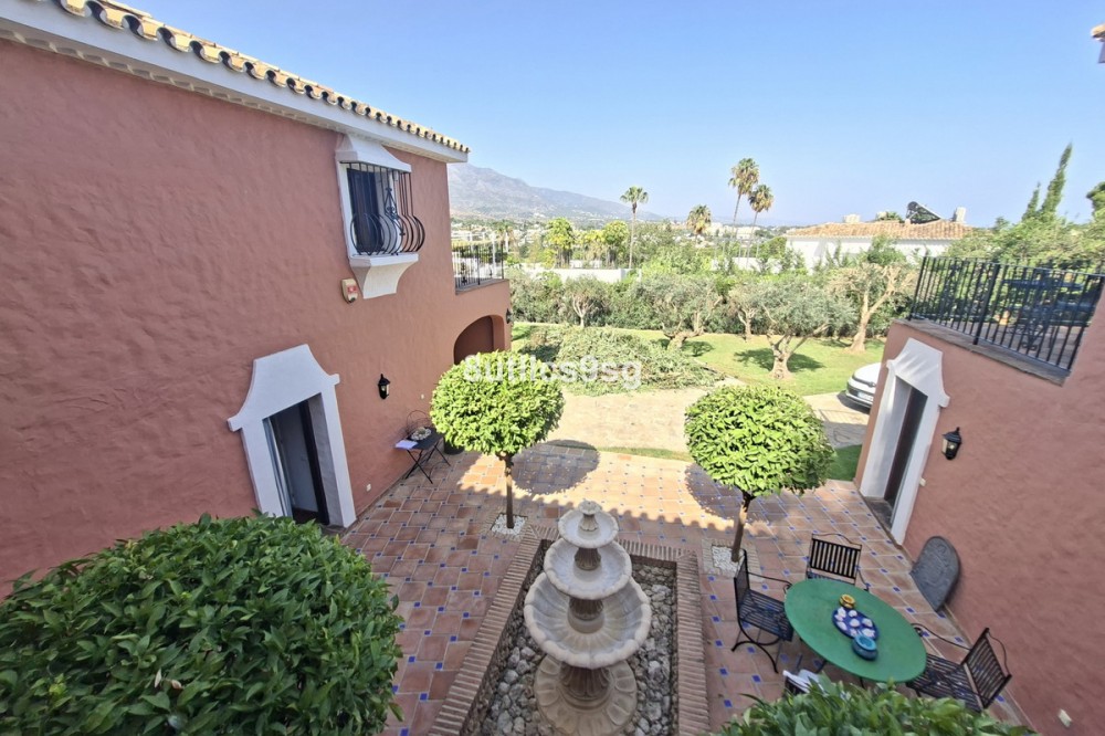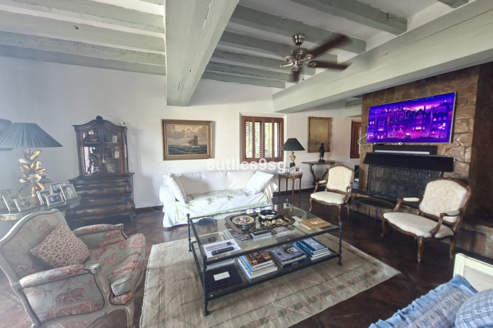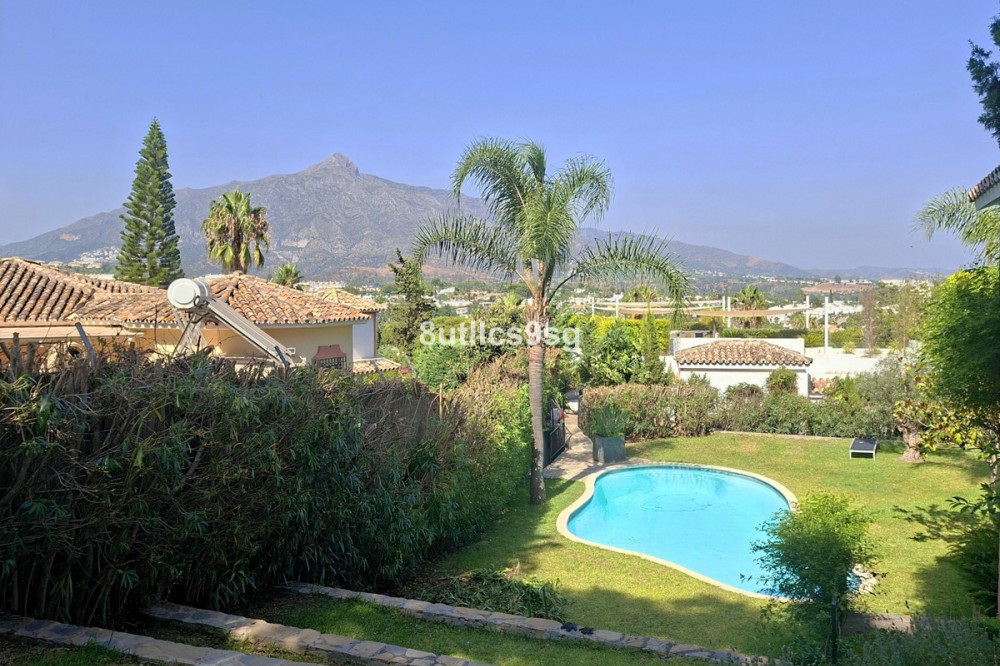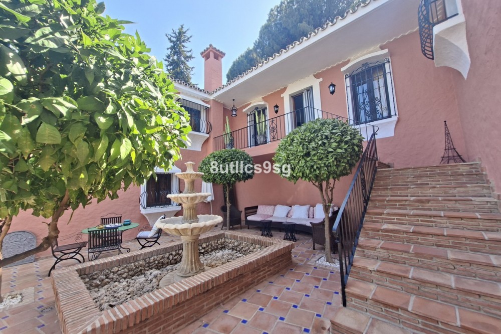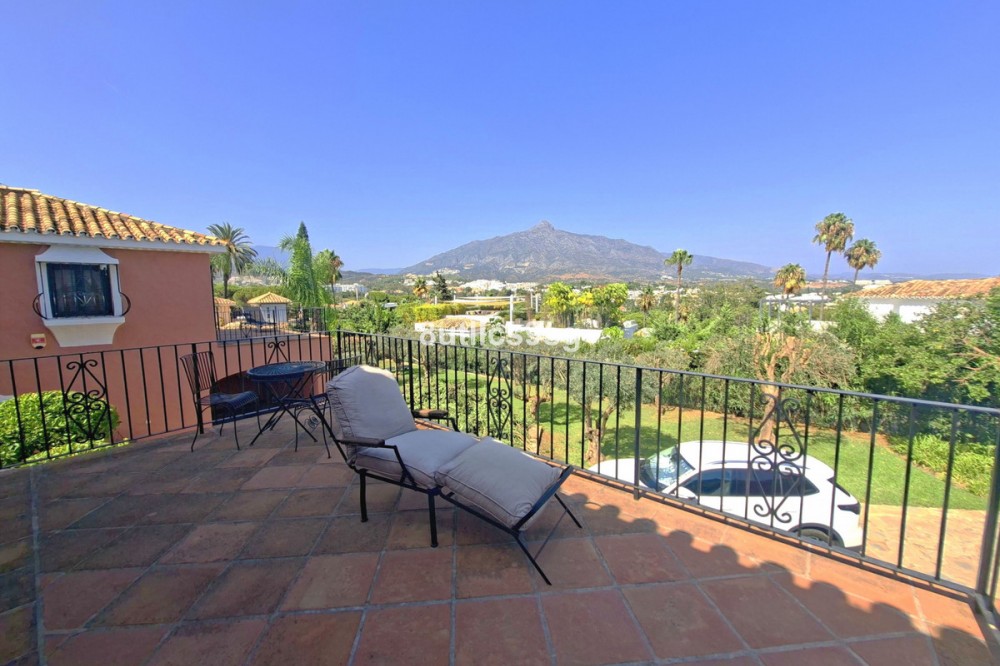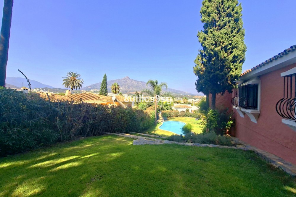- Nestled in a tranquil spot in the heart of Marbella’s prestigious Golf Valley, this beautifully presented Andalusian-style villa, full of traditional beauty and privacy all around the property. Located in the sought-after area of Las Brisas, Nueva Andalucía, the home boasts breathtaking views of the iconic La Concha Mountain and is just minutes from top standard amenities, golf courses and Marbella’s golden beaches. Set on a generous plot over 1.370sqm with a private garden and swimming pool, this characterful property features a unique layout that floods all the interiors with privacy across its spaces. Exposed wooden beams, a striking double-sided fireplace, and rustic finishes lend the villa a warm, timeless ambiance. The main house comprises five spacious bedrooms and four bathrooms, complemented by multiple terraces perfect for alfresco dining and relaxing under the Mediterranean sun. The inviting living areas include a large lounge, a formal dining room with floor-to-ceiling glass doors opening to the terrace, and a fully equipped kitchen. For added flexibility, the property includes a self-contained one-bedroom guest apartment with a living area and bathroom—ideal for guests, staff, or multi-generational living—as well as a separate studio with an en-suite bathroom that could serve as a home office or creative space. Additional features include a garage, ample outdoor parking, a laundry room, and beautifully landscaped gardens. Whether as a full-time residence, holiday home, or investment, this villa is a true gem in one of Marbella’s most desirable neighbourhoods.