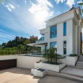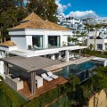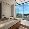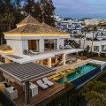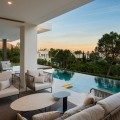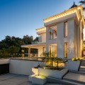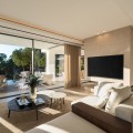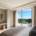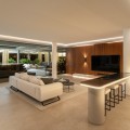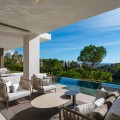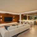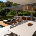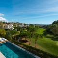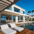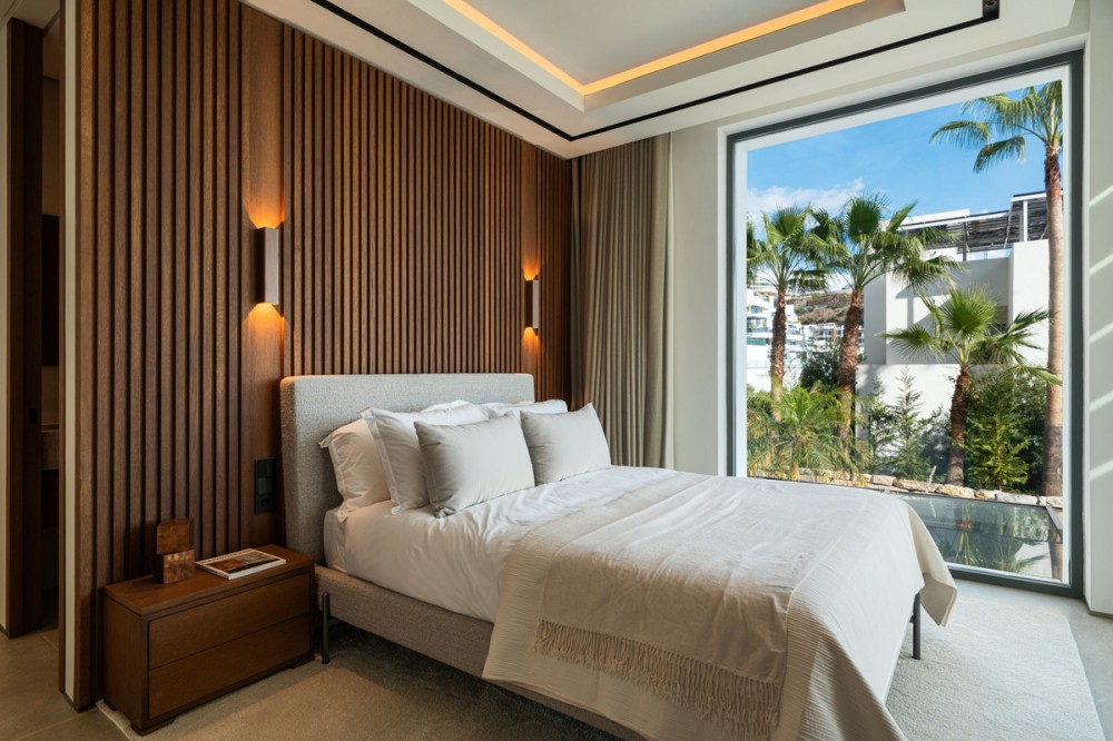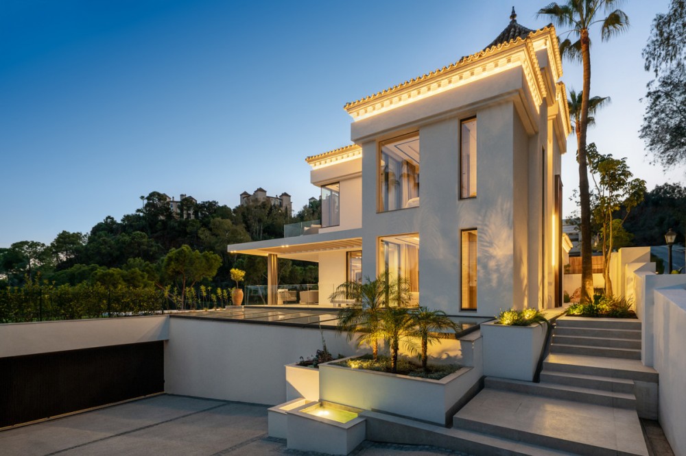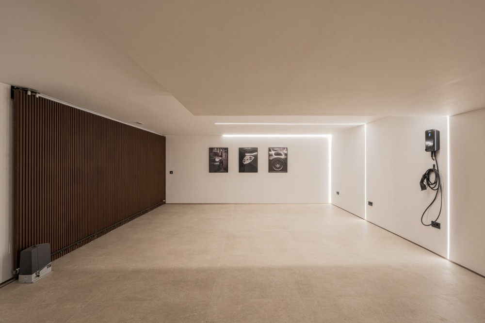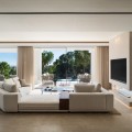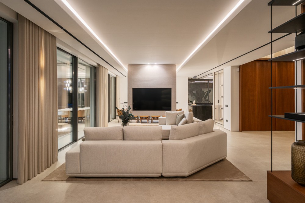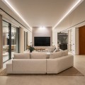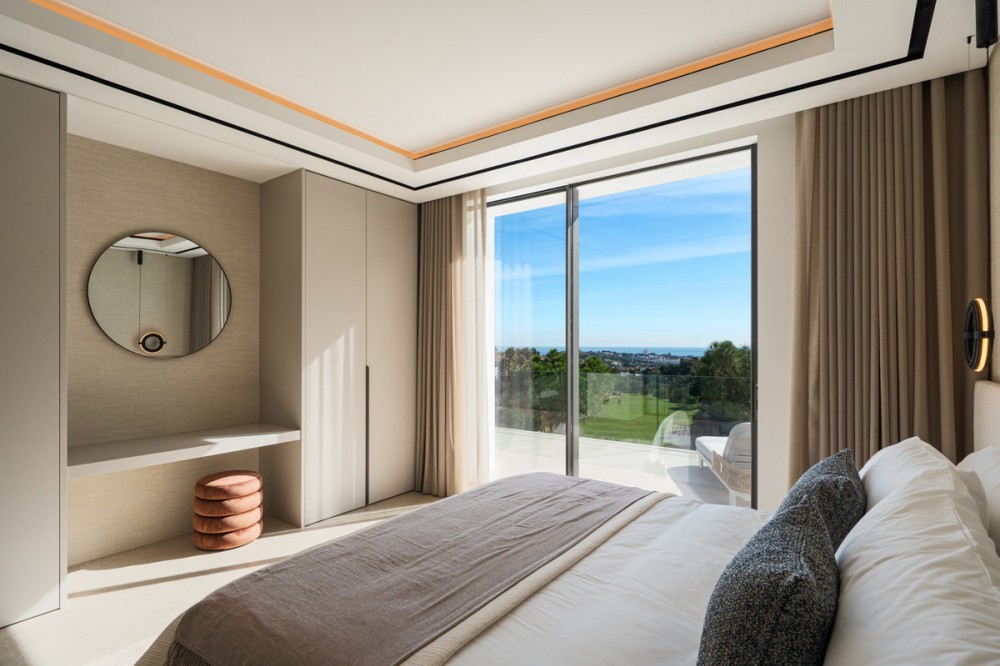 - The Ridge in La Quinta is a frontline-golf residence positioned for privacy and unobstructed views across the golf course and the Mediterranean Sea. Set on a 1,009 m² plot with 771 m² of meticulously executed construction, the villa stands out for its clean architectural lines, symmetry and the seamless connection between interior and exterior spaces. With architecture and interior design by NMobe, its elevated and gated setting makes it one of the most secure and exclusive homes in this prestigious enclave. Inside, the villa features exclusive furniture by Aalto Exclusive Design, delivering a cohesive aesthetic defined by natural tones, high-end materials and bespoke detailing. The main living area is expansive, bright and designed for flow, with large sliding panels that open the entire space onto the terrace. Integrated lighting, refined textures and carefully curated furnishings create an environment that is both functional and visually impactful. The kitchen and dining areas continue the same standard of design, offering a sleek layout with premium appliances, generous workspaces and ample storage. The open-plan configuration allows direct interaction with the living room and terrace, making the main level ideal for both daily living and entertaining. Large windows frame the exterior landscaping and views, turning every room into a vantage point. Outdoor living is a major focus, with the ground-floor terrace featuring an infinity pool that overlooks the golf course, a sunken chill-out area, a fully equipped BBQ station and areas for dining and relaxation. Upper-level terraces extend the outdoor experience from the bedrooms, providing private spaces to enjoy the views. The lower level is dedicated to leisure and wellness, offering a custom-designed entertainment room with a full bar, an impressive spa with an indoor pool and sauna, and a private gym. A secure garage with an electric-vehicle charging port completes the amenities. Combining architectural precision, premium interiors and a frontline-golf position, The Ridge represents one of the most complete luxury offerings in La Quinta.