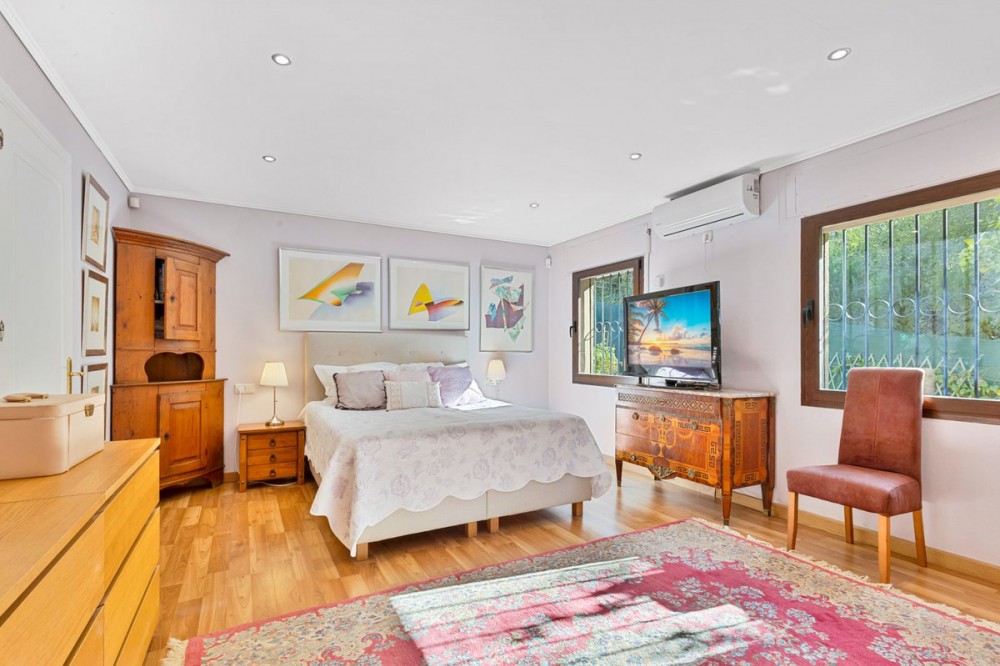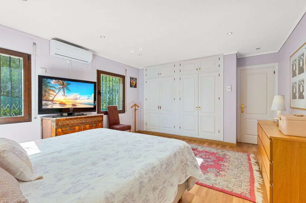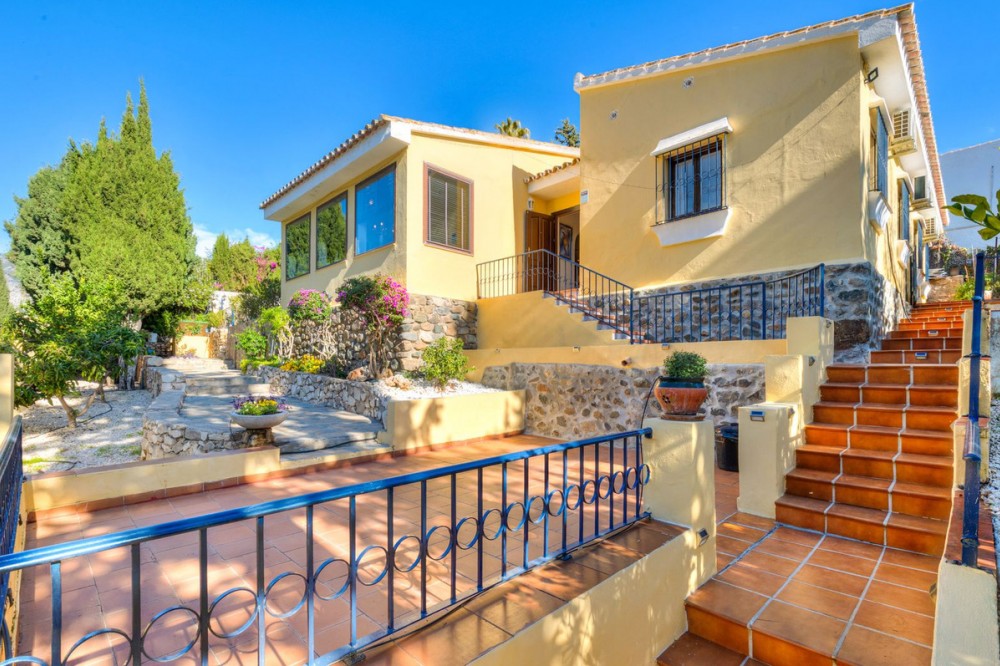 - Charming and well-maintained villa on one level in the quiet area of Campo Mijas only 3 km from the beach in Fuengirola. The villa is very private with a nice pool area with bar and large terrace areas. The garden is easy to maintain as it is mostly paved with stones but with nice flower beds with several fruit trees such as passion fruit, lemon, orange, pomegranate, mango and sweet, Spanish "nisperos". We enter the villa into a welcoming hall with wardrobe. To the left the living room opens up with space for a lounge group, dining table and fireplace and next to it we find the good-sized kitchen with kitchen island and dining area. From the kitchen you can access the social areas by the pool and there is also a back door to the laundry room and the tool shed which is located at the back of the house. The kitchen is fully equipped, also with a wine cooler. If we instead take the right from the hall we find the sleeping area with 2 smaller bedrooms, a bathroom with shower and the large master bedroom with en-suite bathroom and plenty of wardrobe space. The inner hall also has built-in wardrobes. The villa is located one floor up from the street. At street level there is a private garage with space for 1 car. Within walking distance there is a small supermarket, pizzeria, café and pharmacy and between 1.5 -2 km from the house there are several larger supermarkets and more services. It takes about 25 minutes to walk down to the center of Fuengirola. The house is equipped with an alarm and air conditioning in all three bedrooms. Must see! The villa has a registered tourist license.