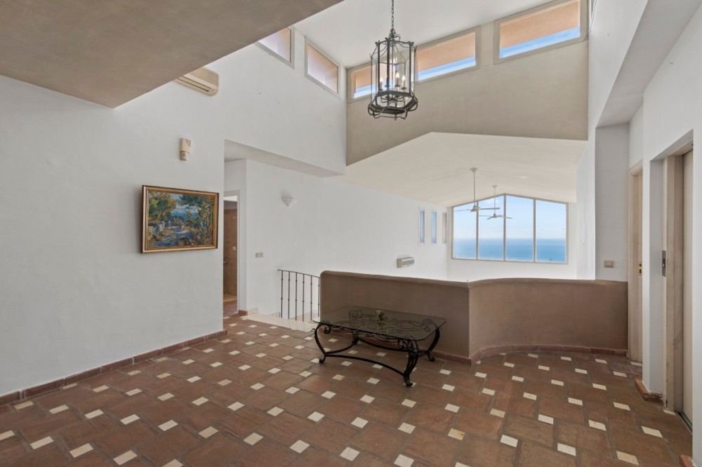 - In one of the most exclusive and tranquil areas of La Mairena, surrounded by nature and offering sea views that captivate from the very first moment, stands this spacious villa, defined by absolute privacy and extraordinary natural light. With 663 m2 built over three levels and 5 bedrooms with en-suite bathrooms, this property to renovate offers exceptional potential to create a truly extraordinary residence.From the main entrance, the sensation is immediate: space, light and endless views. The high ceilings, large-format windows and generous proportions in every room create an atmosphere that is difficult to find even in the most exclusive villas. The impressive living room opens onto the Mediterranean horizon through expansive windows that flood the space with natural light and connect directly to a large terrace with both a glass-enclosed area and an open section, each offering truly spectacular views. Connected to the dining room, it forms a space perfect to redesign into an elegant, fluid and contemporary concept. The independent kitchen, spacious and bright, includes a pantry, laundry room and an additional room that can be adapted to multiple uses depending on the needs. On the lower floor, there are two large bedrooms, both with en-suite bathrooms; one of them includes a generous walk-in closet. These bedrooms enjoy direct access to the garden and the pool, creating an intimate environment perfectly integrated with the outdoor areas.On the main floor, in addition to the common areas, there is a stylish office with a private balcony and panoramic views, a unique space to work while enjoying the Mediterranean backdrop. On the upper floor, two additional en-suite bedrooms feature large private terraces with spectacular sea views, creating true havens of peace and light.The 1,343 m2 plot invites year-round outdoor living. Mature gardens, the pool with lounge area and outdoor kitchen, and the large patio with barbecue zone create an ideal setting for those seeking privacy, nature and incomparable views.The villa includes a private garage, a lift with access to all floors, underfloor heating throughout the property, an alarm system, water softener and multiple possibilities for redistribution to adapt it to the most demanding contemporary standards.Its location adds even more value: in a green and peaceful enclave of the Costa del Sol, next to the German School and Echos International School, just 10 minutes from supermarkets, restaurants and services in Elviria and the Santa María Golf Club, and 17 minutes from Marbella town centre.A villa with character, natural light and a privileged setting, ideal for those seeking a home that combines tranquillity, nature and the opportunity to create a truly personal and exclusive space.The abbreviated information document is available to you. Expenses: Taxes (ITP or VAT+AJD) + Notarial and registration expenses. ALA