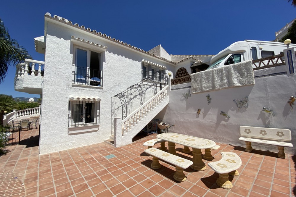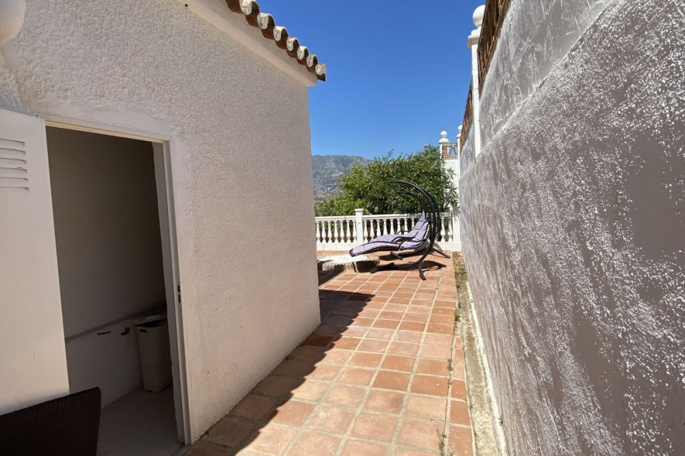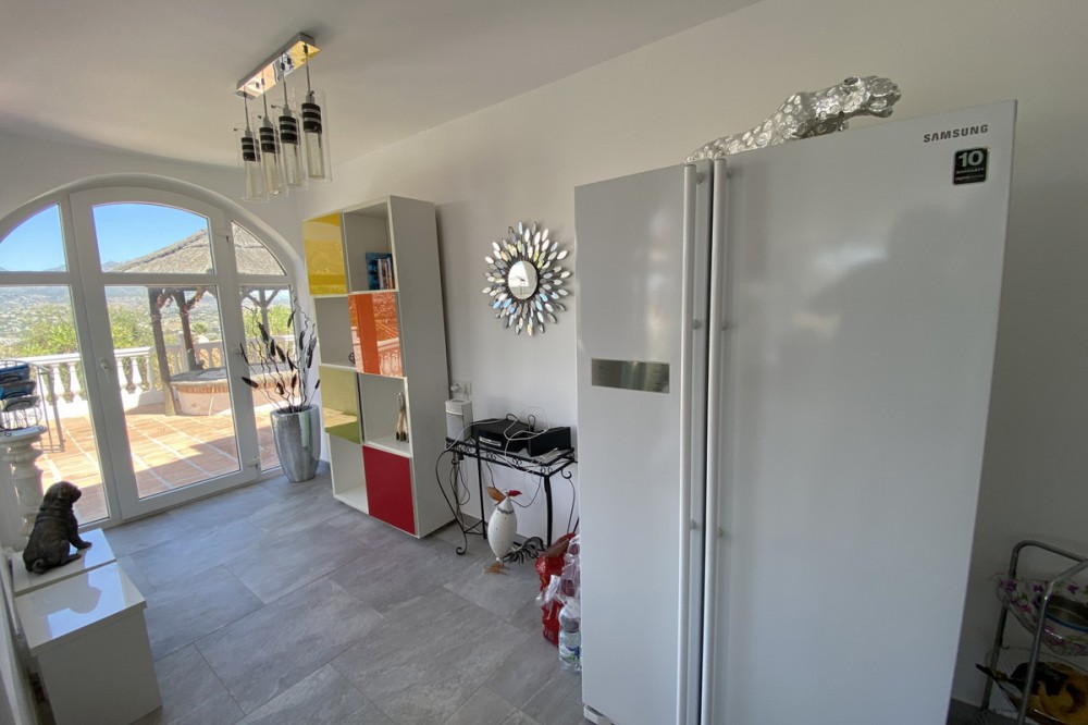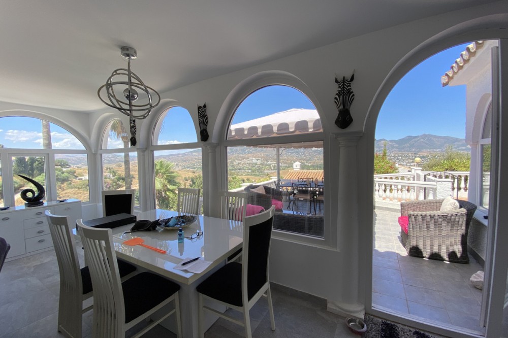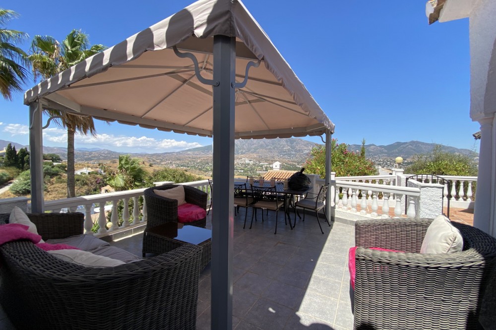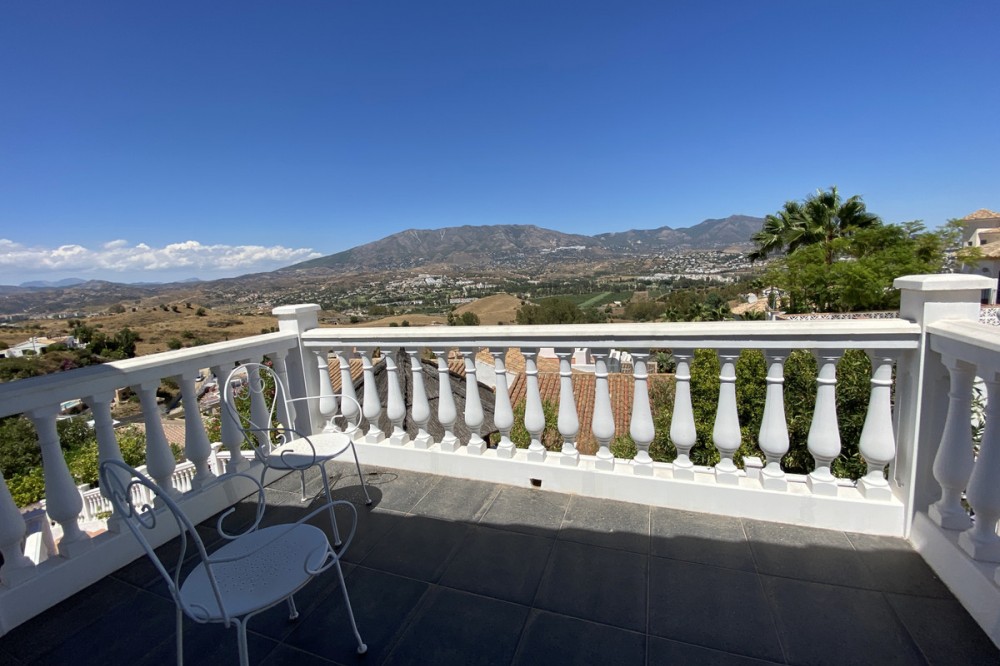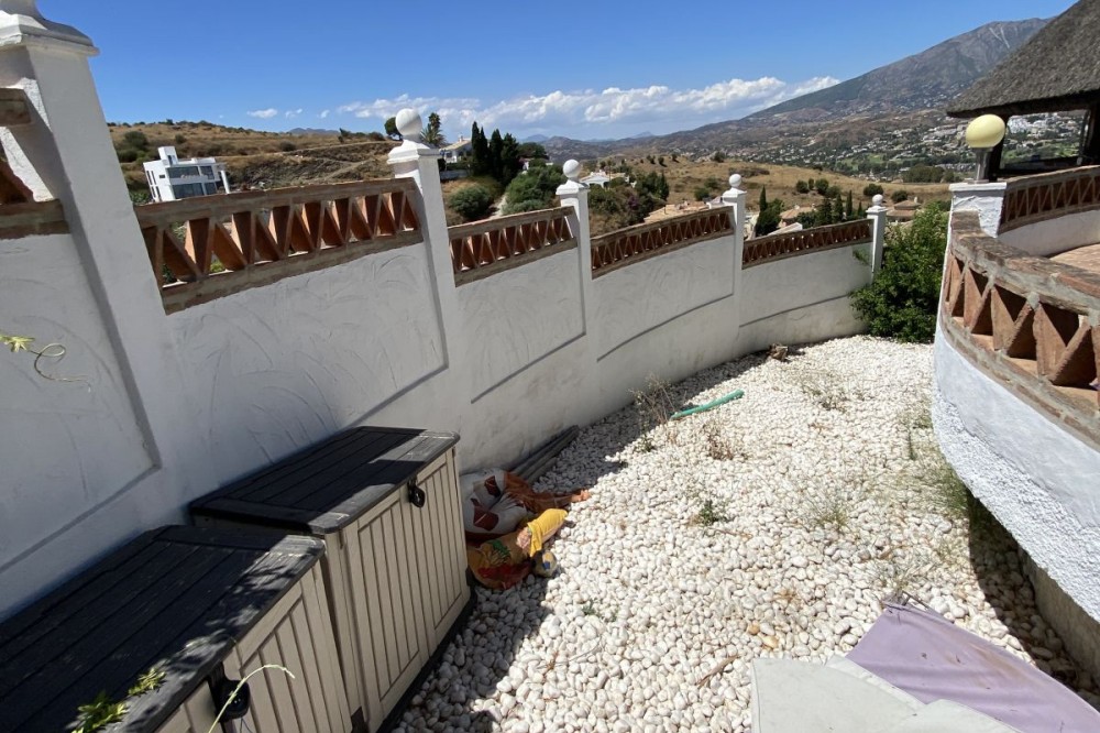- Absolutely Stunning Villa in Cerros de Aguila on a large 897sqm plot with stunning panoramic views of Mijas Pueblo and surrounding countryside. The house is surrounded by plenty of outside spaces for quality outside living. The house itself has been recently renovated to a very high standard. The living area is open, spacious and bright with and open plan kitchen with easy access to outside dining space. There are two bedrooms also on this floor both ensuite with fitted wardrobes. The master bedroom has the top floor all to itself accessed by an elegant stairway from the spacious walk in wardrobe below. There is a self contained beautiful bright one bedroom apartment below with is own open plan Kitchen, entrance and access to the swimming pool area which has a raised shaded Patio area with Traditional Spanish barbecue area and Pool Table This property really is a must see key ready for holidays or permanent living