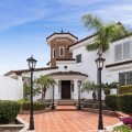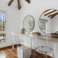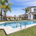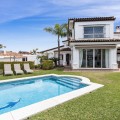- Nestled in the serene Las Chapas Playa, 300 meters from the sandy shores, awaits a stunning 5-bedroom, 6 bathroom villa. This idyllic property is conveniently situated just a 5-minute drive from Marbella Centre and a 40-minute journey from Malaga Airport, ensuring both accessibility and tranquility. Upon entry, to the right you find the garden, showcasing a large swimming pool. To the left, an outdoor bathroom with a shower and toilet ready for post-beach refreshment. Stepping through the wooden doors, you are welcomed into an exquisite foyer adorned with a staircase and lofty ceilings. To the left, the first bedroom awaits, boasting a double bed and an ensuite bathroom. The second bedroom, adorned with two single beds, also offers its own ensuite bathroom. On this floor there is also a guest toilet. On the opposite side, the kitchen and dining area beckon with expansive glass windows, seamlessly merging indoor and outdoor living. Accessible from here is the capacious covered terrace, complete with a dining table and inviting lounge area perfect for gatherings on those hot and sunny days. Continuing the journey, a spacious living room and a chic bar awaits,, offering a great space for relaxation and entertainment. Ascending the staircase, two additional bedrooms reveal themselves, each exuding comfort and elegance. The master suite boasts an ensuite bathroom featuring a luxurious bathtub and shower, accompanied by a generous private terrace boasting great sea views. The fourth bedroom provides a cozy retreat with a double bed and a cute lounge area with a sofa. Behind the villa you find a secluded guest apartment complete with a living room, compact kitchen, a double bedroom, and a bathroom—providing an ideal sanctuary for additional privacy or visiting guests. Convenience is assured with a garage offering space for a car, although ample street parking is readily available right in front of the villa. Walking along the nearby beach you'll find lots of charming restaurants and bars. Among the favorites are Nosso Beach, Oyana Beach.