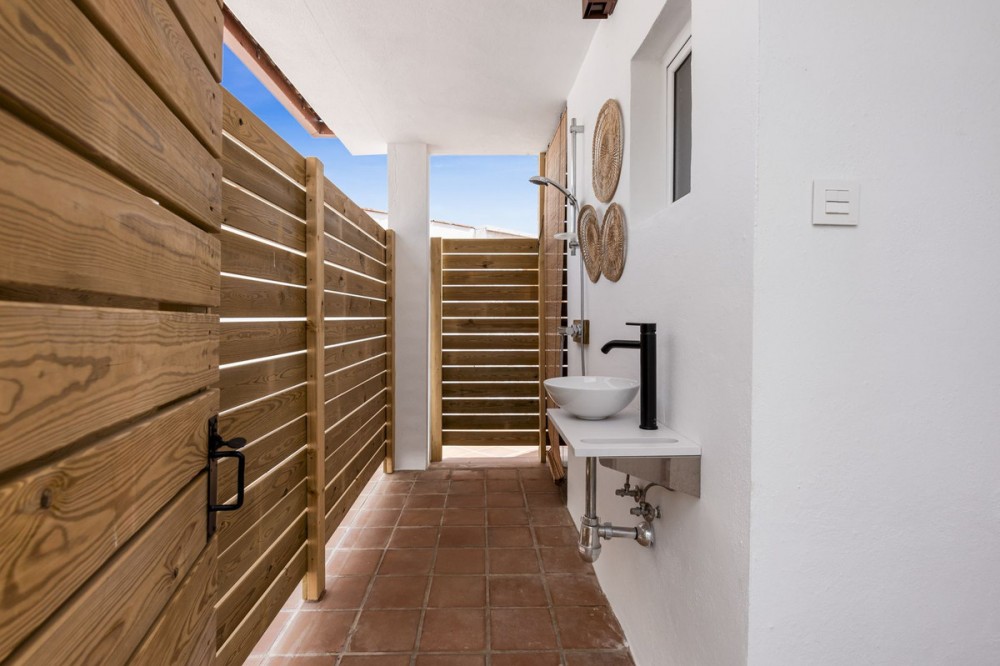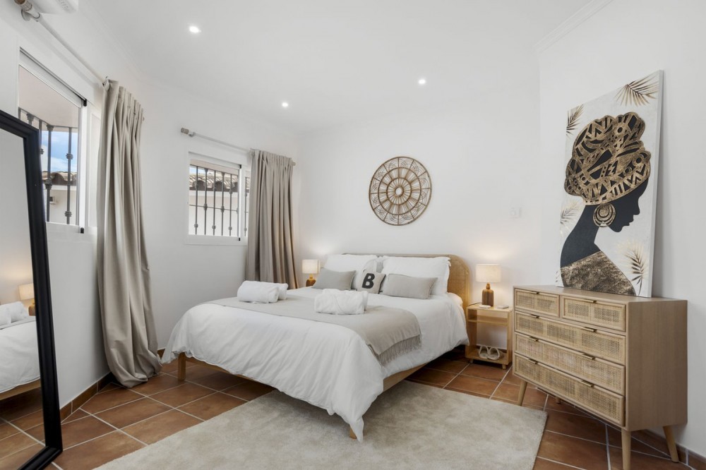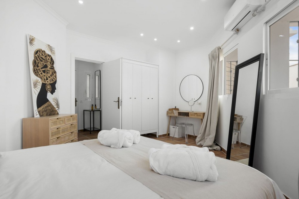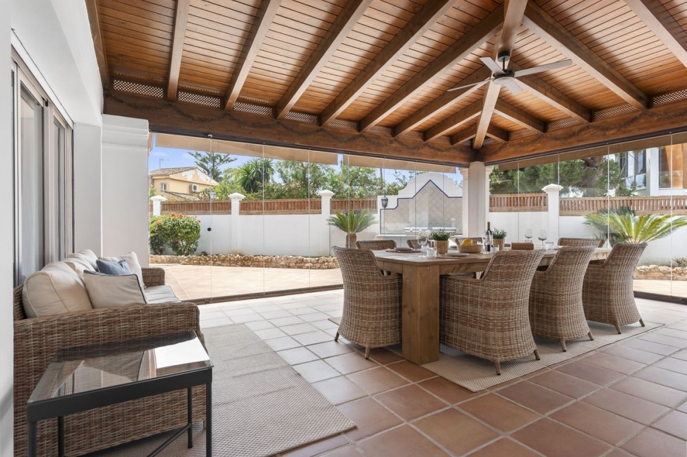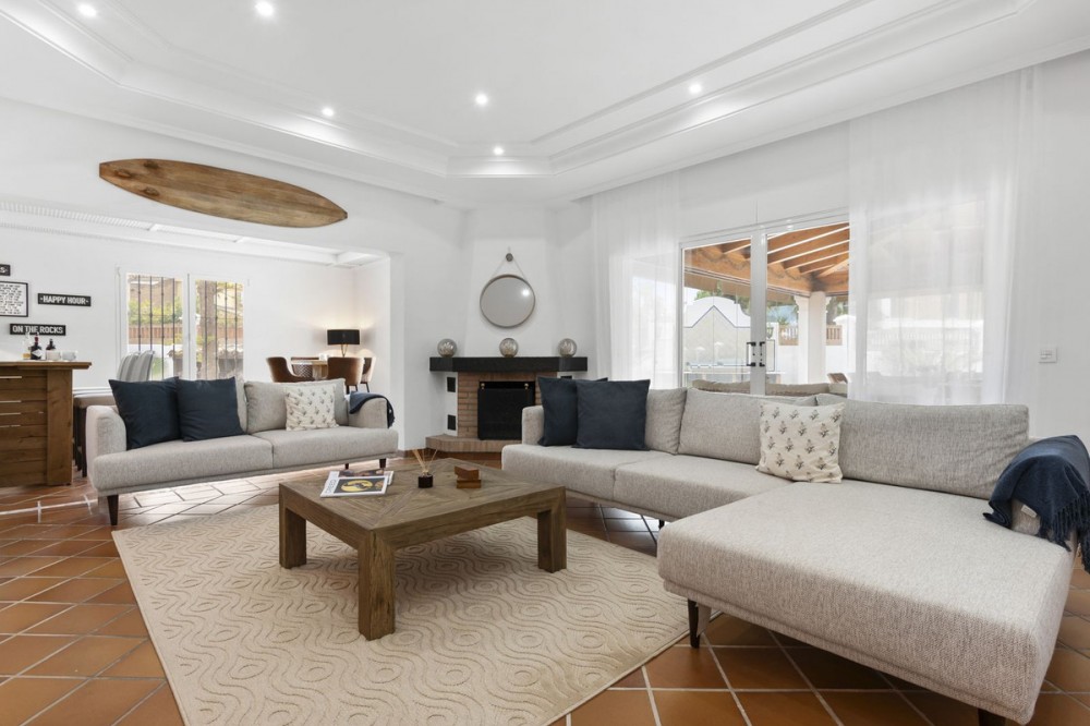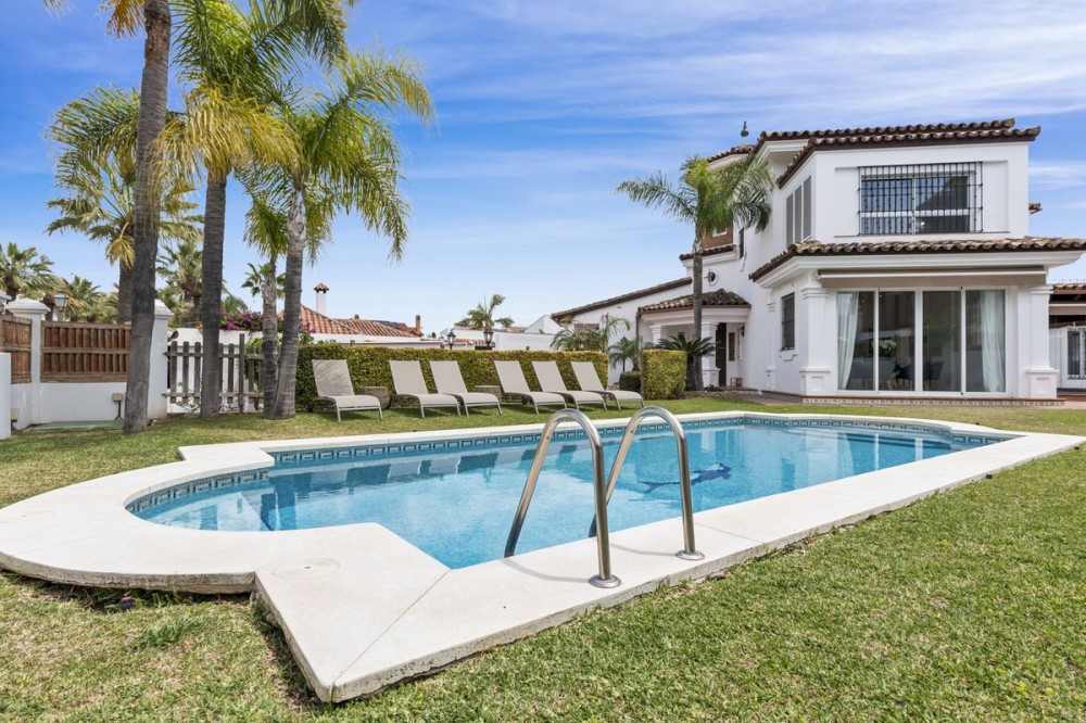 - Nestled in the serene Las Chapas Playa, 300 meters from the sandy shores, awaits a stunning 5-bedroom, 6 bathroom villa. This idyllic property is conveniently situated just a 5-minute drive from Marbella Centre and a 40-minute journey from Malaga Airport, ensuring both accessibility and tranquility. Upon entry, to the right you find the garden, showcasing a large swimming pool. To the left, an outdoor bathroom with a shower and toilet ready for post-beach refreshment. Stepping through the wooden doors, you are welcomed into an exquisite foyer adorned with a staircase and lofty ceilings. To the left, the first bedroom awaits, boasting a double bed and an ensuite bathroom. The second bedroom, adorned with two single beds, also offers its own ensuite bathroom. On this floor there is also a guest toilet. On the opposite side, the kitchen and dining area beckon with expansive glass windows, seamlessly merging indoor and outdoor living. Accessible from here is the capacious covered terrace, complete with a dining table and inviting lounge area perfect for gatherings on those hot and sunny days. Continuing the journey, a spacious living room and a chic bar awaits,, offering a great space for relaxation and entertainment. Ascending the staircase, two additional bedrooms reveal themselves, each exuding comfort and elegance. The master suite boasts an ensuite bathroom featuring a luxurious bathtub and shower, accompanied by a generous private terrace boasting great sea views. The fourth bedroom provides a cozy retreat with a double bed and a cute lounge area with a sofa. Behind the villa you find a secluded guest apartment complete with a living room, compact kitchen, a double bedroom, and a bathroom—providing an ideal sanctuary for additional privacy or visiting guests. Convenience is assured with a garage offering space for a car, although ample street parking is readily available right in front of the villa. Walking along the nearby beach you'll find lots of charming restaurants and bars. Among the favorites are Nosso Beach, Oyana Beach.