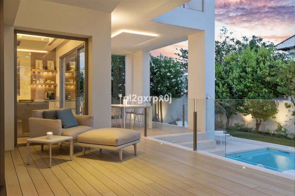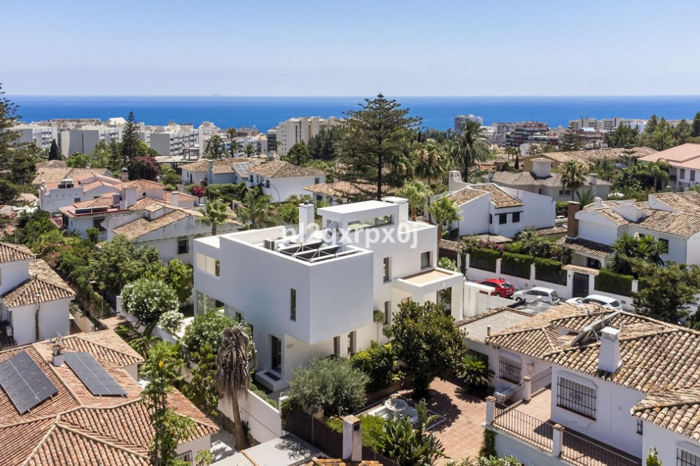 - Modern Villa in Marbella. This villa represents an good opportunity to enjoy modern luxury in one of Marbella’s most sought-after central addresses. to a high level of comfortable living, and plenty of privacy, within walking distance to the beautiful old town, beaches, central market, banks, farmacies, restaurants, shops, and all types of services, it offers the convenience living in a quite area of the city. The property sits on a 553 m² plot with 398 m² of built space and 197 m² of terraces. It features one bedroon in the ground floor, guest toilet, in the frist floor we find a very wide master bedroom with bathroom en suite, with connections prepared for a fourth bedroom. And in the semi-basement is the 3 bedroom with a fully bathroom, and is also posible to organise a fifth bethroom with bathroom ensuite in this level, ample gym and engine room complete this level. Interiors are designed with oak parquet floors and natural stone, while the open-plan kitchen includes a stainless-steel island and premium appliances from Miele, Neff, and Siemens. Outdoor spaces invite year-round enjoyment with four terraces, easy manintenace garden, and a saltwater pool equipped with counter-current system, lighting, and cleaning jets. From the first floor upwards, panoramic views embrace Marbella, La Concha, Gibraltar, and the mountains of Morocco. Additional highlights include: Alarm system and outside cameras Solar panel system (6 panels) Split air con (warm-cold) Underfloor heating throughout the house Insulated glass windows and sliding doors Video-intercom Decalcification system Water pressure control Grohe filter faucets RED and BLUE