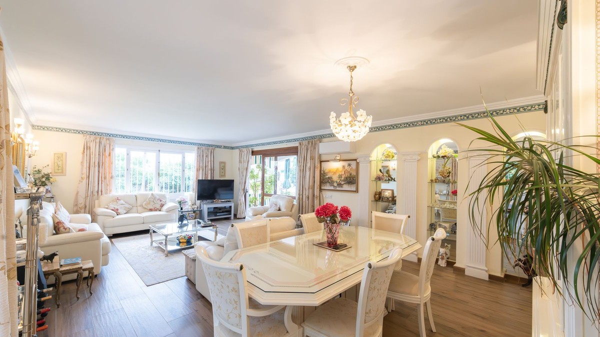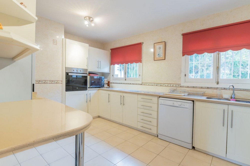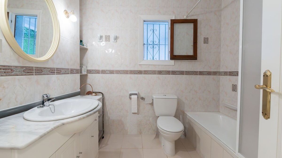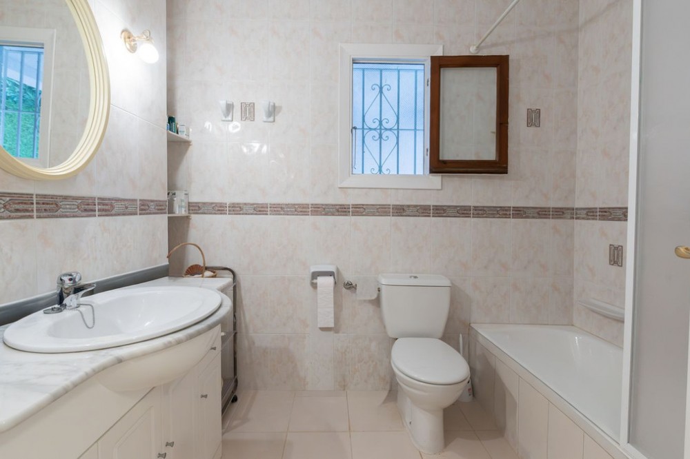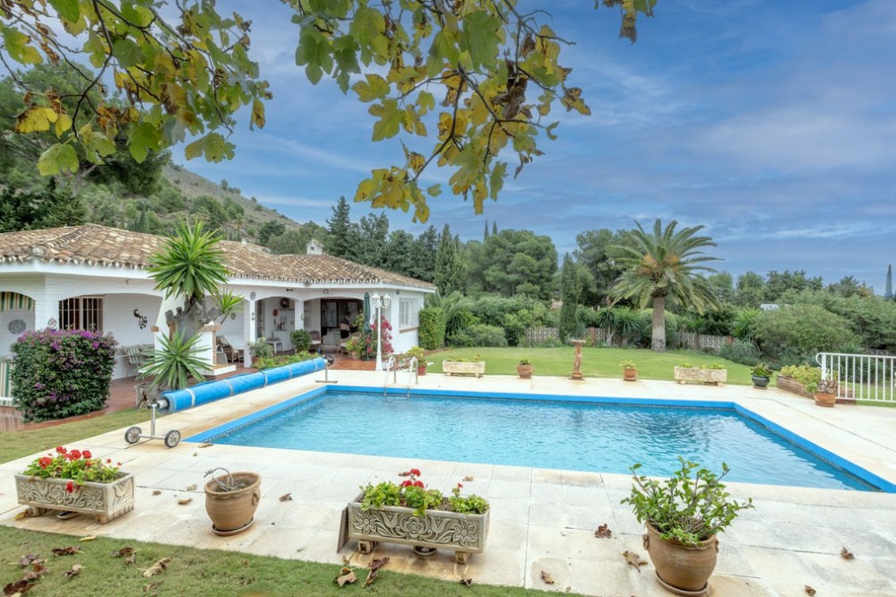 - Independent villa on a single floor, bathed in sunlight thanks to its south-facing orientation and surrounded by a spacious, well-kept flat garden with lush vegetation and a private pool. Upon entering the property, an elegant hallway divides the home into the sleeping area, with 3 bedrooms and 2 bathrooms (one of them en suite), and the day area, where you will enjoy a bright and spacious kitchen with direct access to a charming east-facing porch, perfect for enjoying a sunny breakfast. The large living-dining room, with its wide windows, opens onto a beautiful covered porch with privileged views of the garden and the pool, creating an ideal space to relax or share moments with the family. The property also includes a closed garage for one car and two private outdoor parking areas, one at the entrance and another at the back of the garden. Its location is unbeatable: within a comfortable walk from a small shopping centre and just a few minutes’ drive from the A-7, Benalmádena and the beach. A villa full of charm, comfort and privacy.