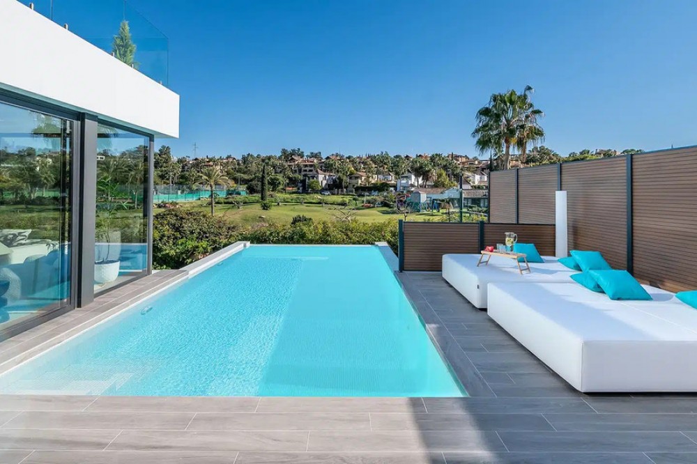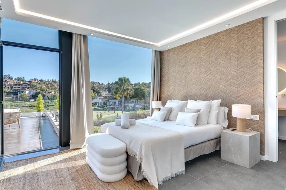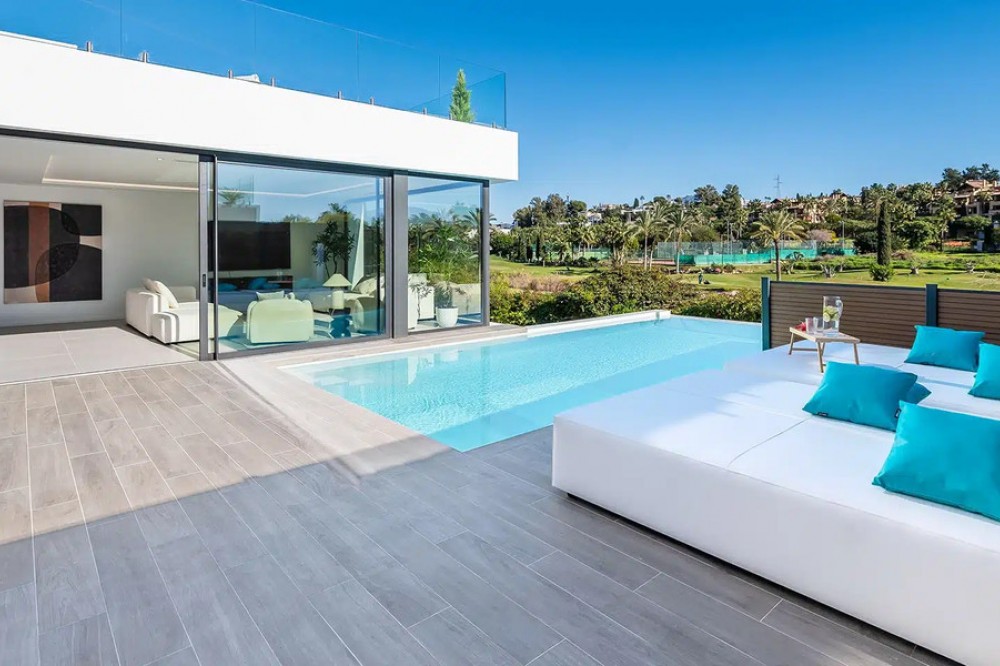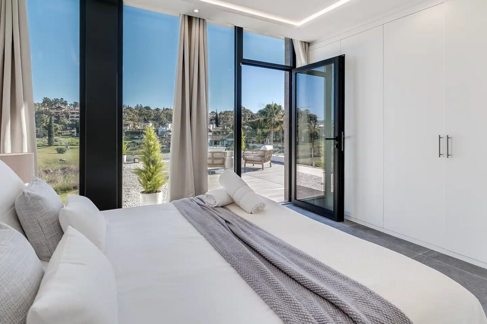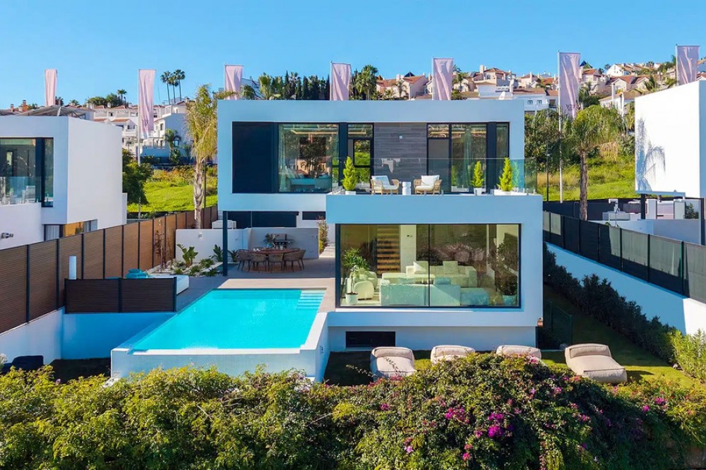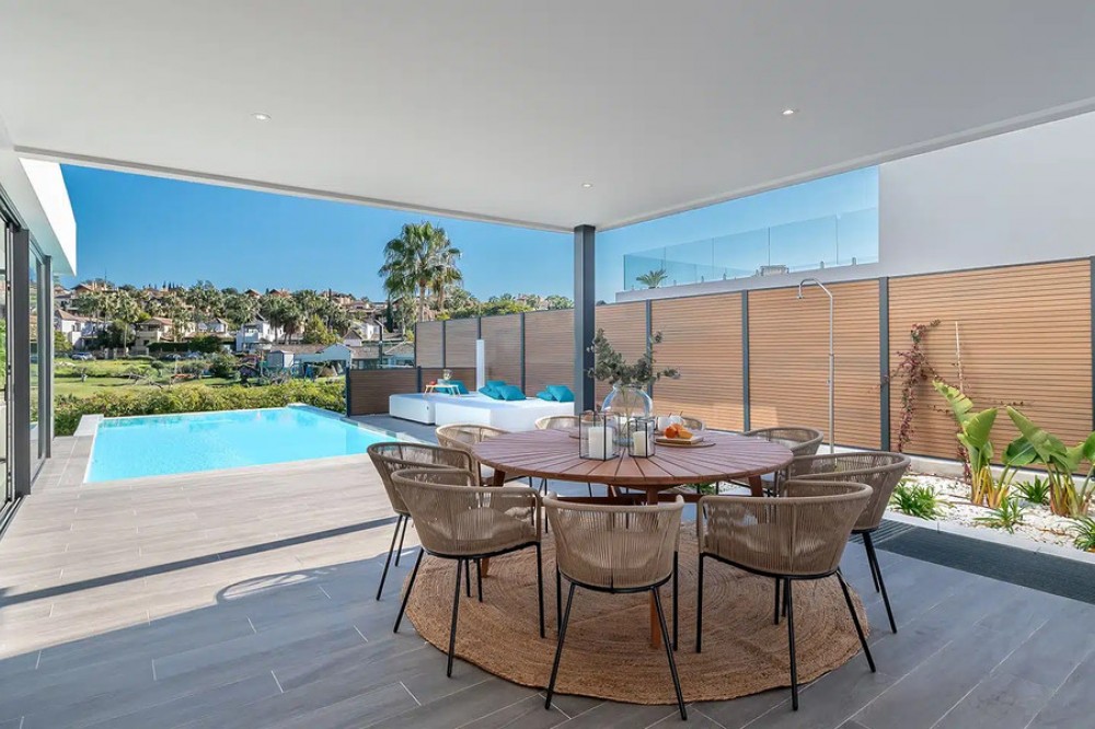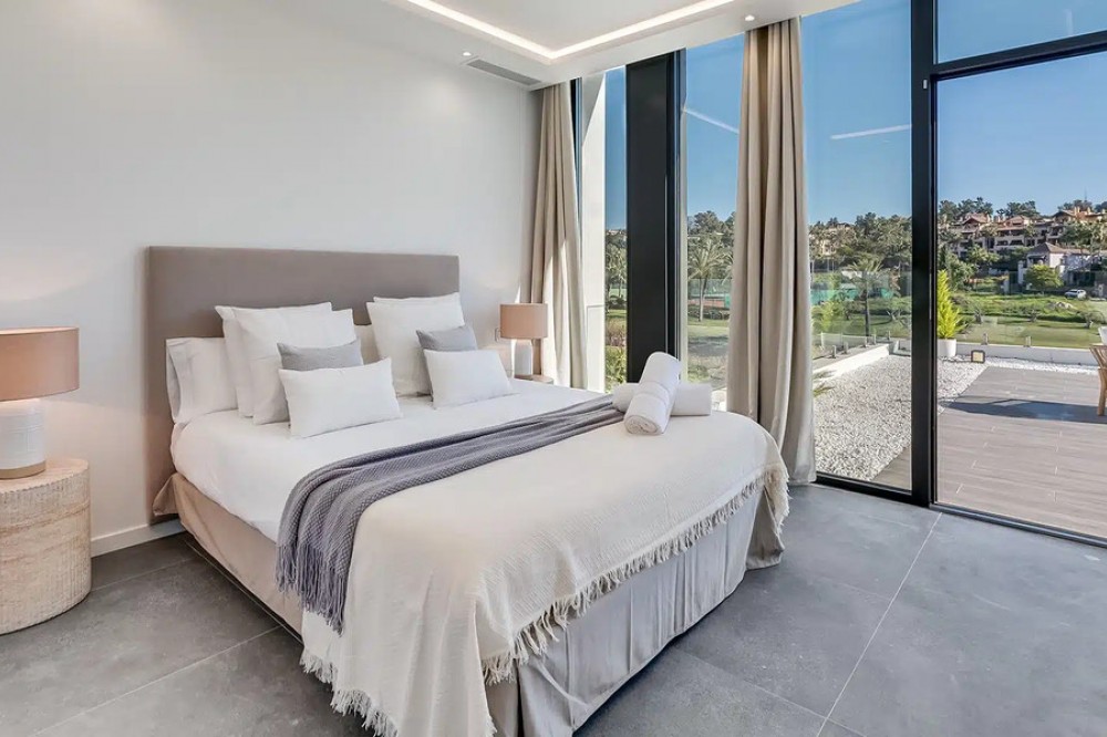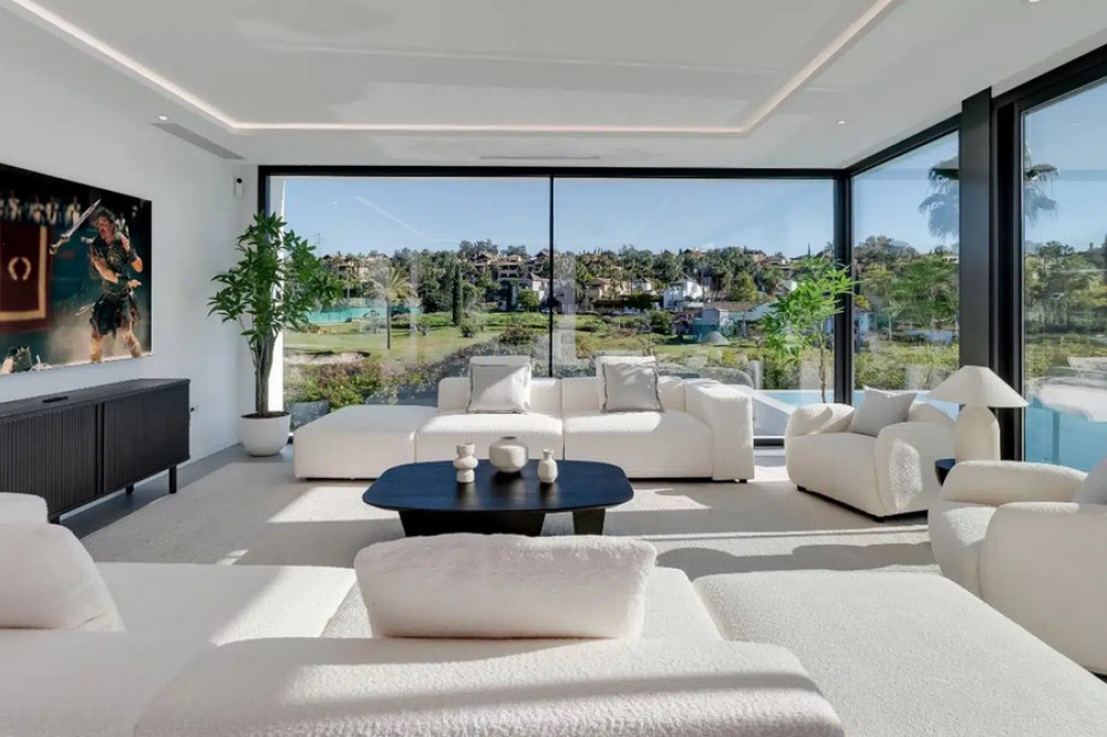 - This is a brand new, Scandinavian-inspired home set front line to El Campanario Golf. Just minutes from Puerto Banús, the beach, and top golf courses, this modern villa offers five spacious bedrooms, four en suite bathrooms, and a guest toilet. The open plan living area leads directly to a landscaped garden, a heated infinity pool, and an outdoor dining area with a built-in BBQ. Designed for comfort and style, this stunning home features two master suites with private terraces and walk-in wardrobes. The lower level is made for entertaining with a private cinema, games area, gym, and extra bedrooms for guests. Every detail has been created for easy living and relaxed luxury. Set on a 518 m² plot with a private garage and panoramic golf views, this residence offers a calm retreat close to everything. With year-round sunshine and easy access to Marbella and Estepona, this villa is perfect for those seeking modern design, prime location, and a high-end lifestyle on the Costa del Sol.