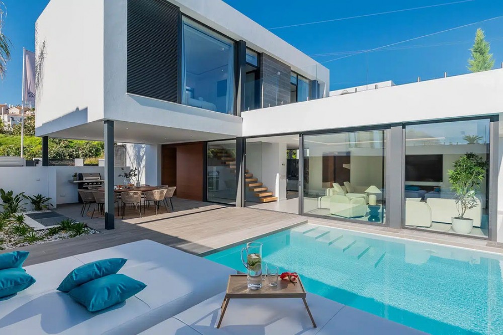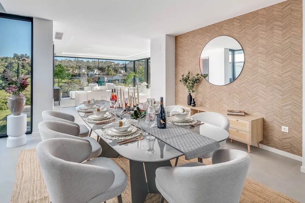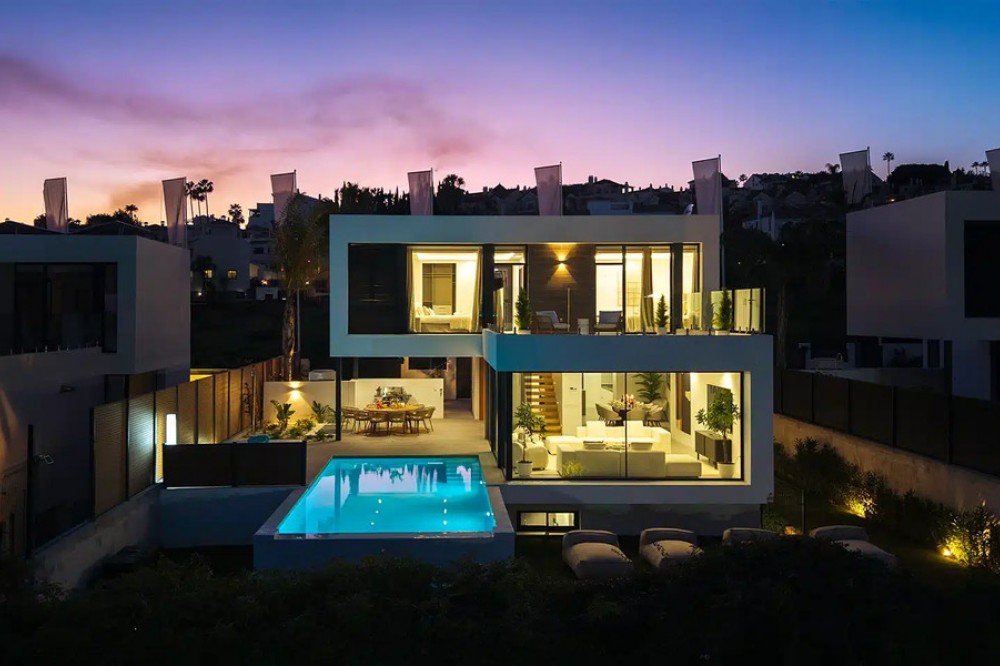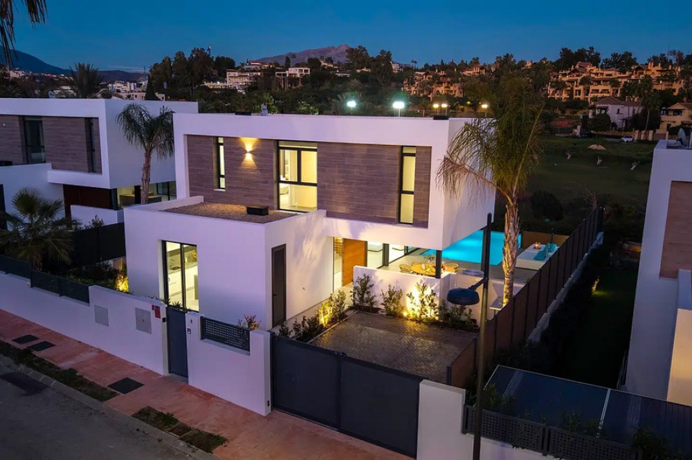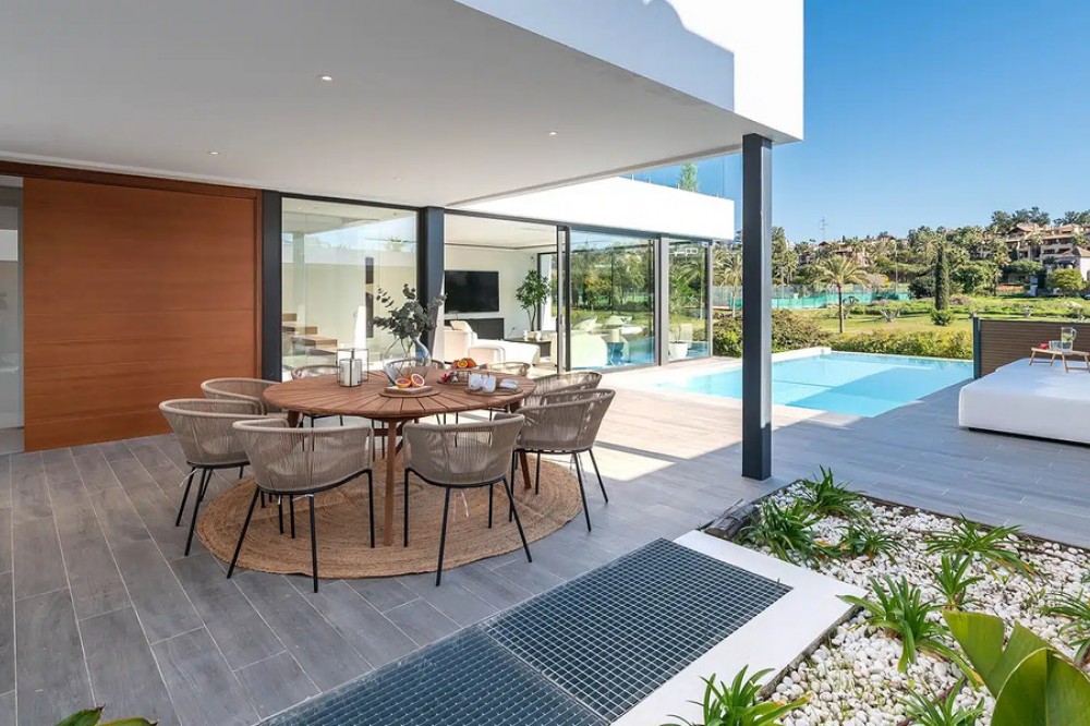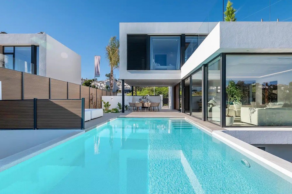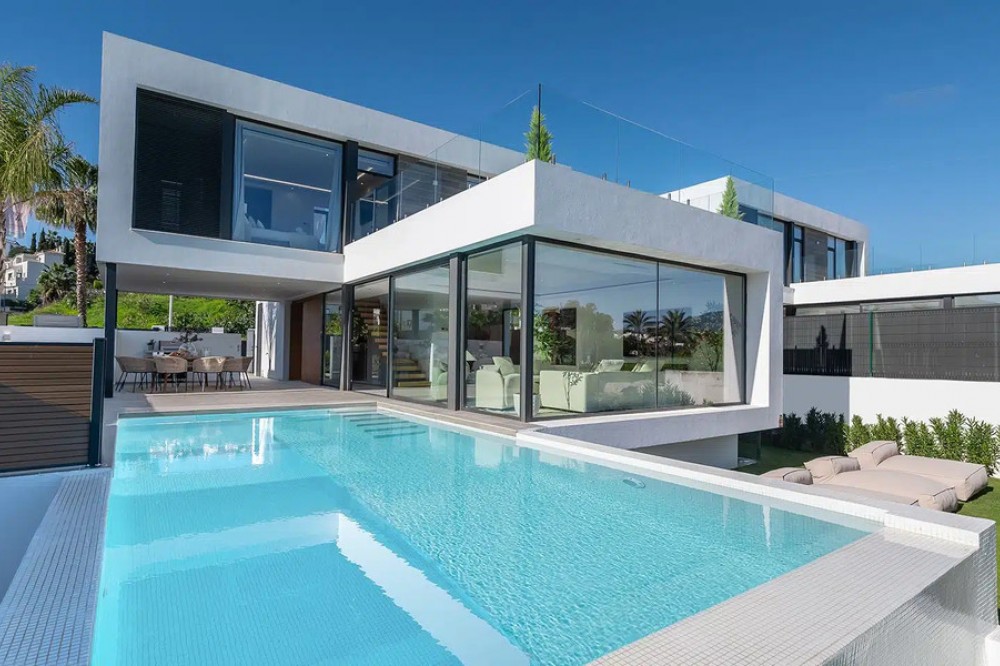 - This is a brand new, Scandinavian-inspired home set front line to El Campanario Golf. Just minutes from Puerto Banús, the beach, and top golf courses, this modern villa offers five spacious bedrooms, four en suite bathrooms, and a guest toilet. The open plan living area leads directly to a landscaped garden, a heated infinity pool, and an outdoor dining area with a built-in BBQ. Designed for comfort and style, this stunning home features two master suites with private terraces and walk-in wardrobes. The lower level is made for entertaining with a private cinema, games area, gym, and extra bedrooms for guests. Every detail has been created for easy living and relaxed luxury. Set on a 518 m² plot with a private garage and panoramic golf views, this residence offers a calm retreat close to everything. With year-round sunshine and easy access to Marbella and Estepona, this villa is perfect for those seeking modern design, prime location, and a high-end lifestyle on the Costa del Sol.