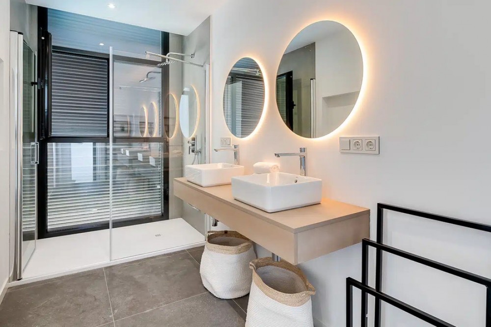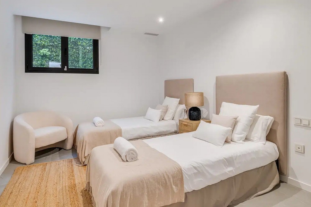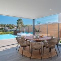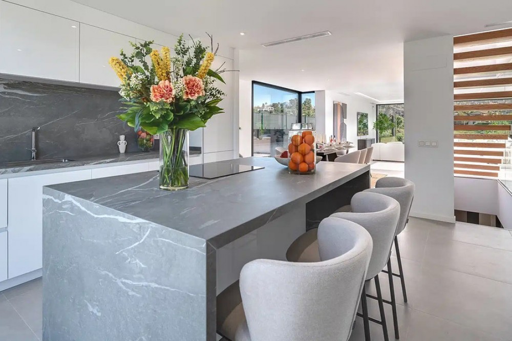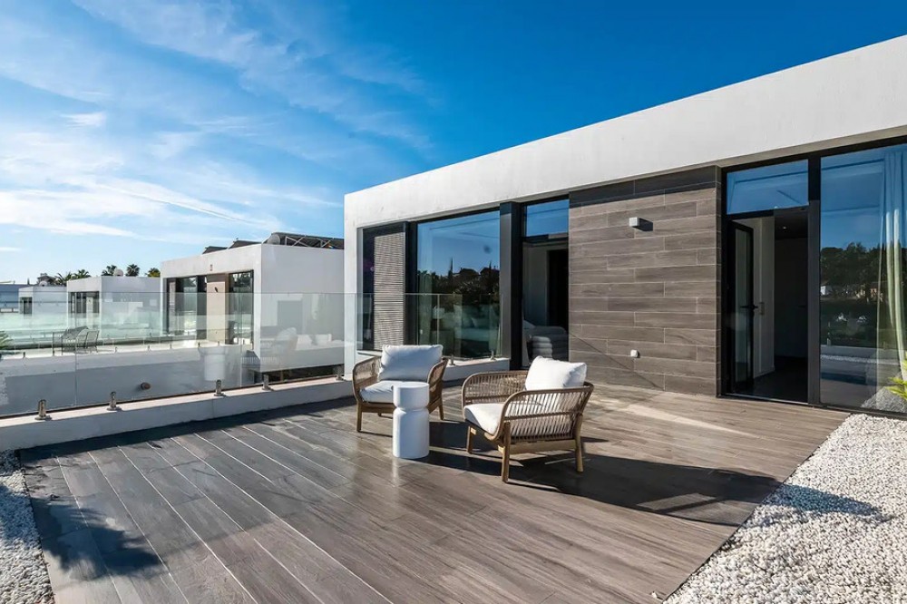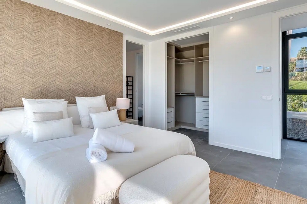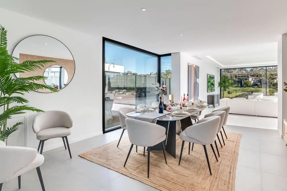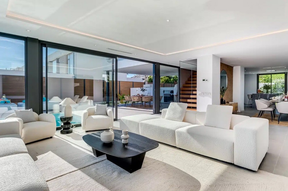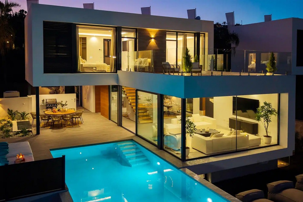 - This is a brand new, Scandinavian-inspired home set front line to El Campanario Golf. Just minutes from Puerto Banús, the beach, and top golf courses, this modern villa offers five spacious bedrooms, four en suite bathrooms, and a guest toilet. The open plan living area leads directly to a landscaped garden, a heated infinity pool, and an outdoor dining area with a built-in BBQ. Designed for comfort and style, this stunning home features two master suites with private terraces and walk-in wardrobes. The lower level is made for entertaining with a private cinema, games area, gym, and extra bedrooms for guests. Every detail has been created for easy living and relaxed luxury. Set on a 518 m² plot with a private garage and panoramic golf views, this residence offers a calm retreat close to everything. With year-round sunshine and easy access to Marbella and Estepona, this villa is perfect for those seeking modern design, prime location, and a high-end lifestyle on the Costa del Sol.