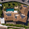 - Stunning luxury villa boasting impressive panoramic views of the sea and the Bay of Malaga. Set in a tranquil location just five minutes from the beaches of El Palo, this residence enjoys a southwest orientation, spectacular terraces and outdoor areas overlooking both the sea and the mountains, and a convenient contemporary layout with high-quality finishes. Recently renovated, the villa is laid out over three levels. The ground floor includes four bedrooms and four bathrooms, three of them en suite. Another room, currently used as an office, is located next to a bathroom. The primary suite occupies the entire first floor, featuring a walk-in wardrobe and a private terrace with panoramic sea views. On the lower level, a self-contained studio offers independent accommodation for guests or staff, complete with a kitchenette and its own private entrance. The interiors are bright and refined, featuring marble floors, a fireplace, and a fully fitted kitchen. Air conditioning and solar panels provide comfort and efficiency throughout the year. Outside, the villa extends onto manicured gardens and a saltwater swimming pool bordered by sun terraces. A pergola with an outdoor barbecue area provides an inviting spot for dining or relaxing while taking in the views and sunset. The garden layout ensures both beauty and privacy, creating a seamless connection between the home and its natural surroundings. A spacious covered carport provides parking for three vehicles. Situated close to the beach, golf courses, and the centre of Malaga, the property also enjoys easy access to a wide range of amenities, including international schools, health centres, shops, restaurants, sports facilities, and leisure options.